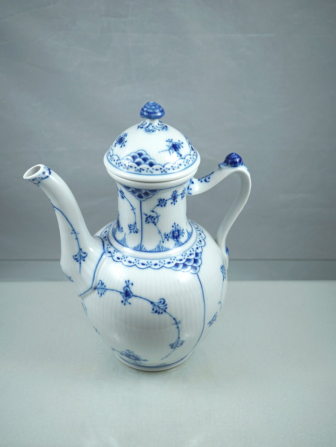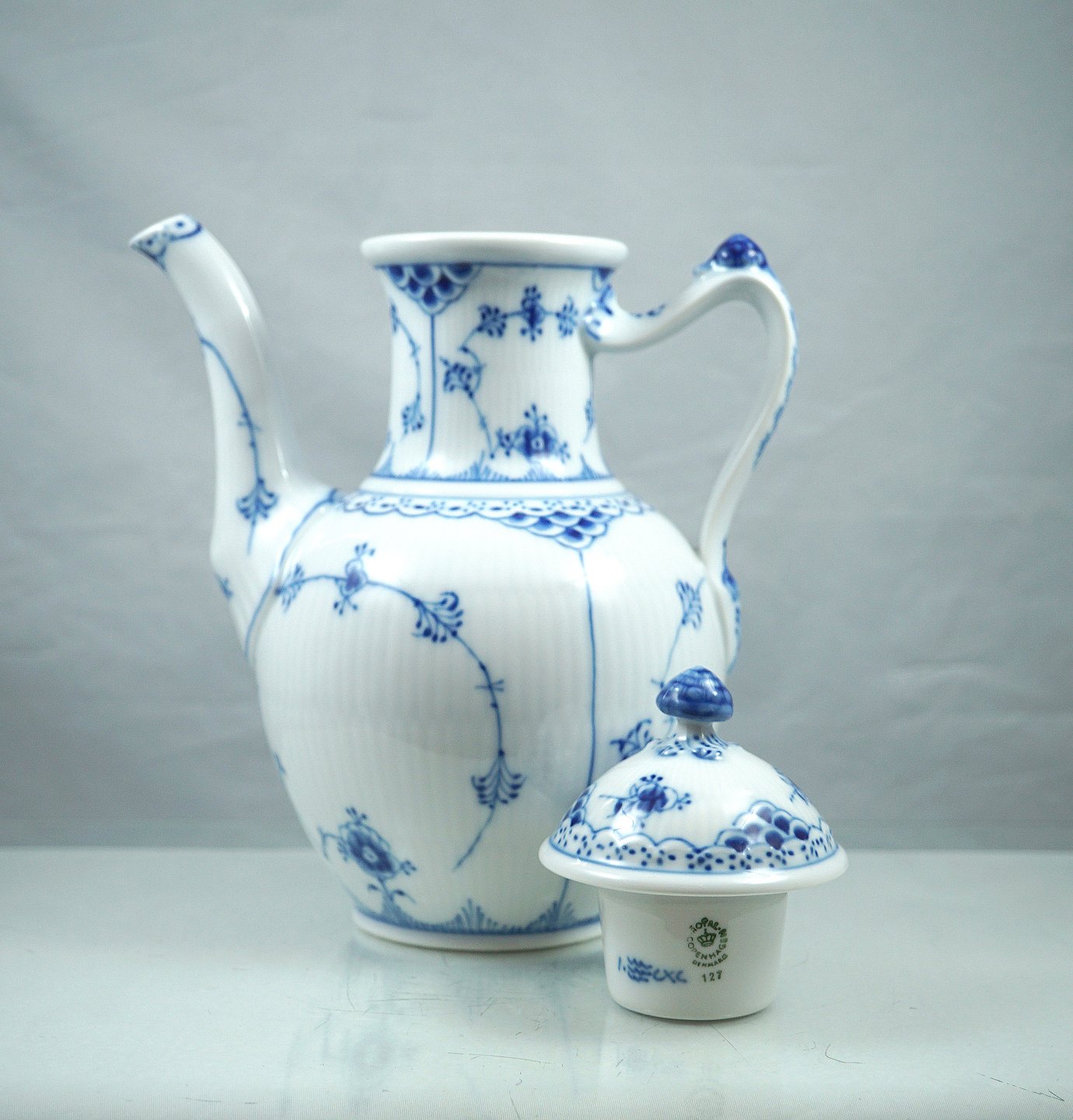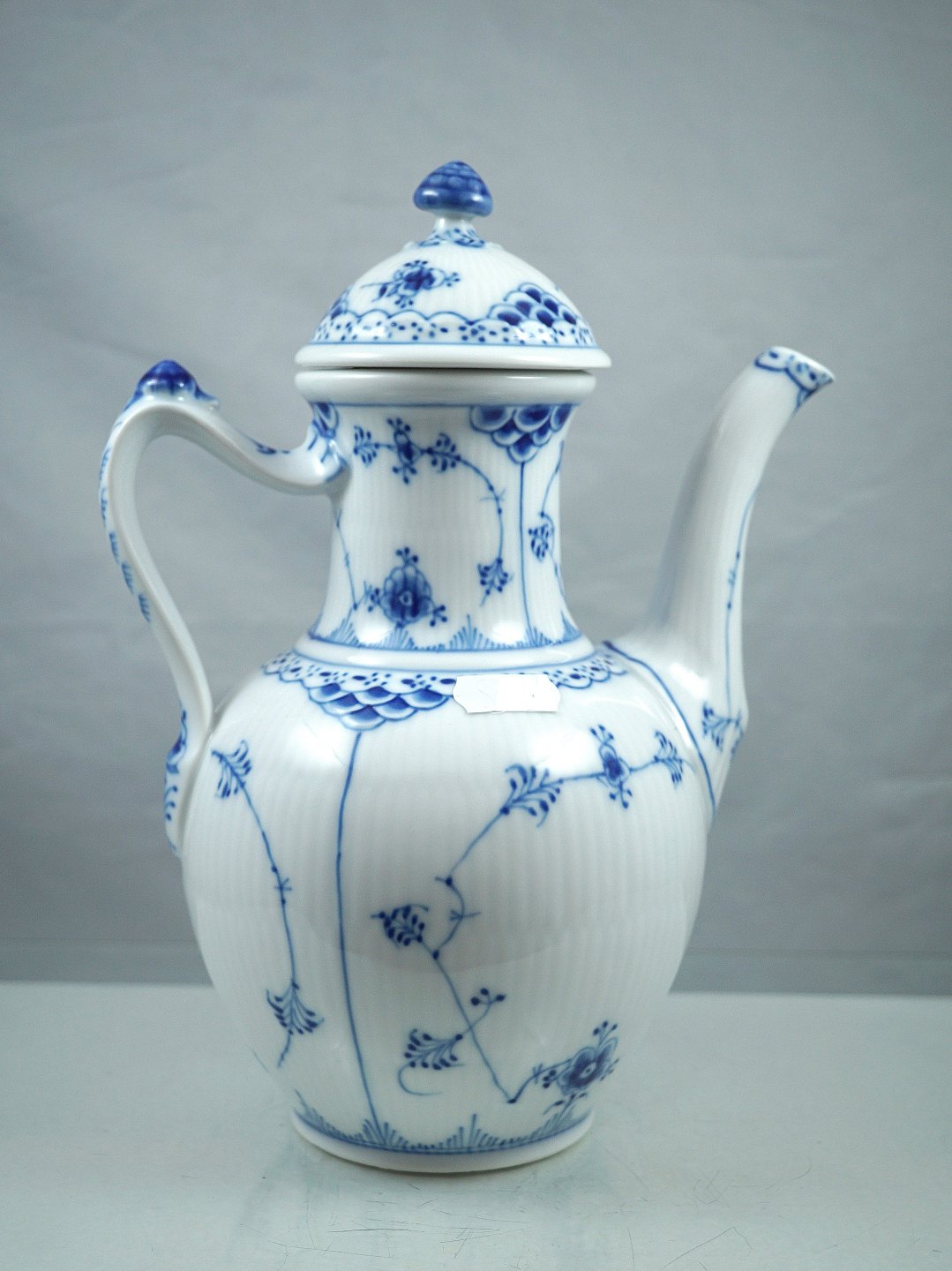 Royal Copenhagen. Musselmalet riflet kaffekande nr. 128 + låg nr.127