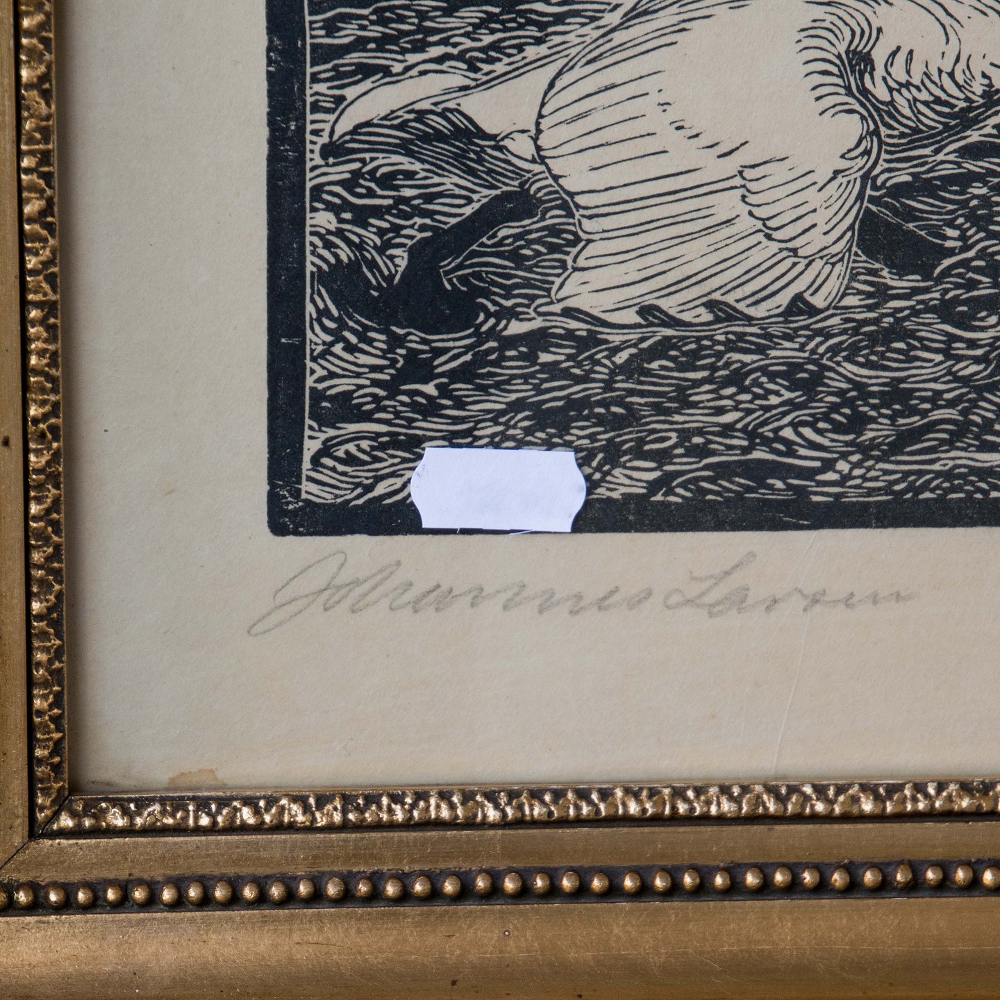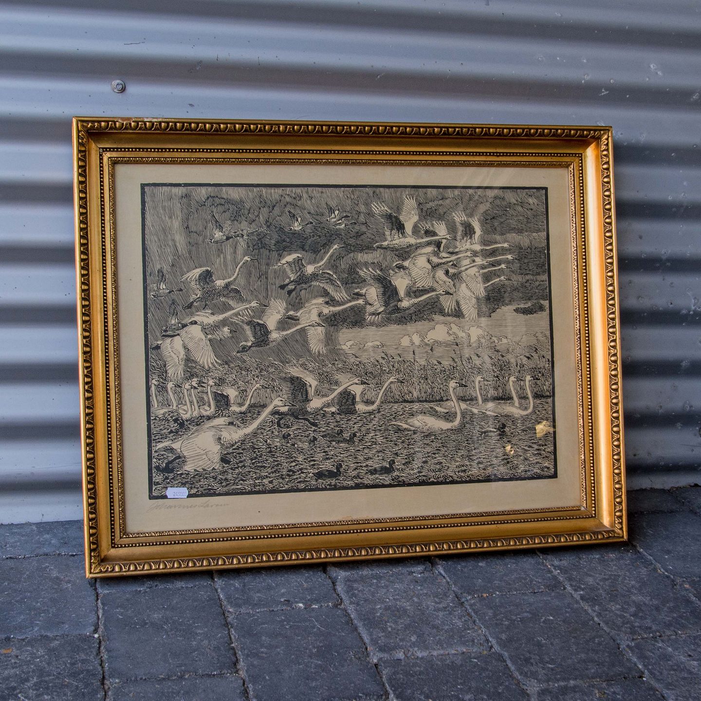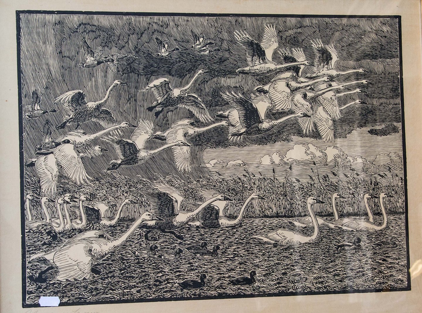 Tryk af svaner på resteplads. Bogtryk i glas og ramme.