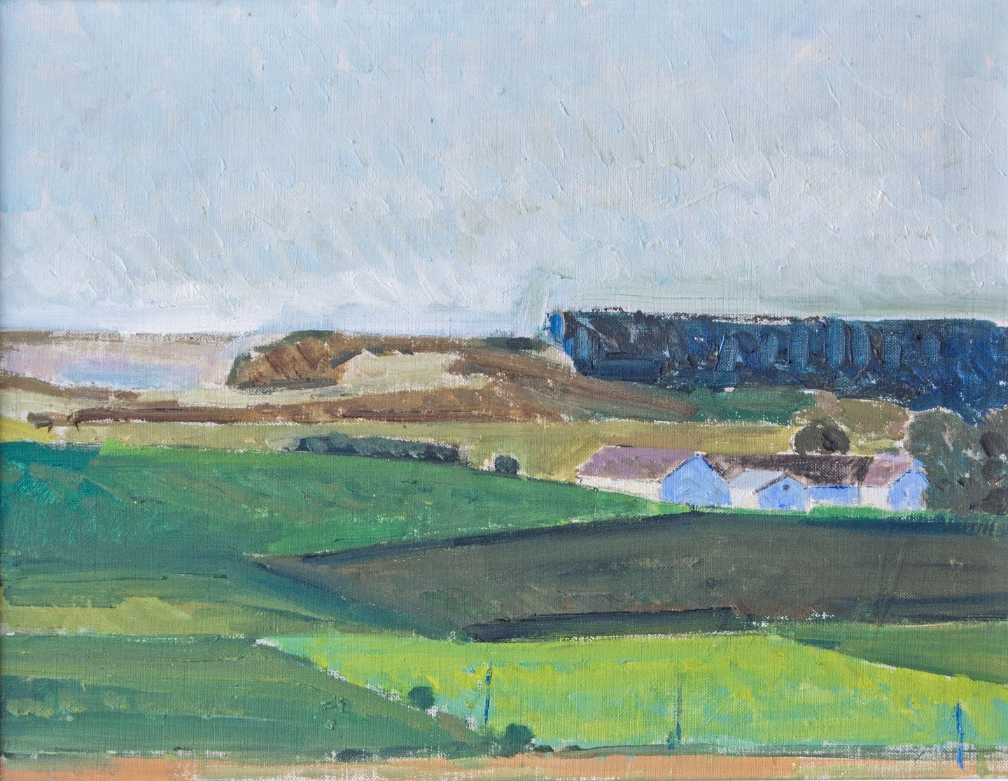 Naturmaleri med motiv af huse sat blandt marker