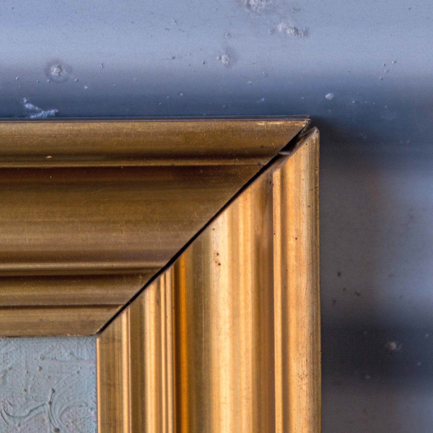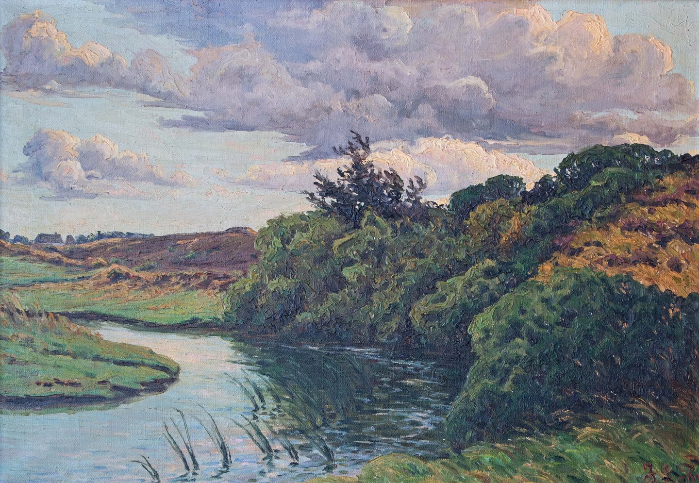 Landskabmaleri med motiv af sø omgivet af træer og marker