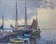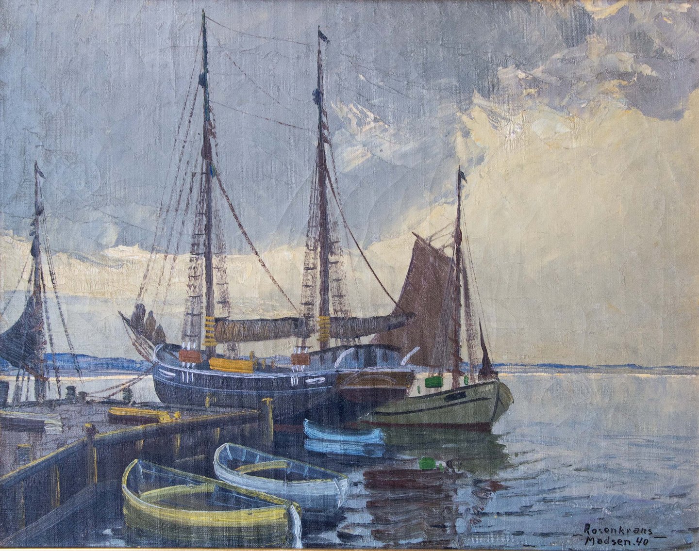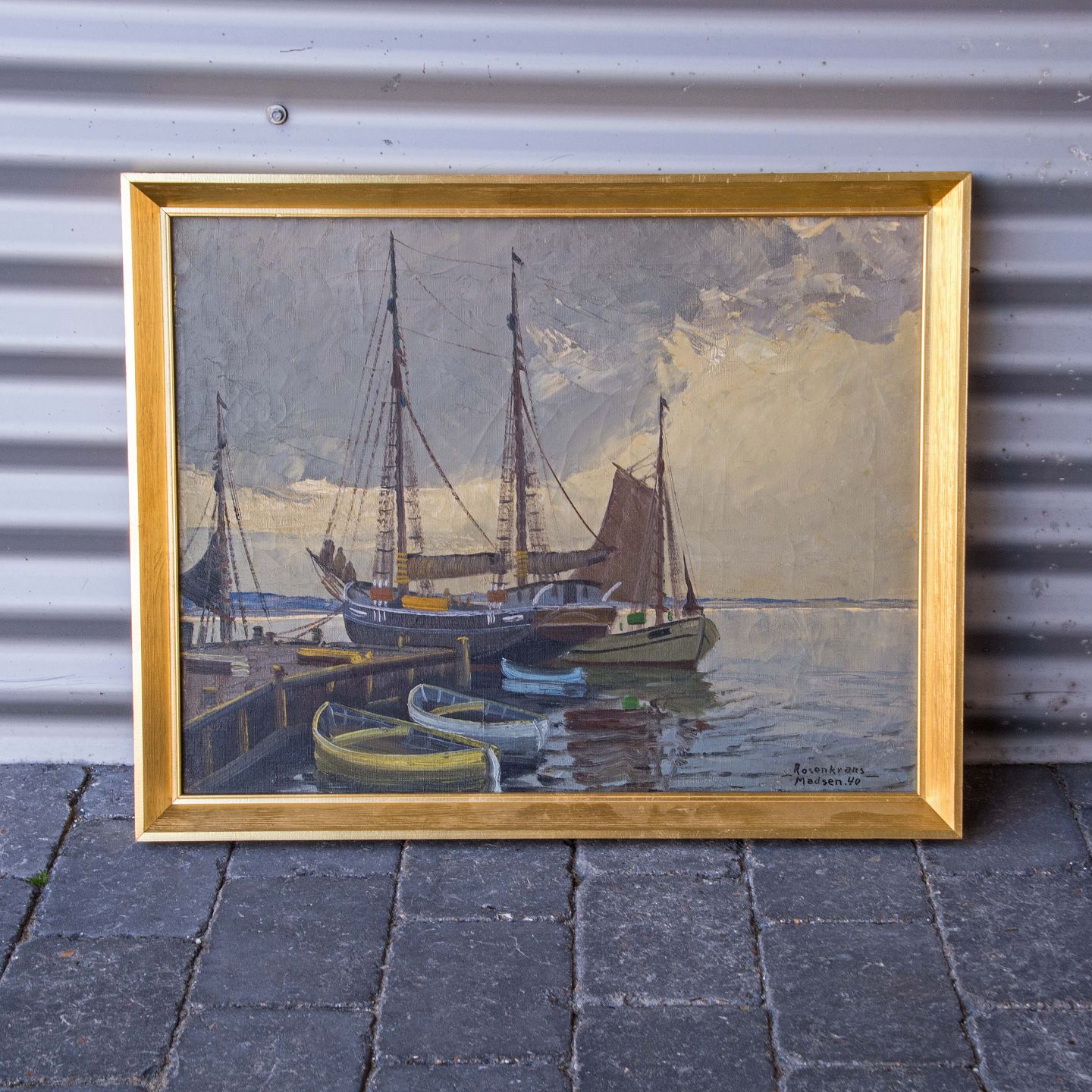 Skibsmaleri med motiv træbåde ved havn, 1940