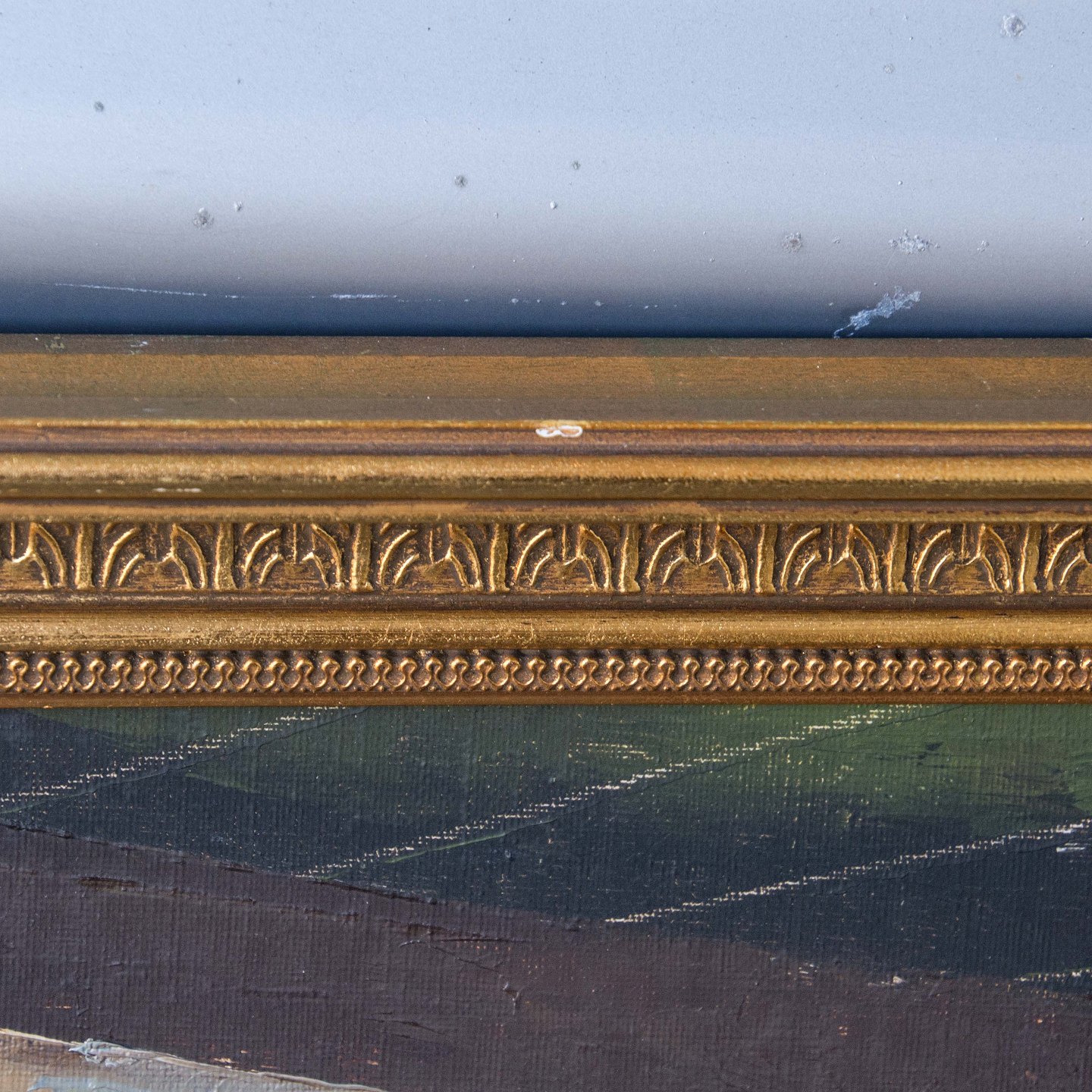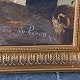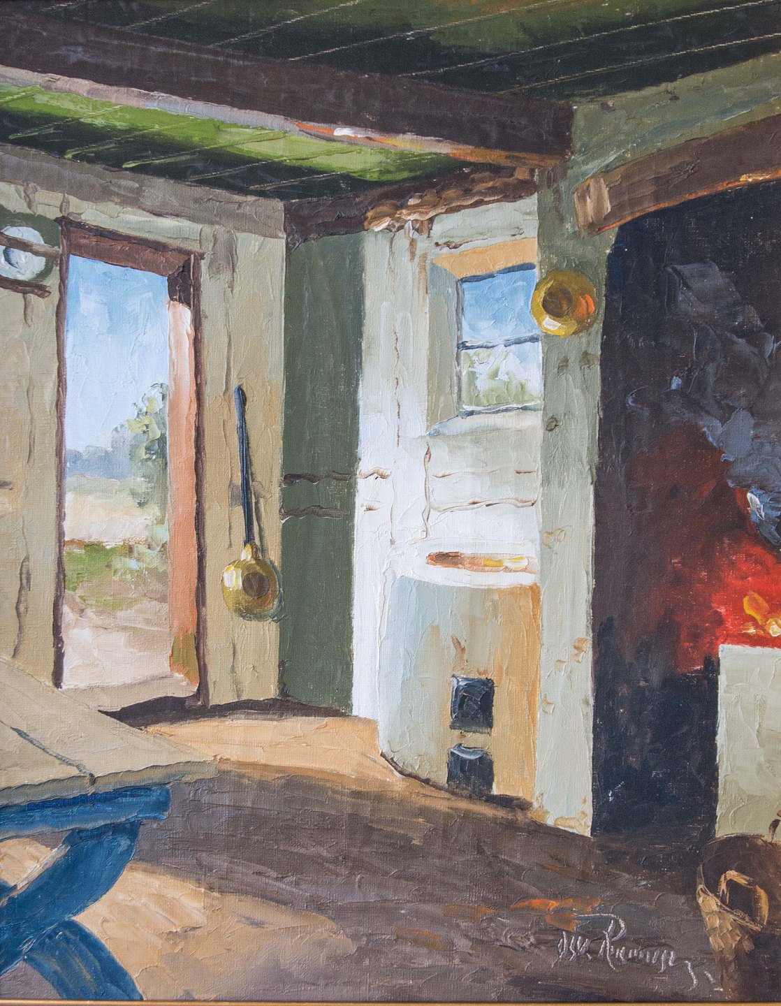 Interiør maleri med motiv af bondekøkken med udsigt til marker