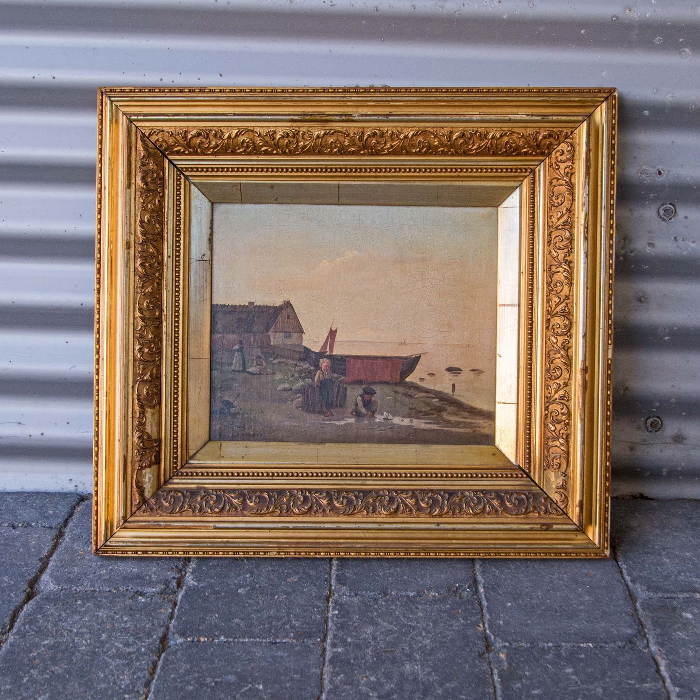 Kunstmaleri med motiv af fiskerleje med legende børn og kvinder