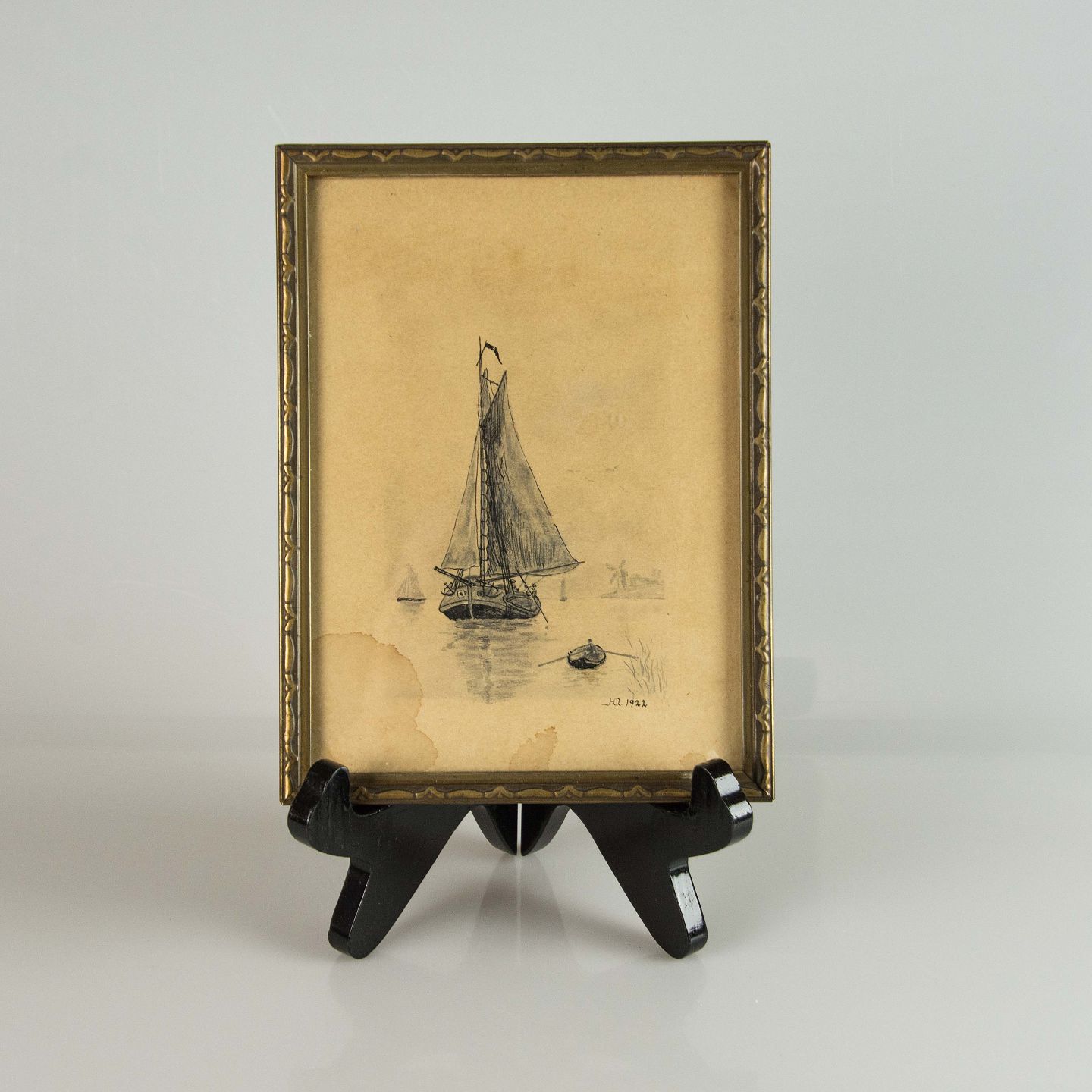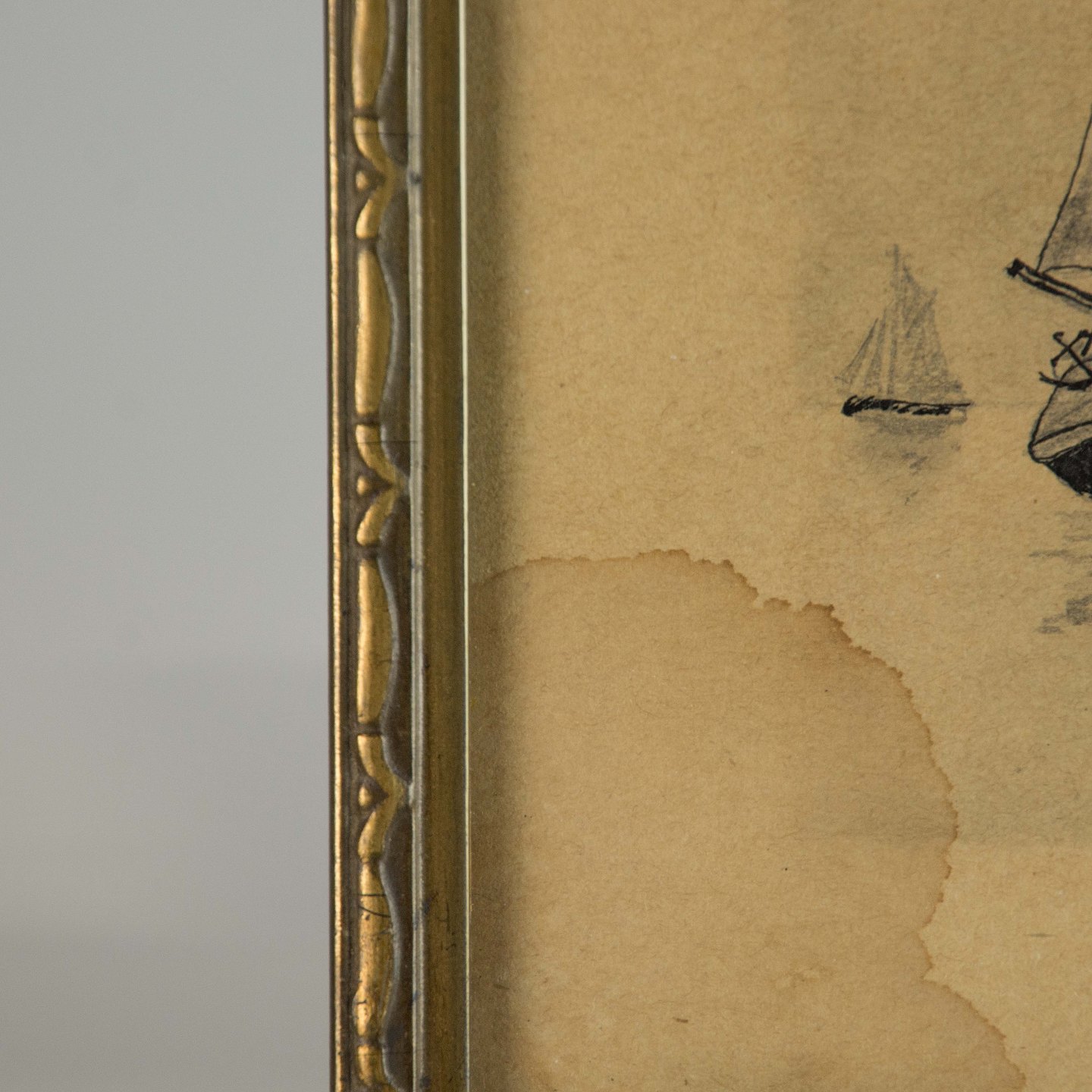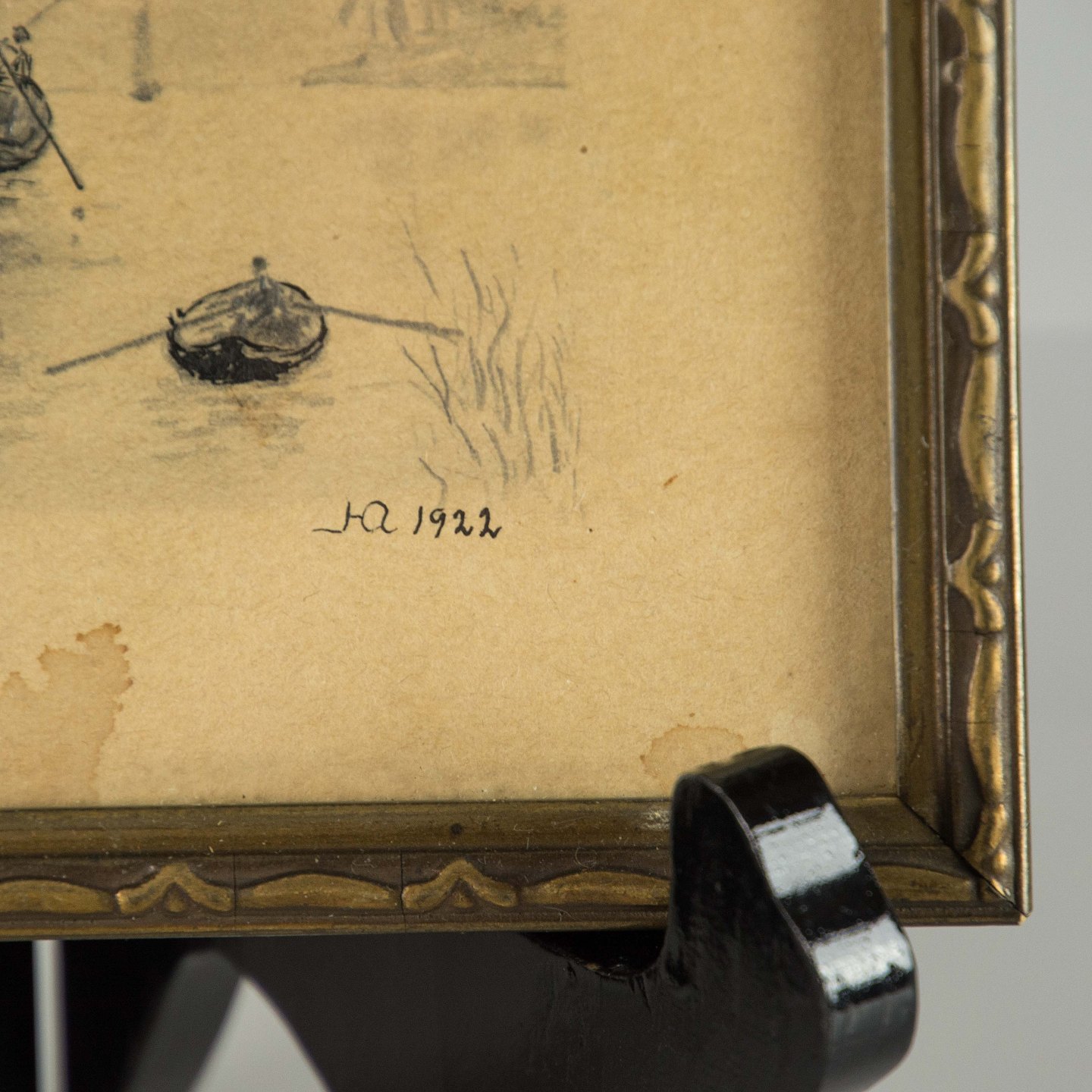 God stand med brugsspor på rammen og vandmærker i kant af billedet.