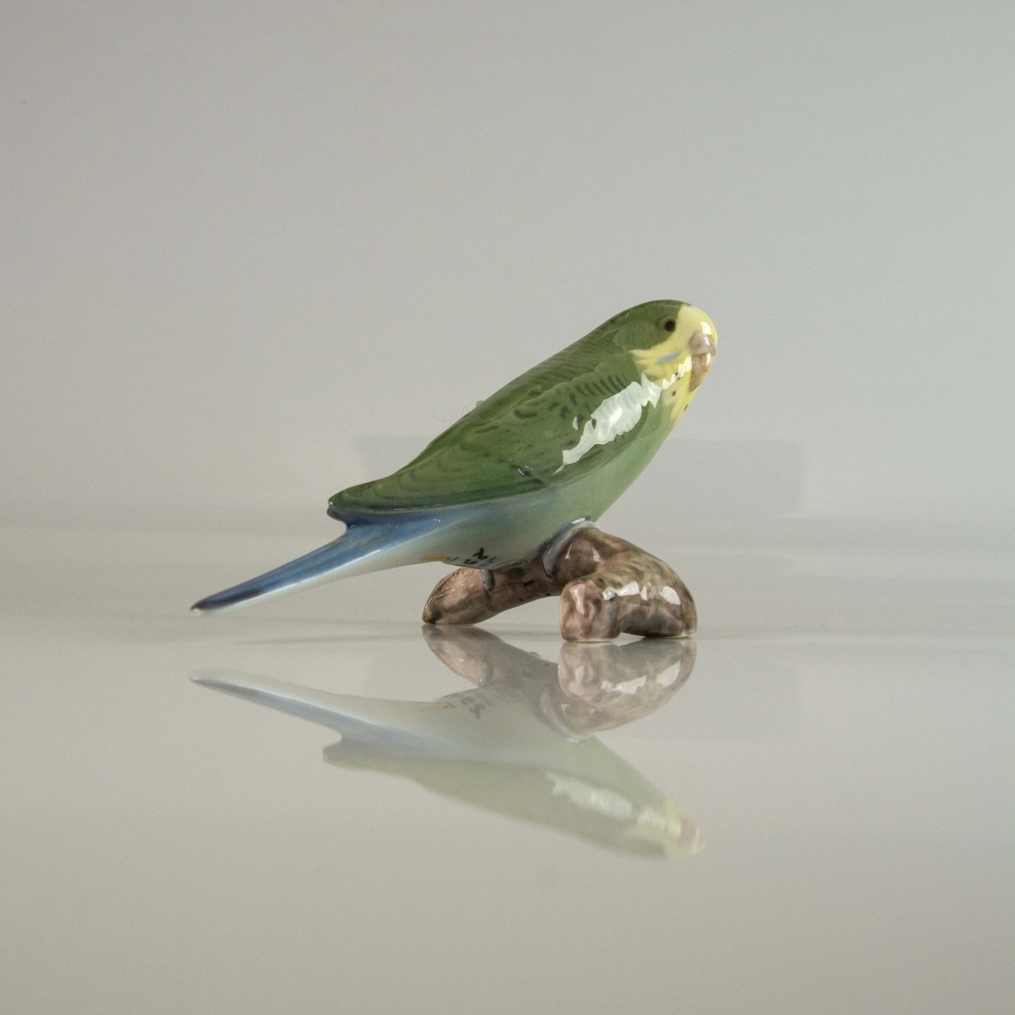 Figur i porcelæn med motiv af grøn undulat på gren nr. 2341