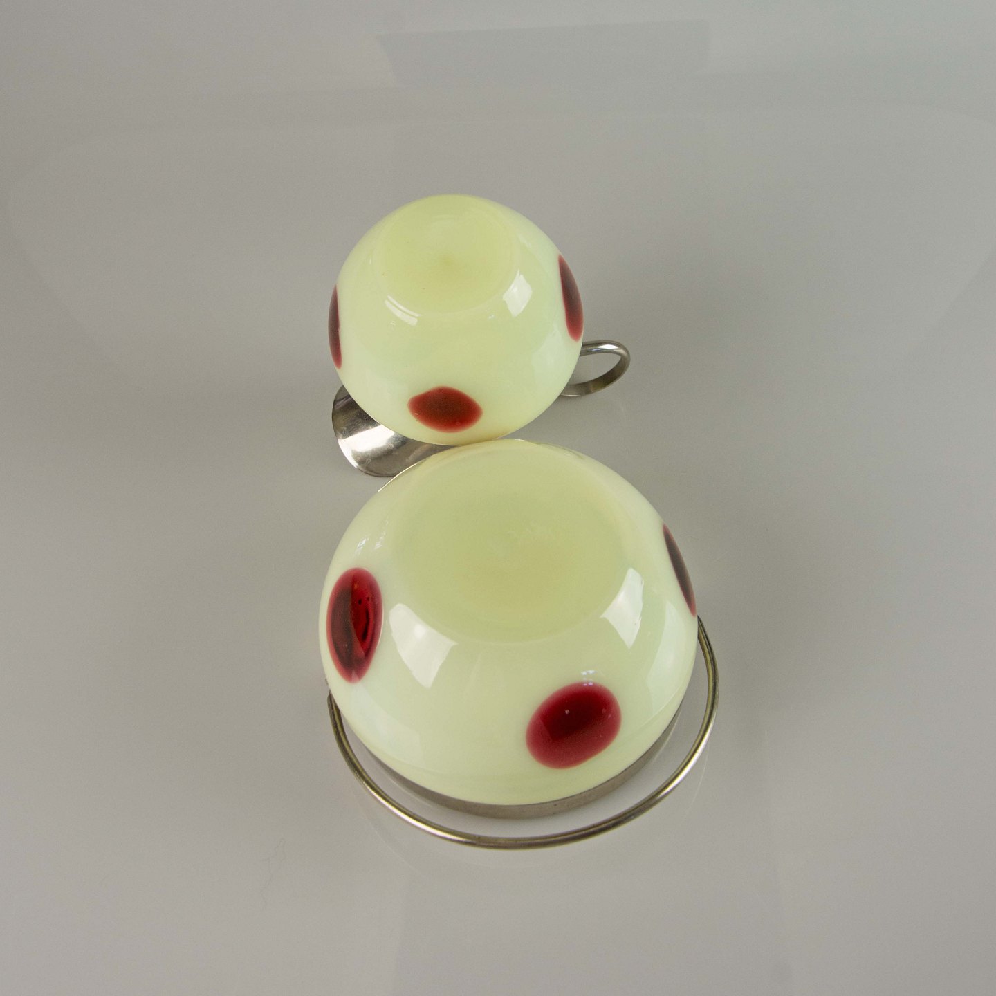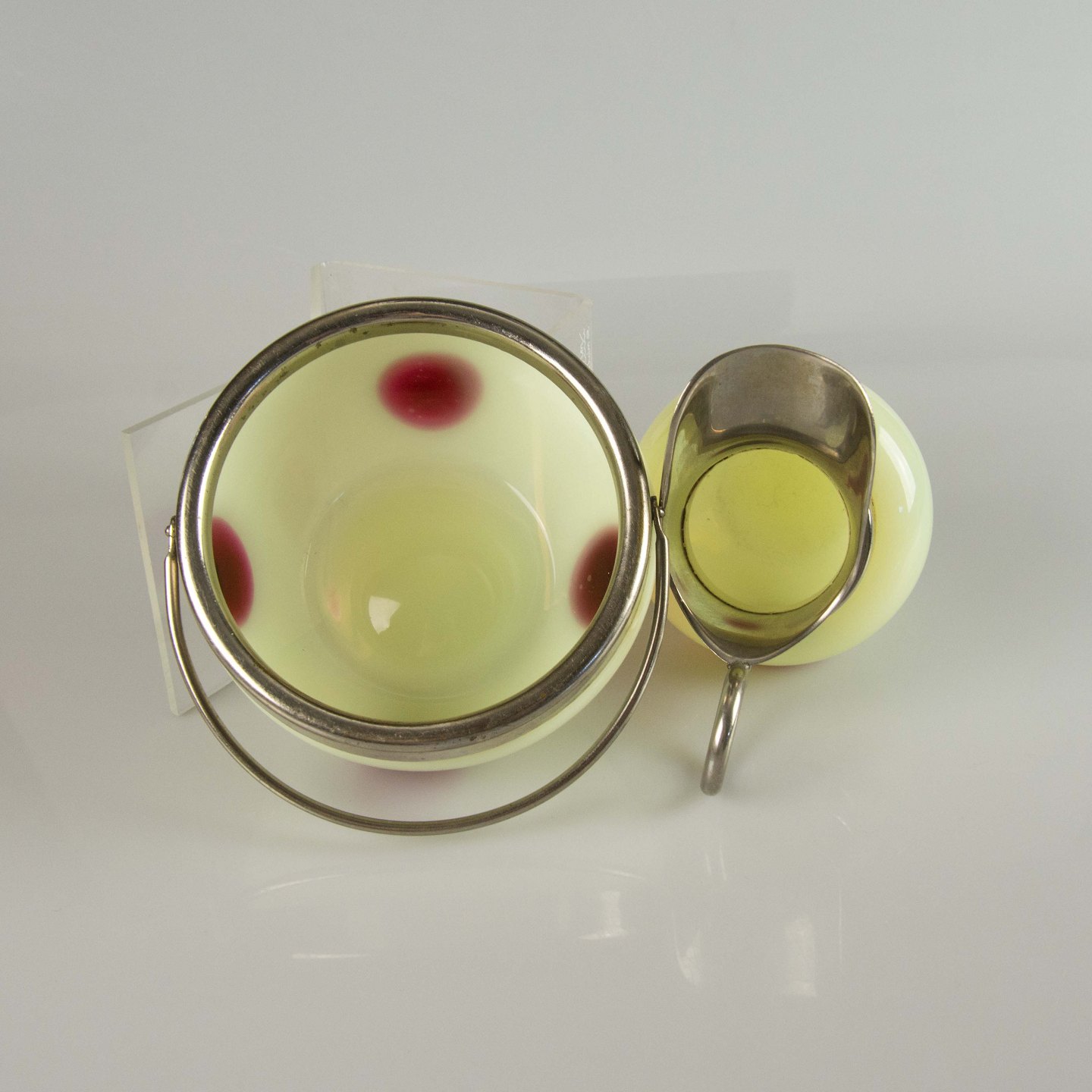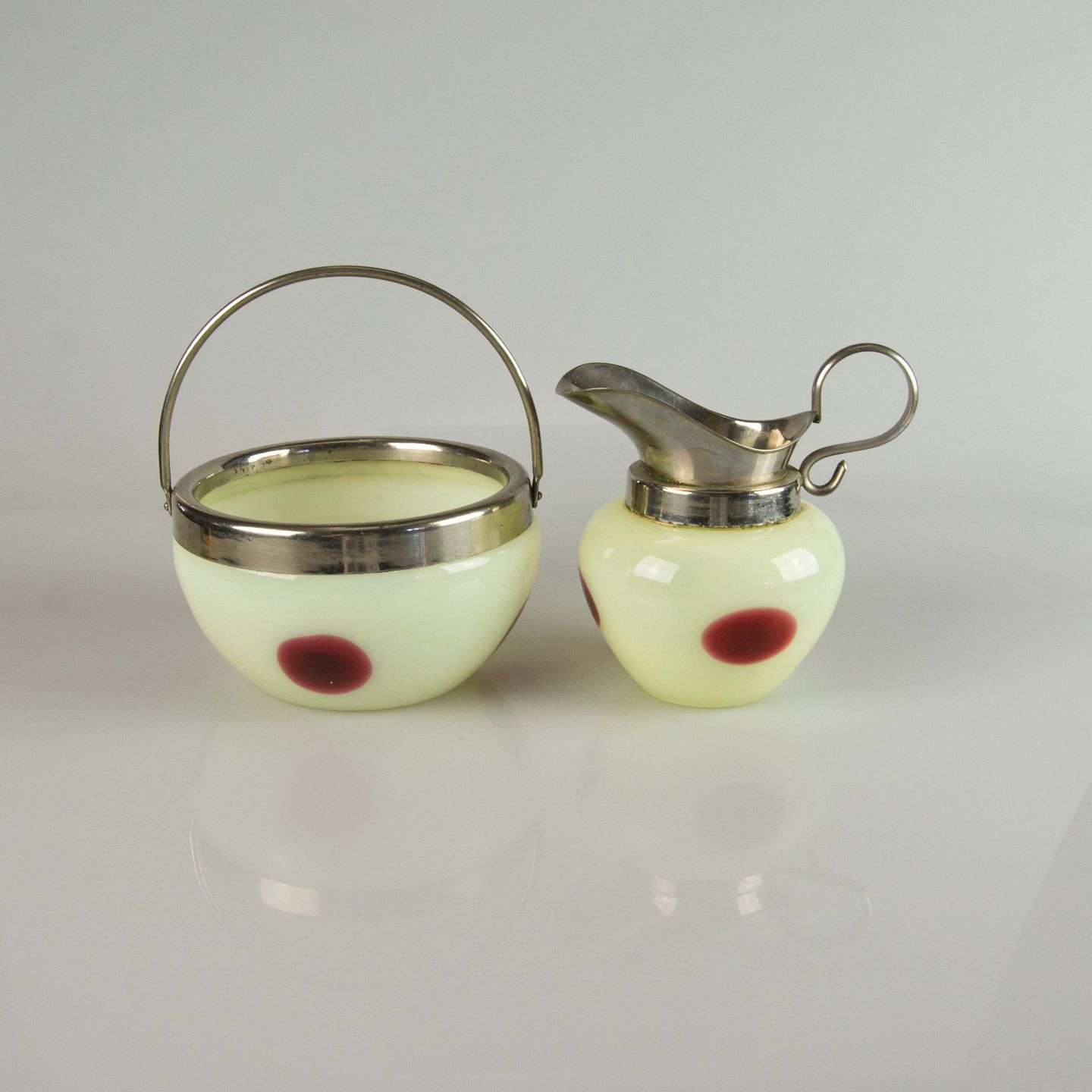 Sæt med sukkerskål og flødekande i glas og metal