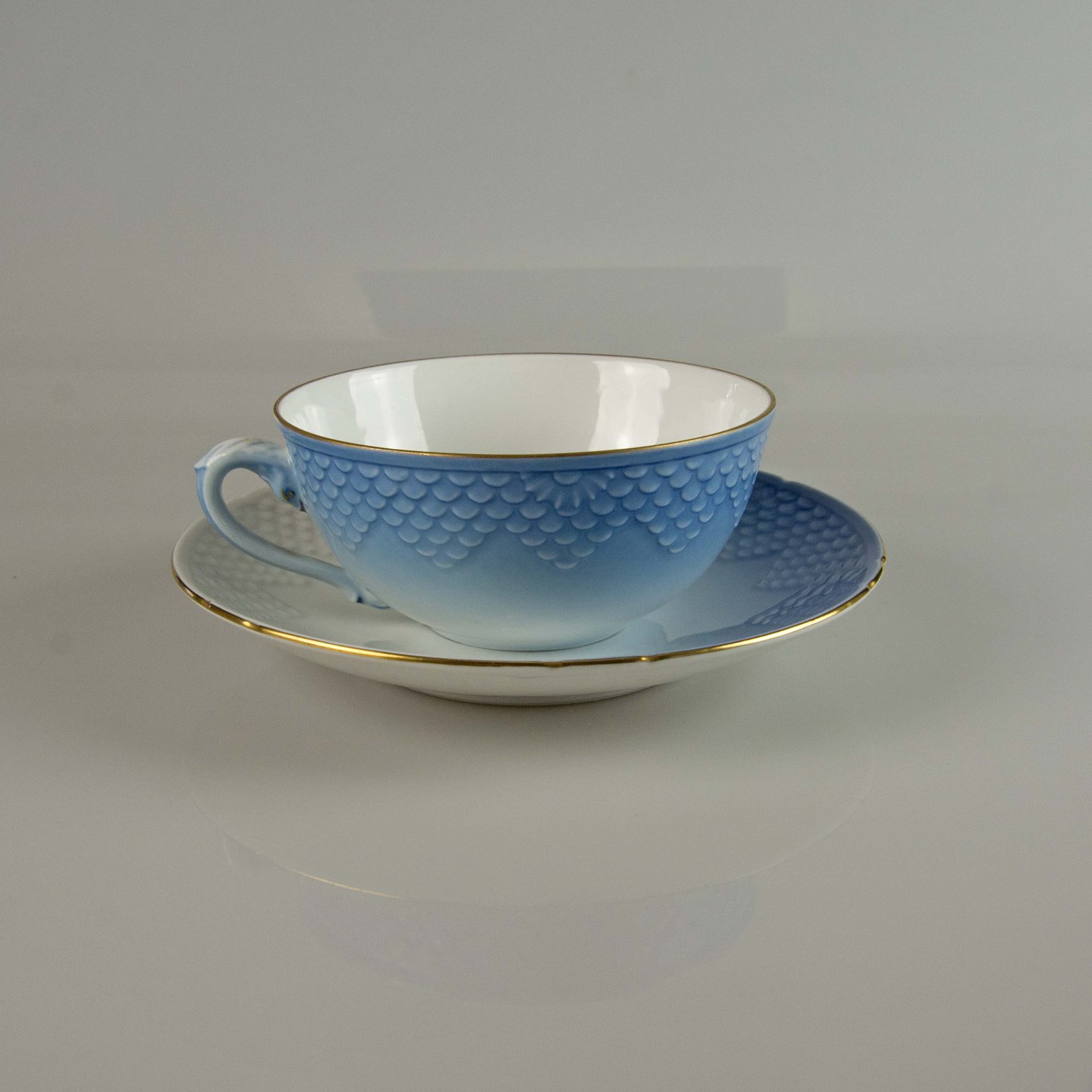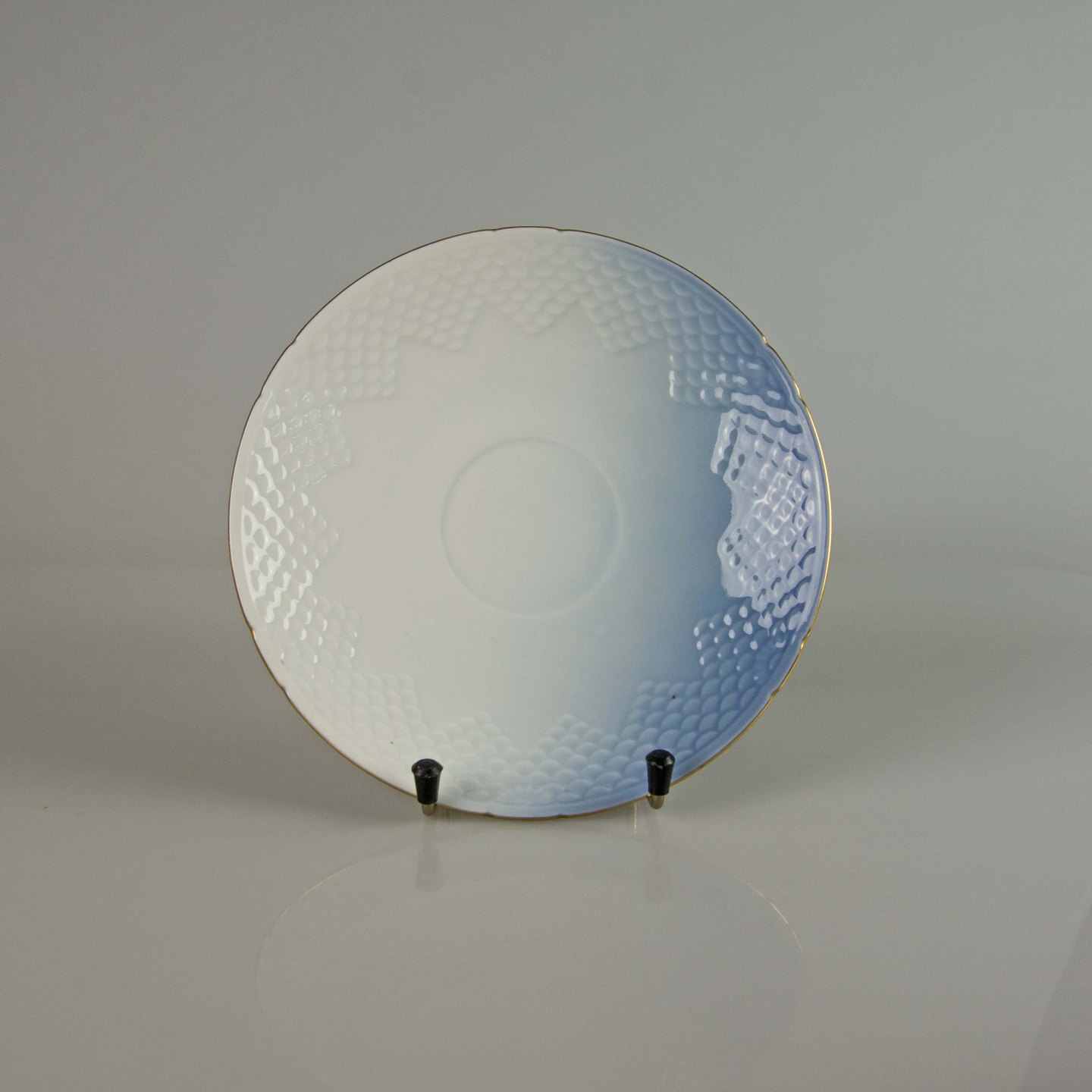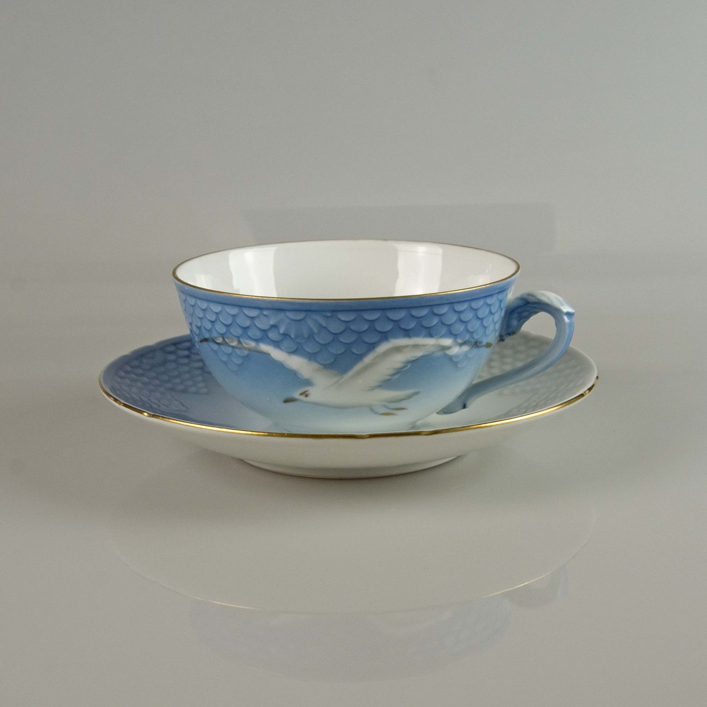 Stor kop i hvid og blå porcelæn med dekoration af flyvende måge.