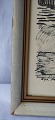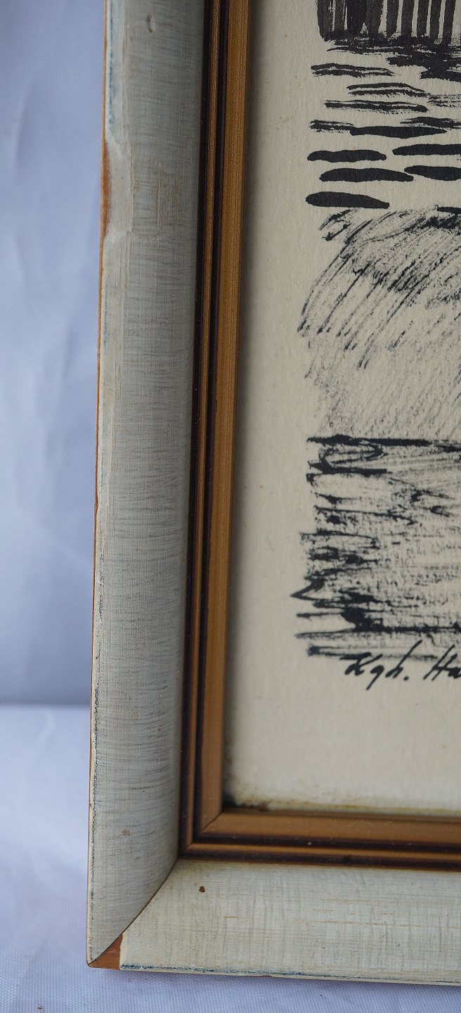 Indrammet tryk i hvidmalet træramme med motiv af huse i klitområde på grønland med teksten Kongelig Havn, Christianshåb