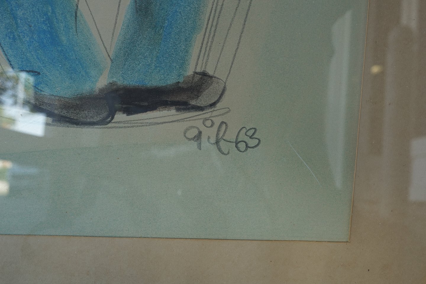 Tegning af Mand, set bagfra, med taske og stok. Signeret Gil 63, karikatur i glas og ramme