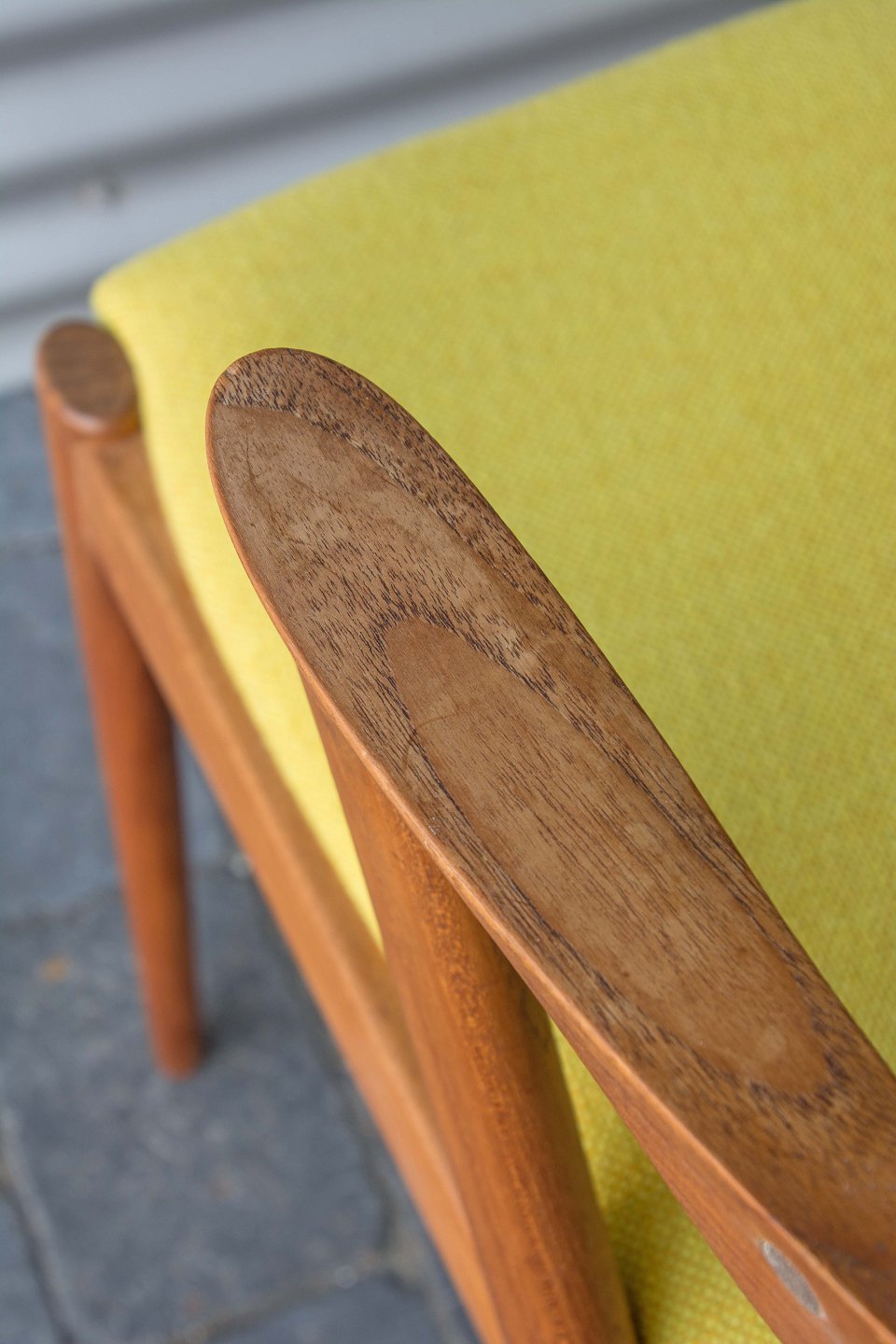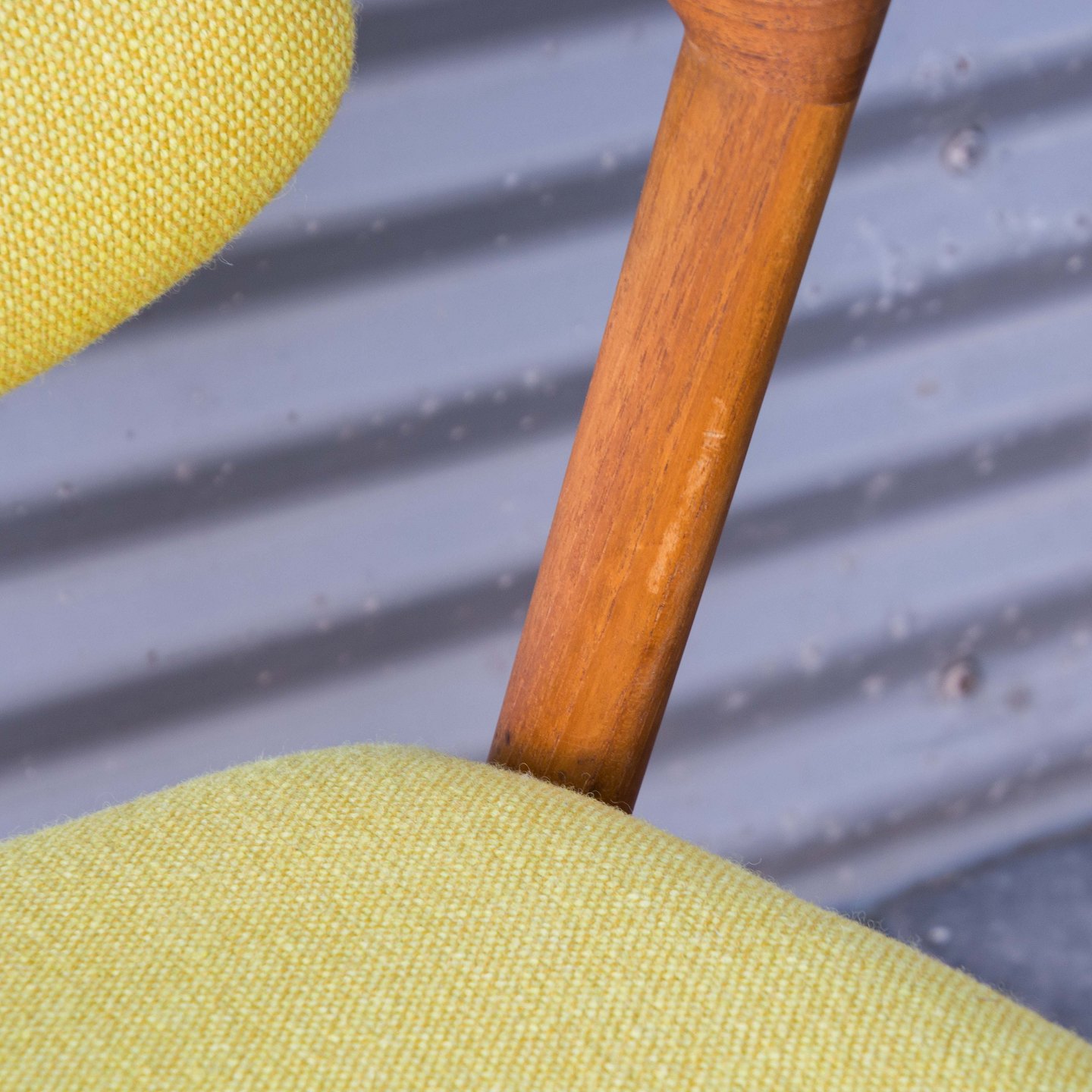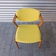 Sæde og ryg betrukket med gulmeleret uldstof.