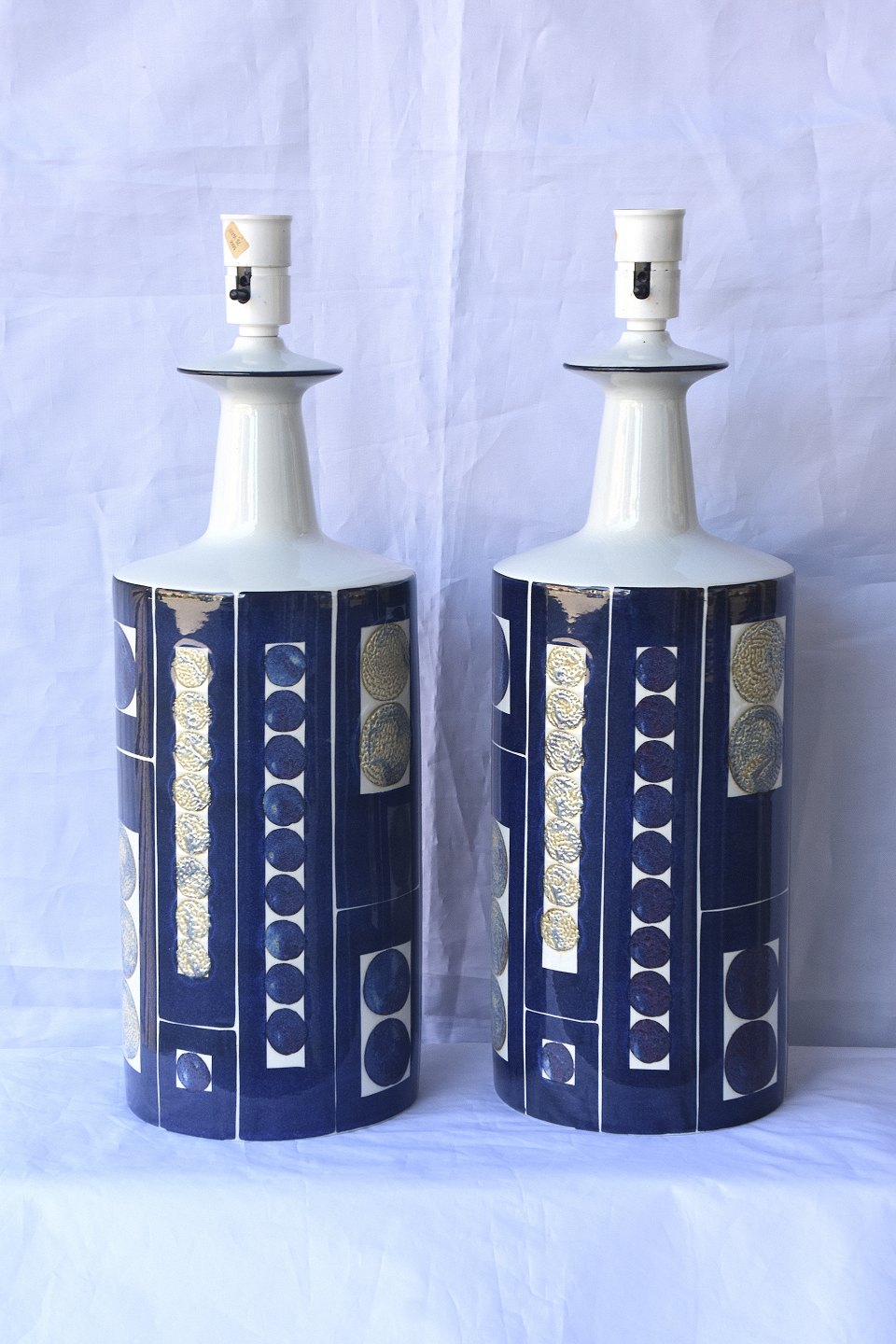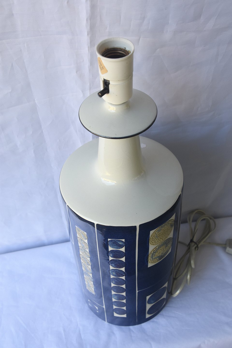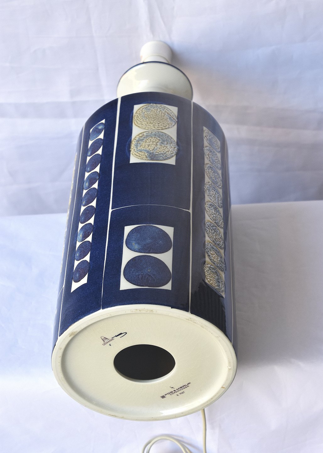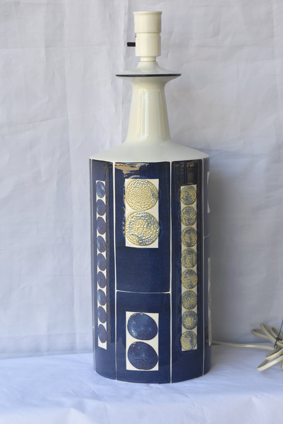 Aluminia Bordlampe E 7167, lavet for Fog & Mørup. Lampefoden er lavet af kunstfajance og blå med geometrisk mønster. Design Ingelise Kofoed for Fog & Mørup.