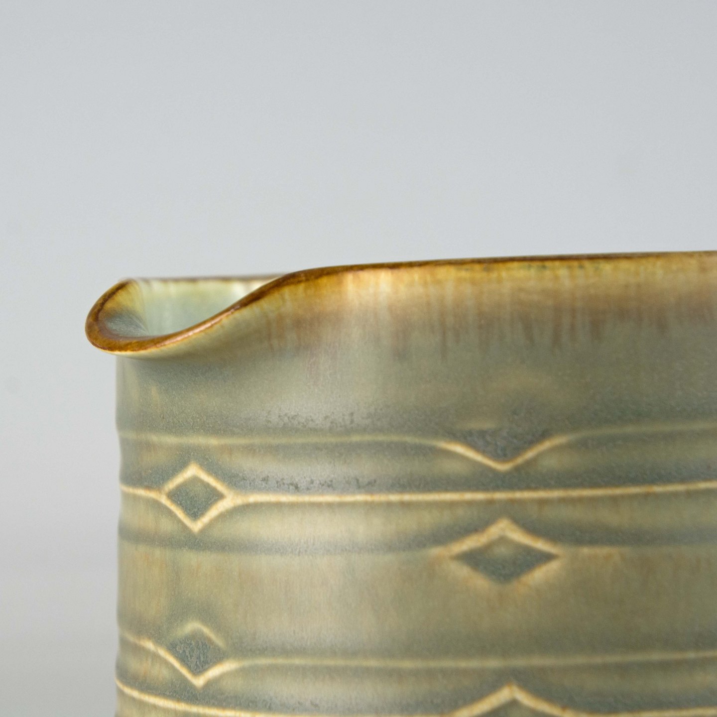 Sovsekande i grøn stentøj med abstrakt motiv.