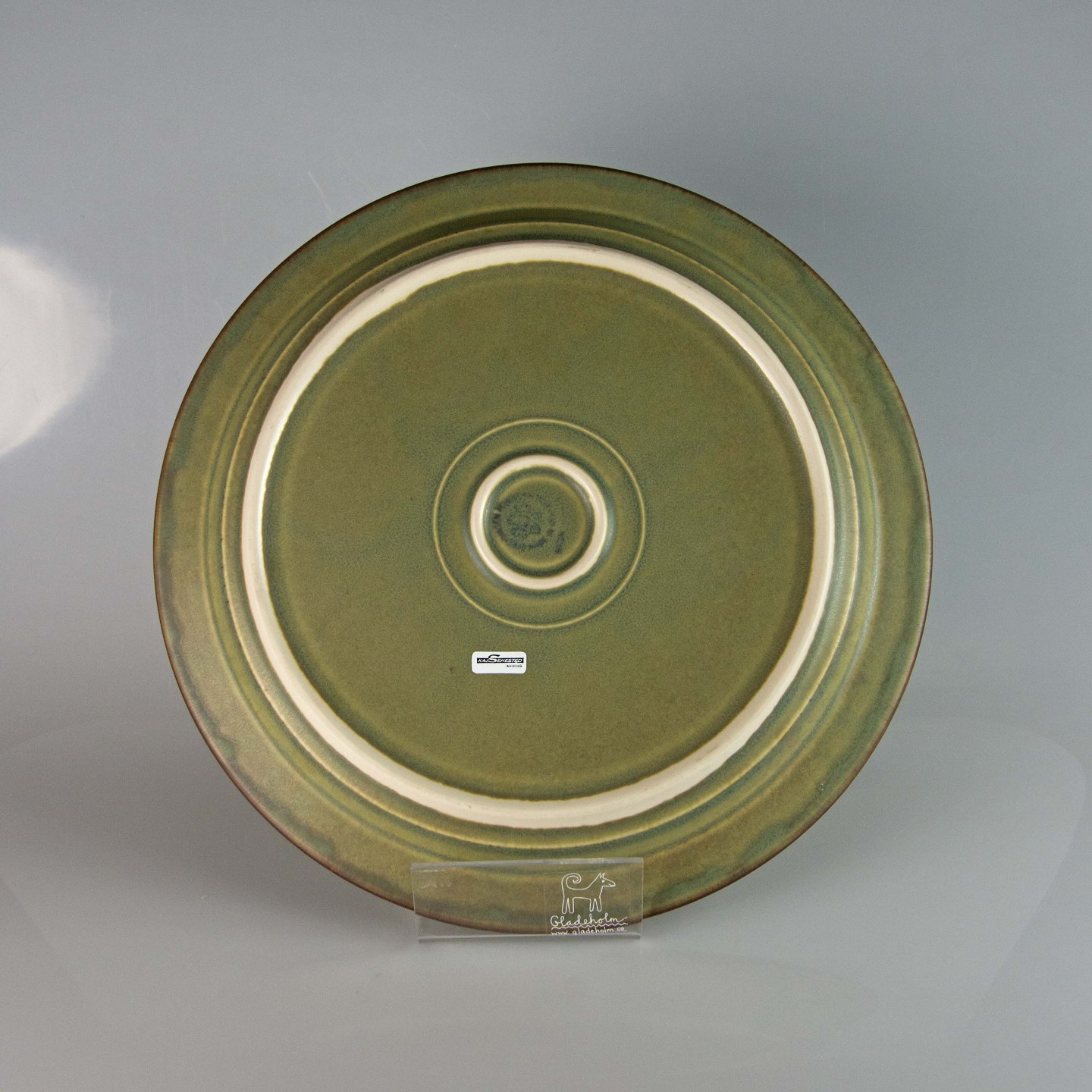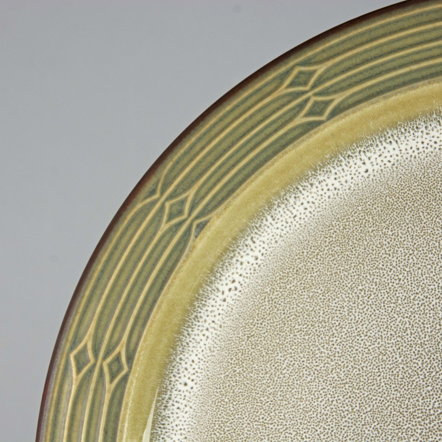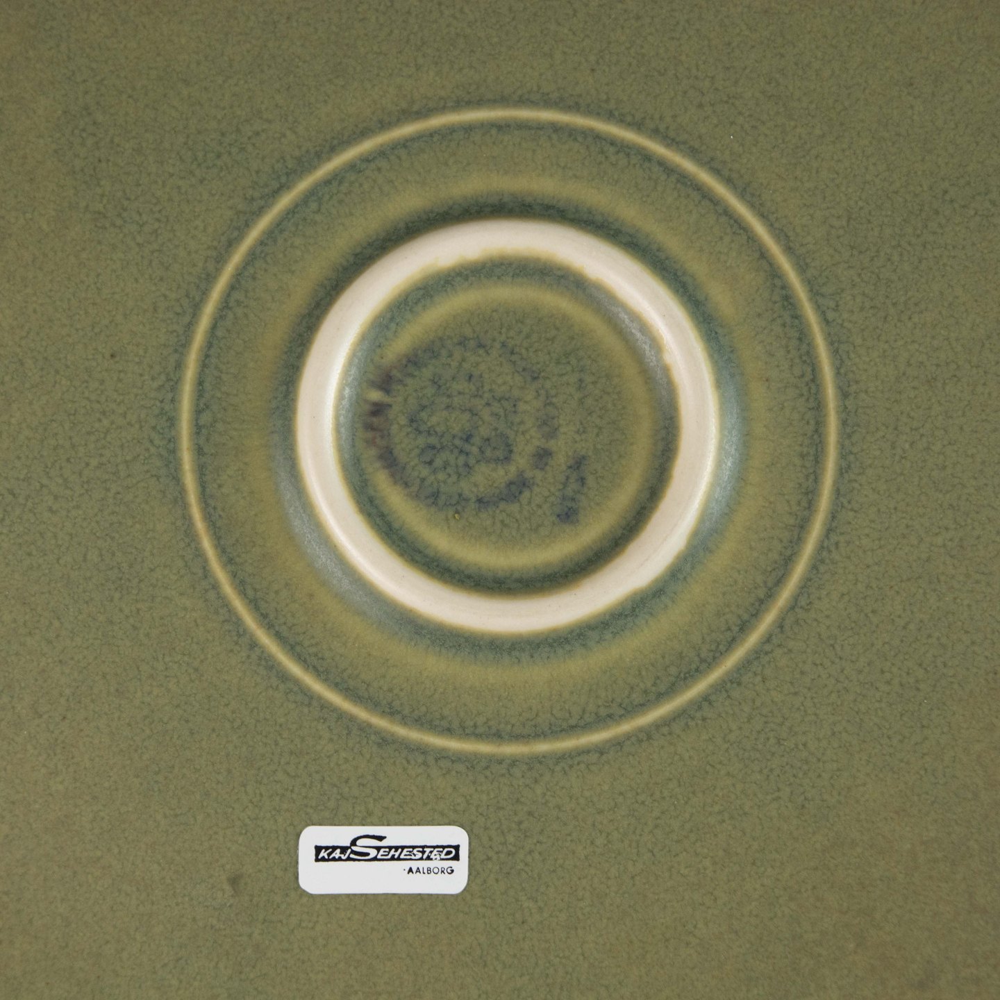Fad i grøn stentøj med abstrakt motiv.