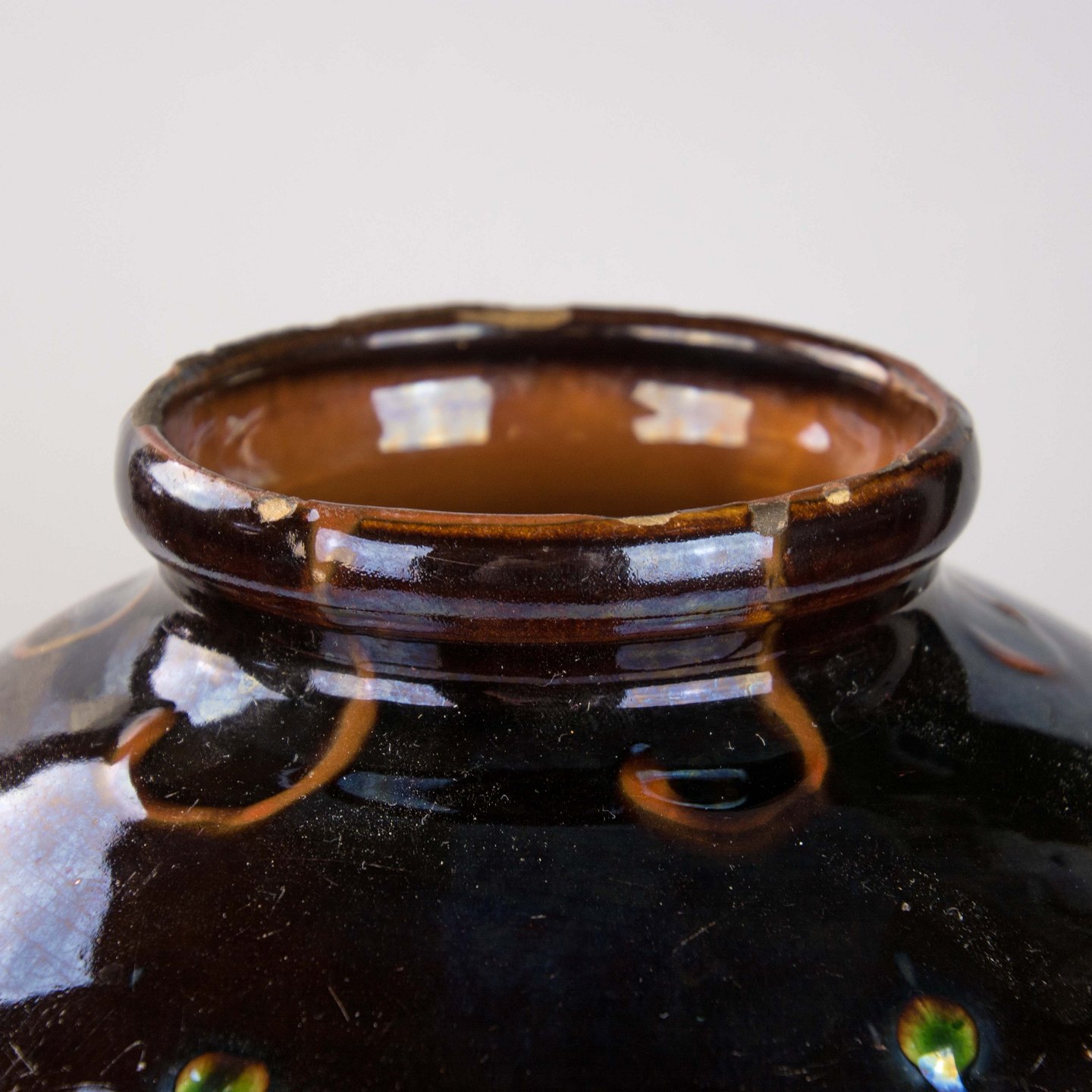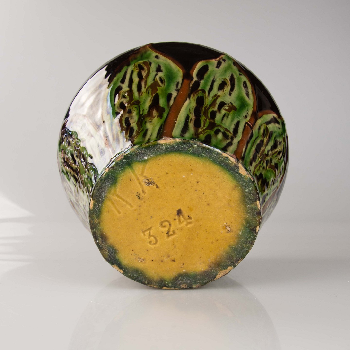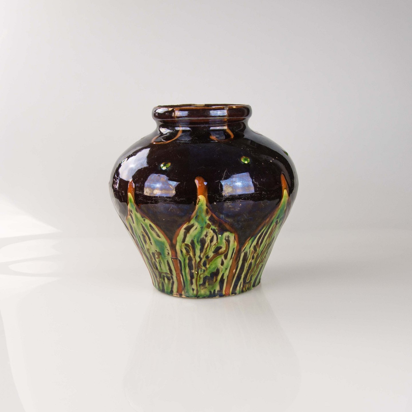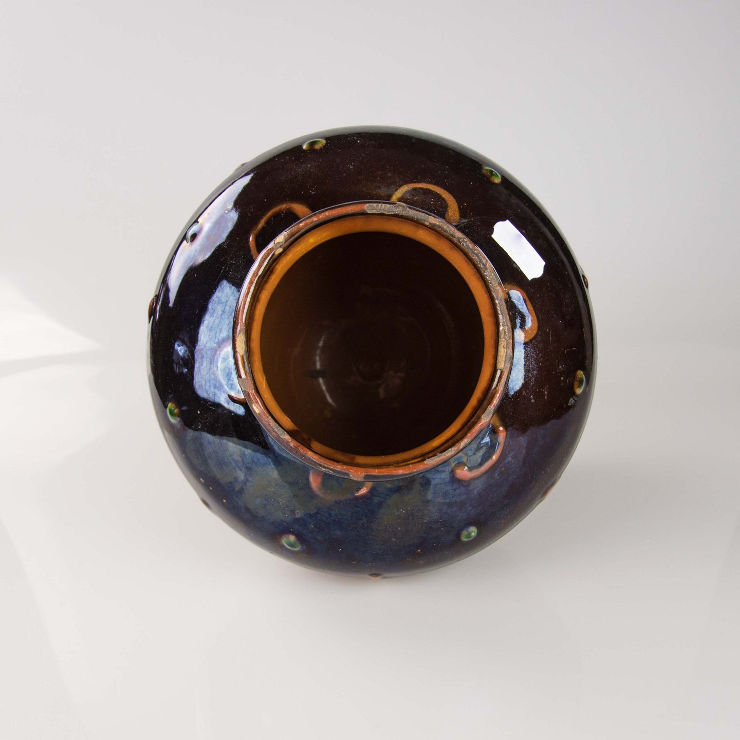 Vase i keramik med mørk blå og grøn glasur i abstrakt mønstre