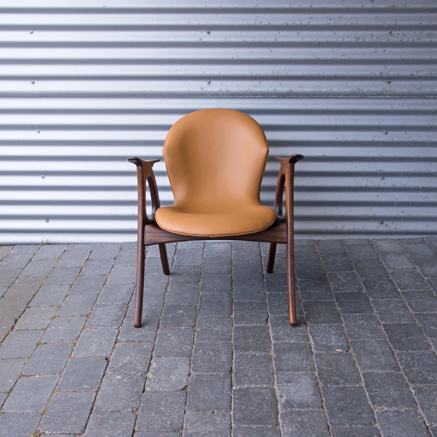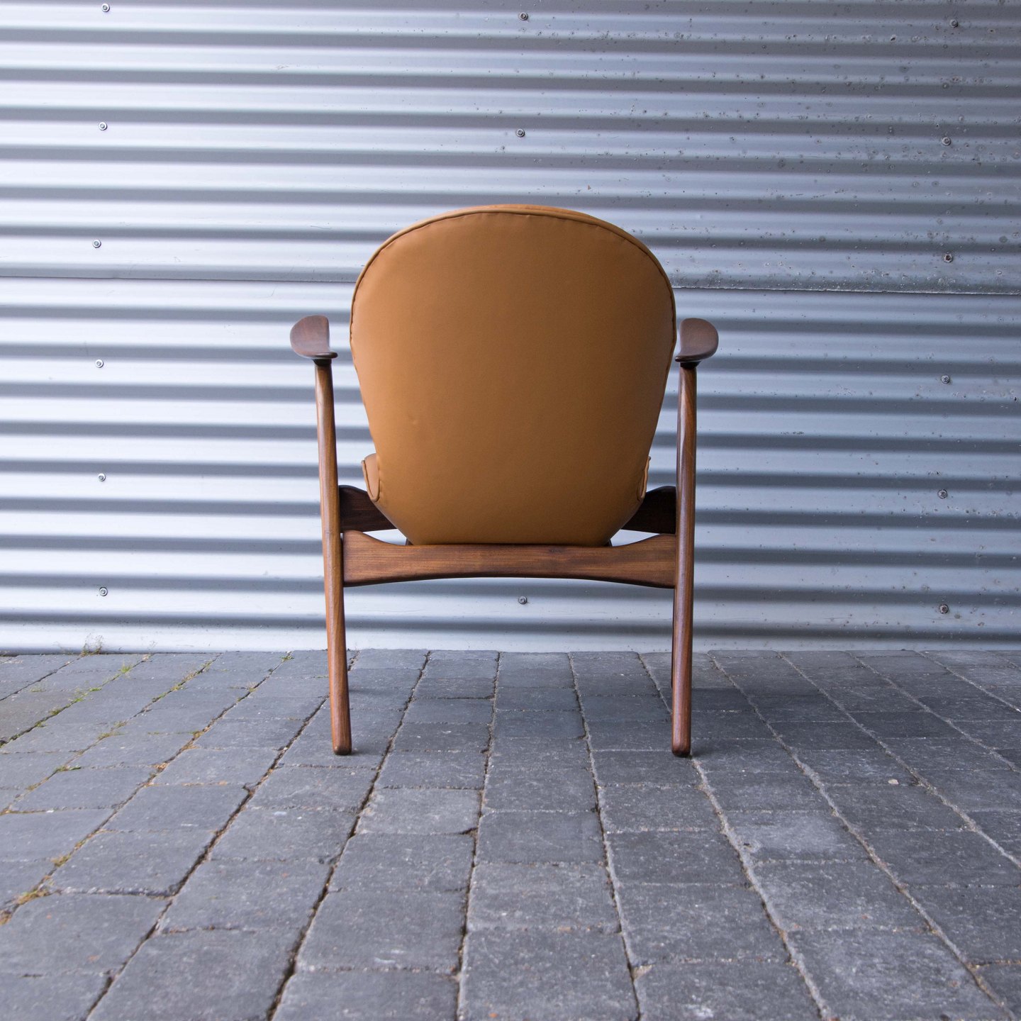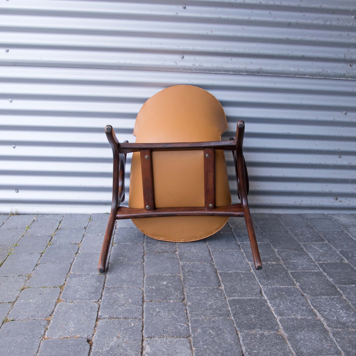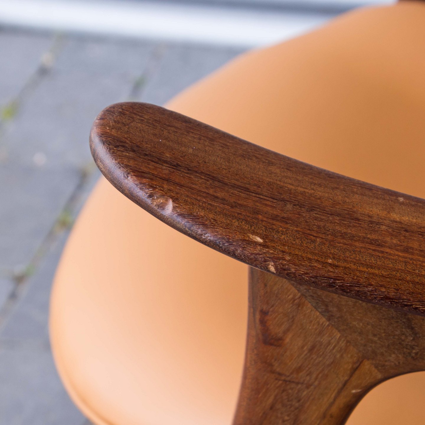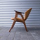 Lænestol i teaktræ med hjemmepolstret sæde i lyst nappa, der er hjemmepolstret.