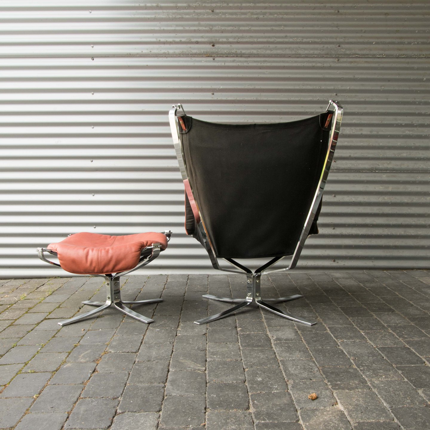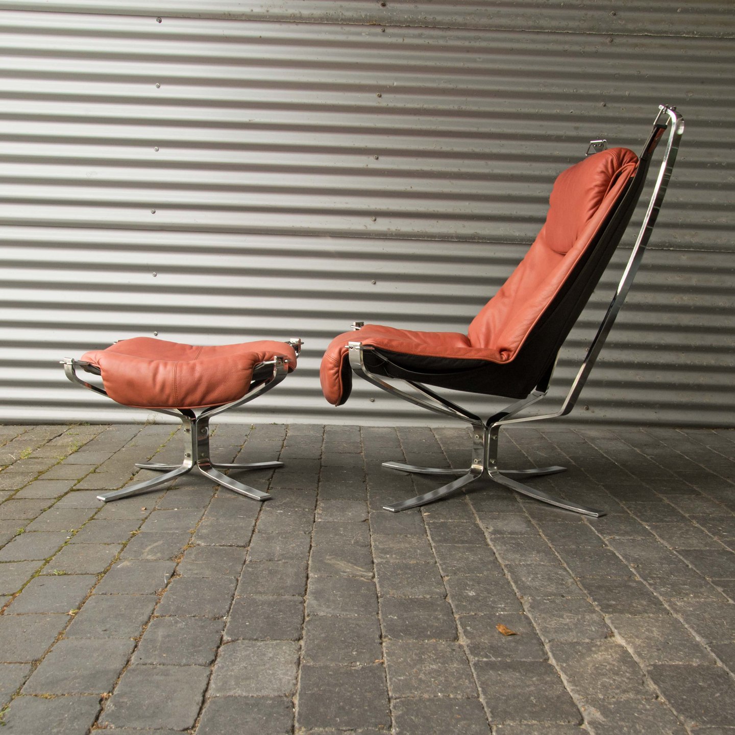 Et sæt højrygget lænestole med skammel i forkromet stål og rødt læder model Falcon.