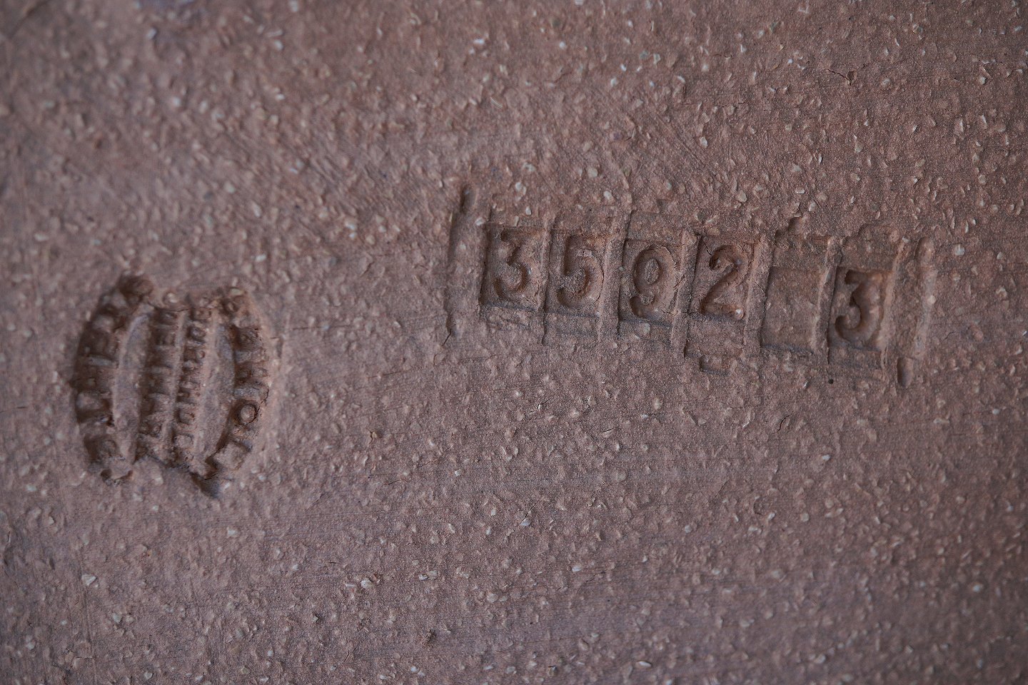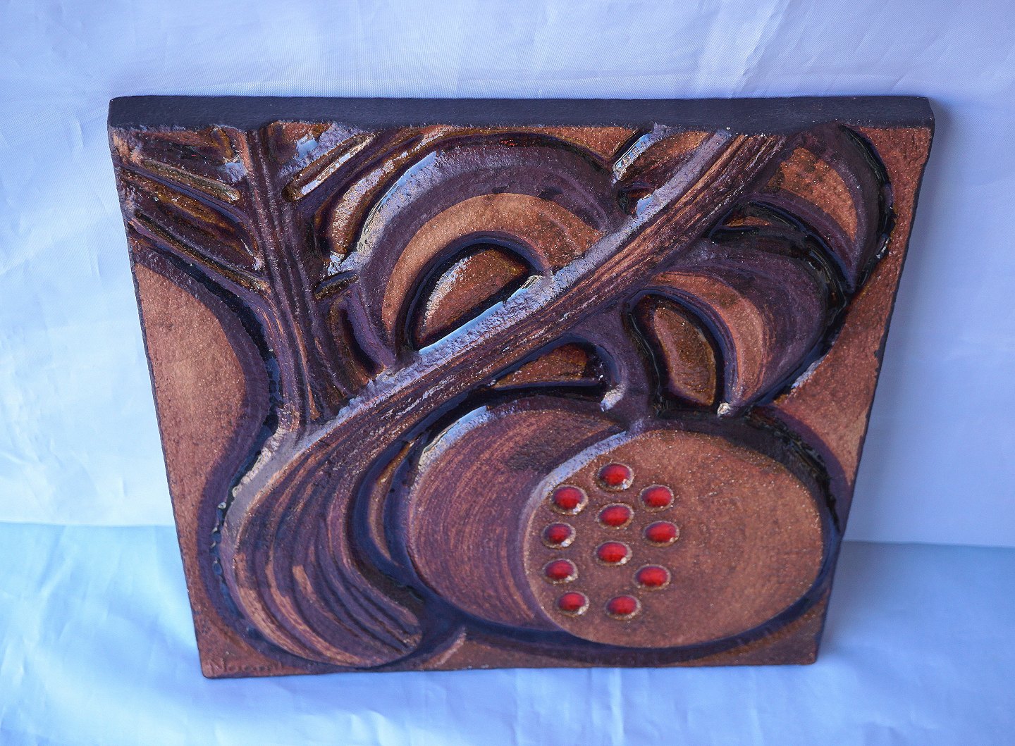 Keramik relief fra Søholm nr. 3592-3. Relieffet er del 3, af en serie på 3.Relieffet er brunt med røde prikker. Design Noomi