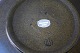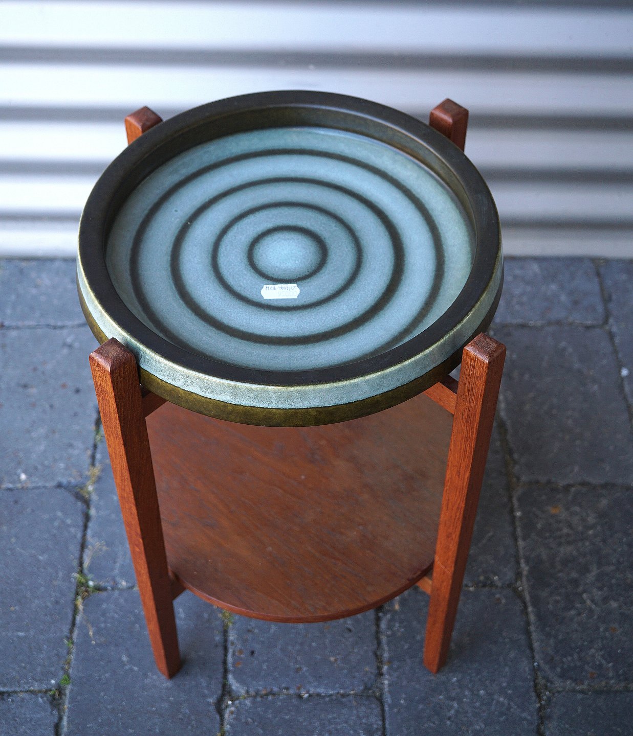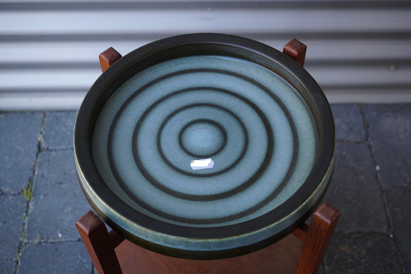 Knabstrupfad, nr. 185/853, der står på et teaktræs stativ. Fadet er i grønlige farver med spiralmønster