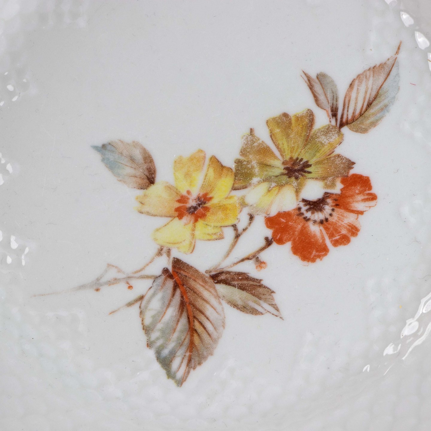 Tallerken i cremefarvet porcelæn med skælmønster og guldkant med blomstermotiv.