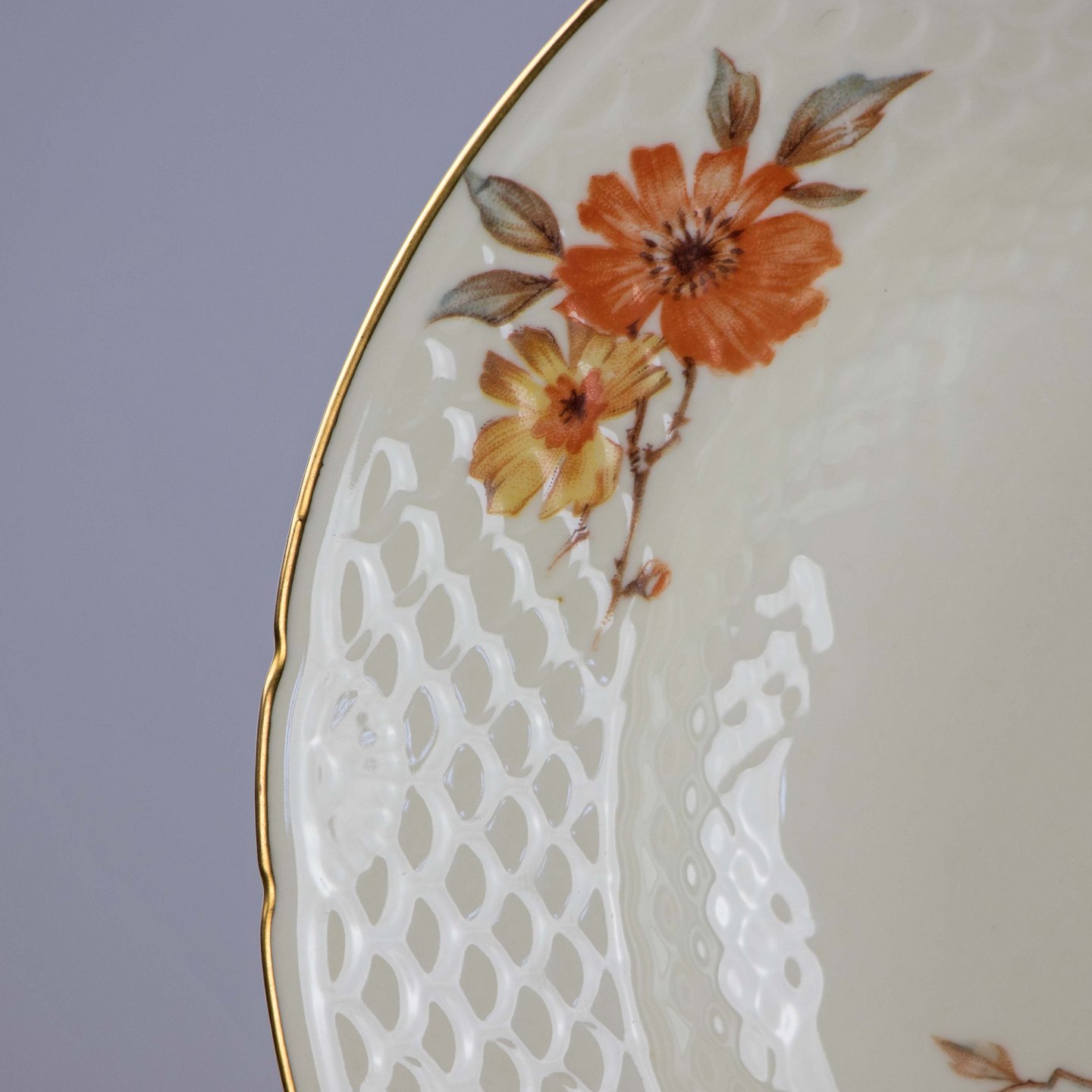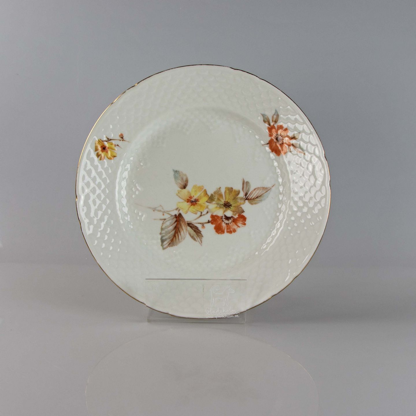 Tallerken i cremefarvet porcelæn med skælmønster og guldkant med blomstermotiv.