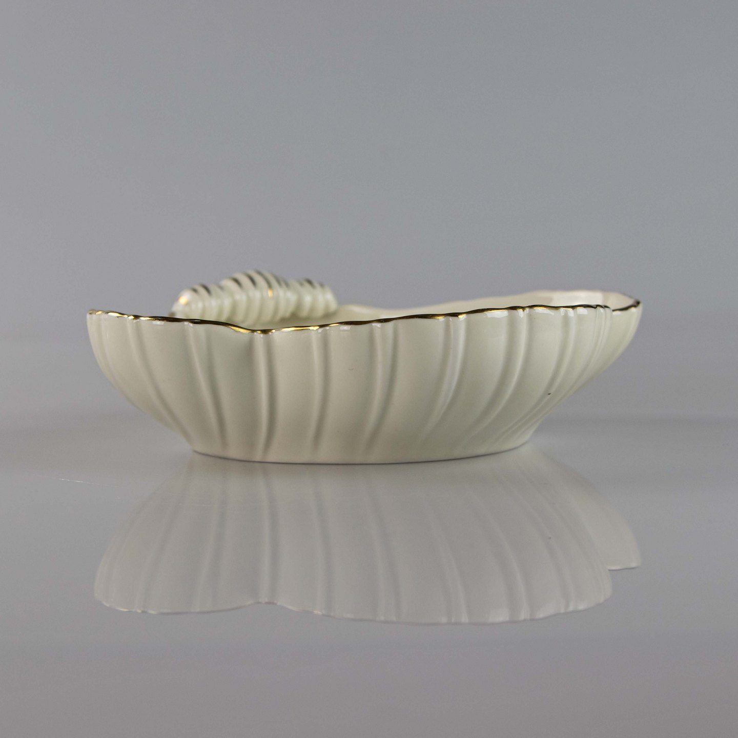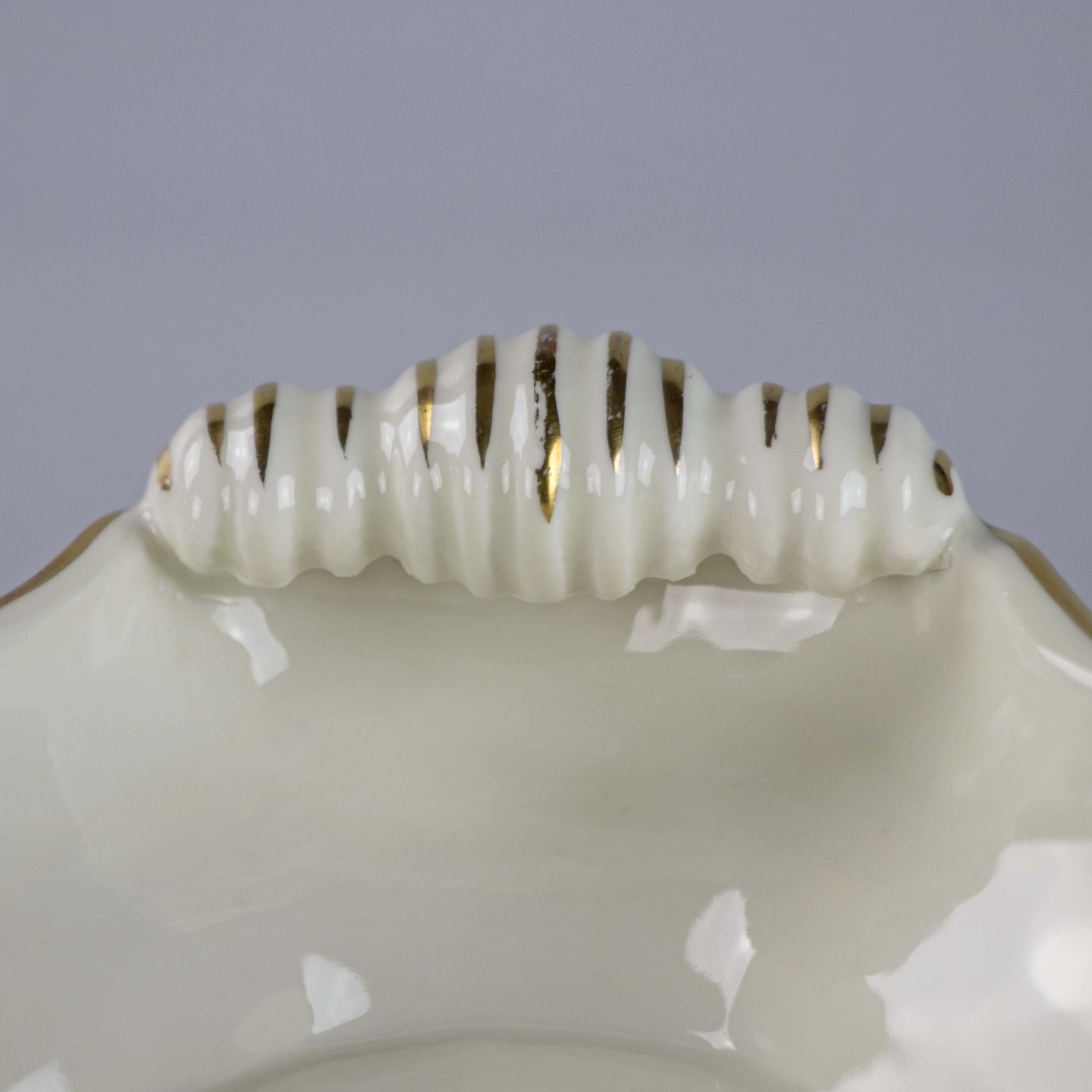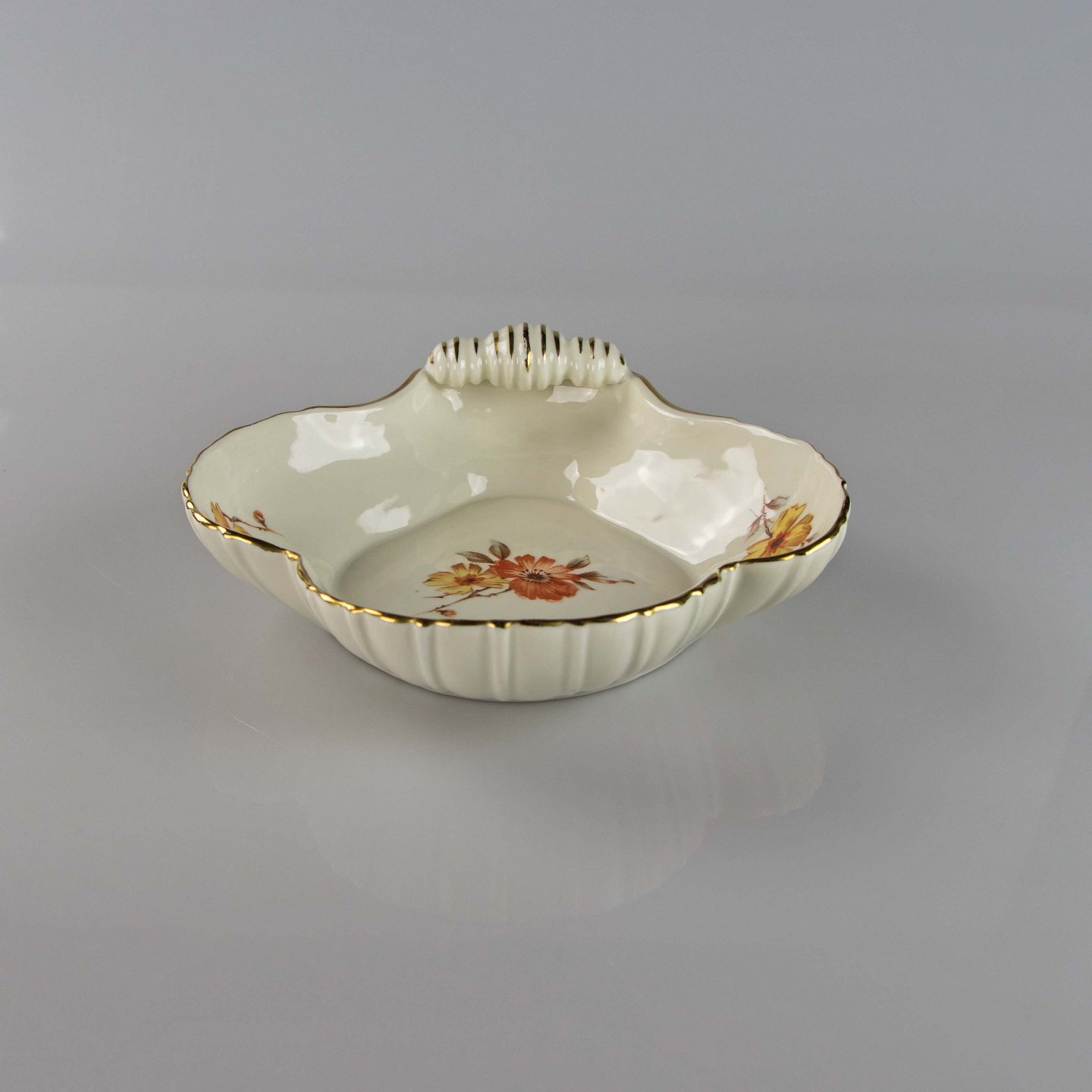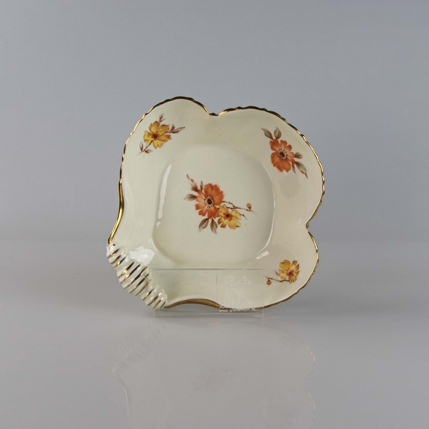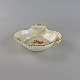 Fad i cremefarvet porcelæn med skælmønster og guldkant med blomstermotiv.