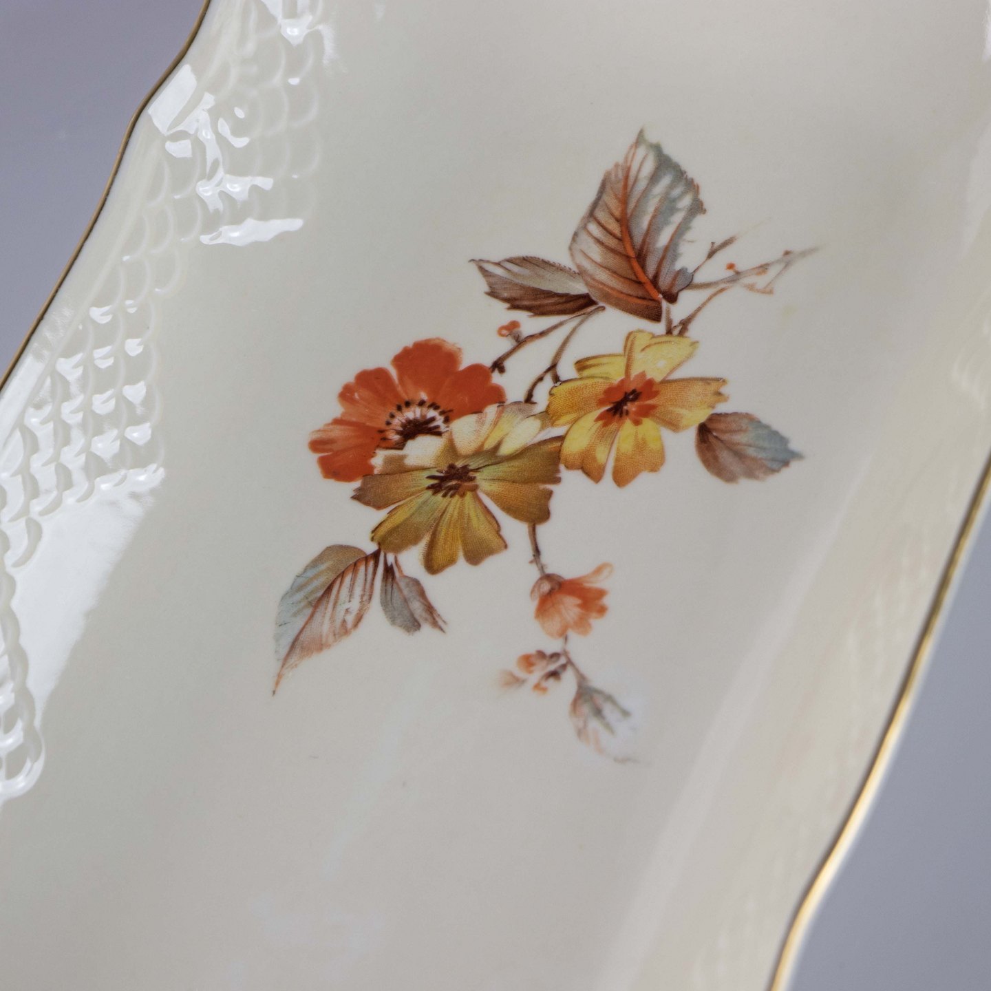Serveringsfad i cremefarvet porcelæn med skælmønster og guldkant med blomstermotiv.