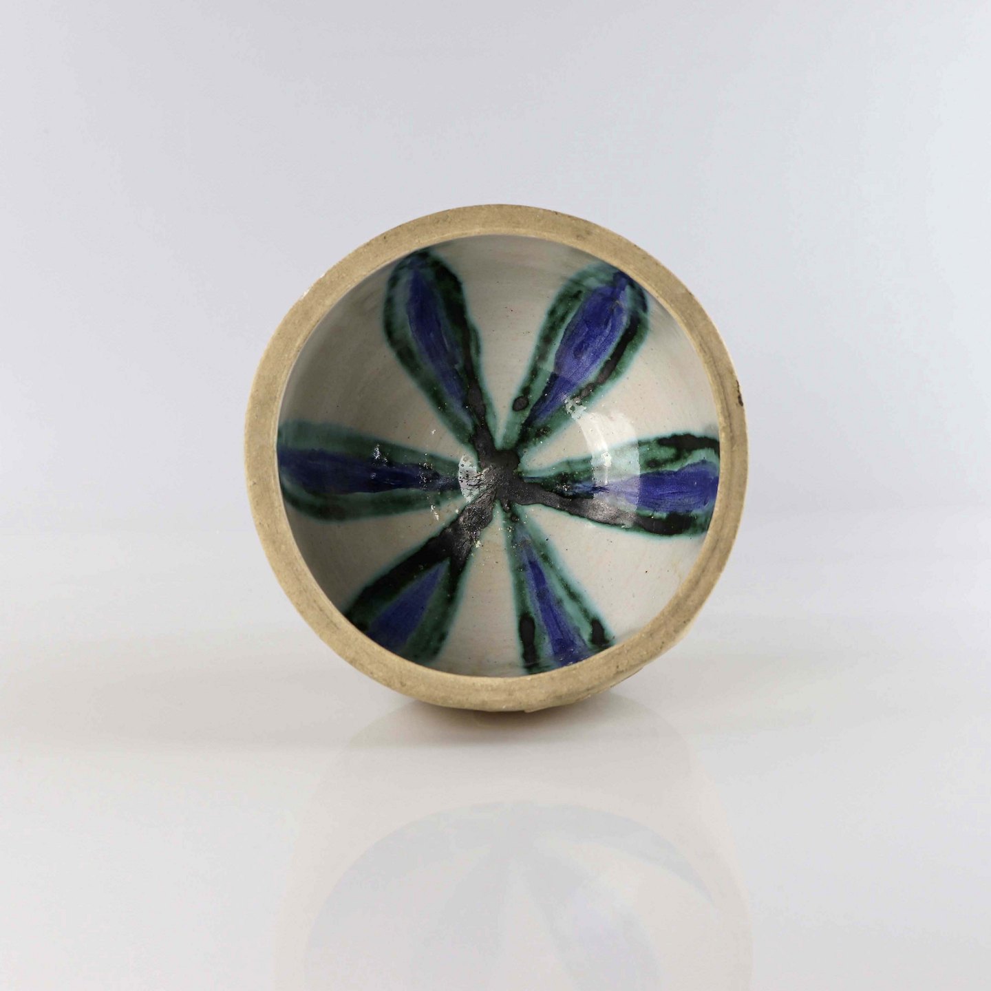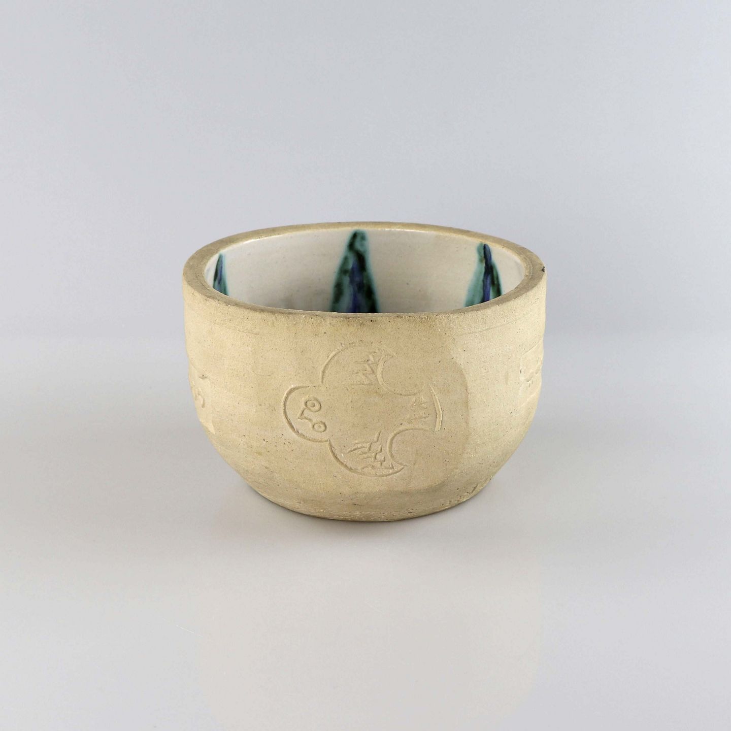 Skål i keramik med fuglemotiv og indvendigt glasur med mønster