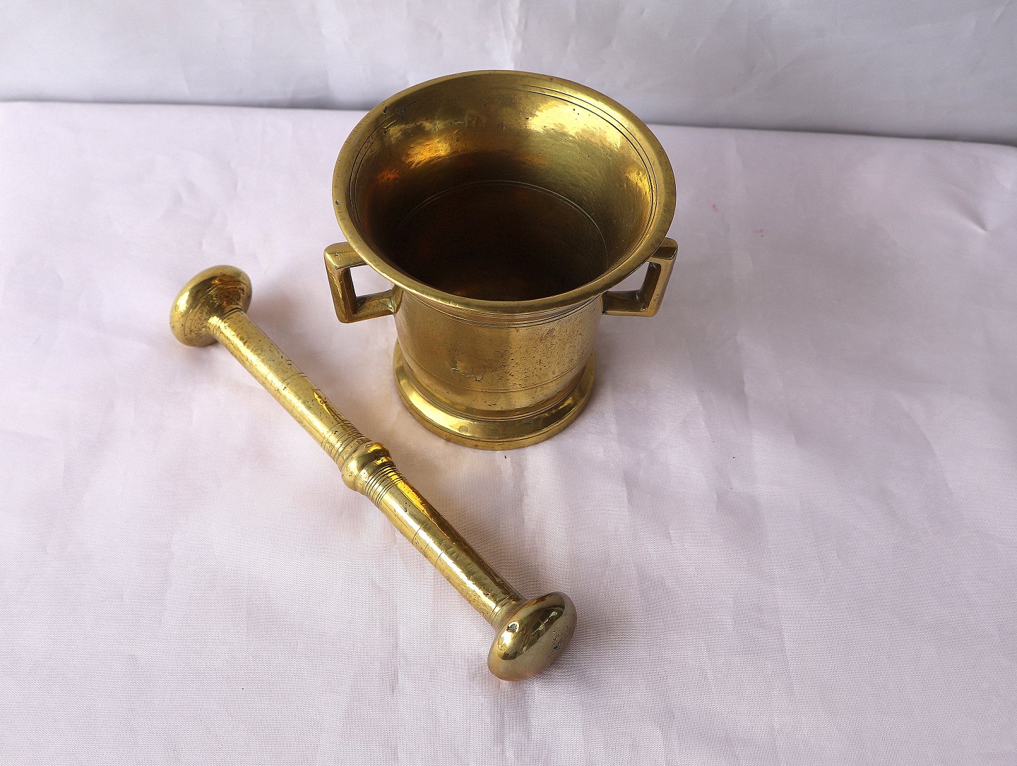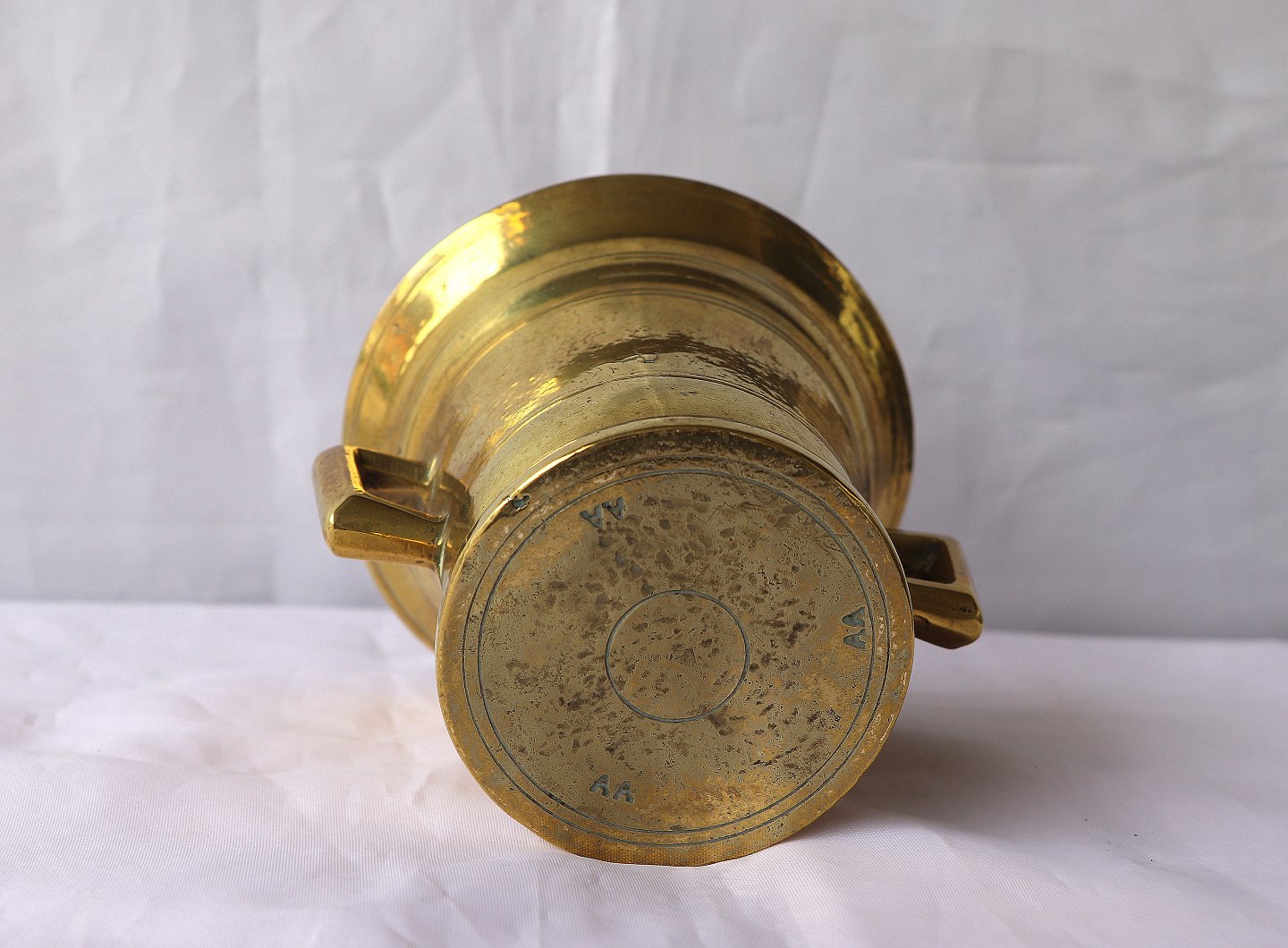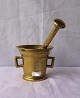 Morter & støder af messing. Der er graveret forskellige bogstaver + årstal (1863) på front af morteren. I bunden er der stemplet AA 3 gange.