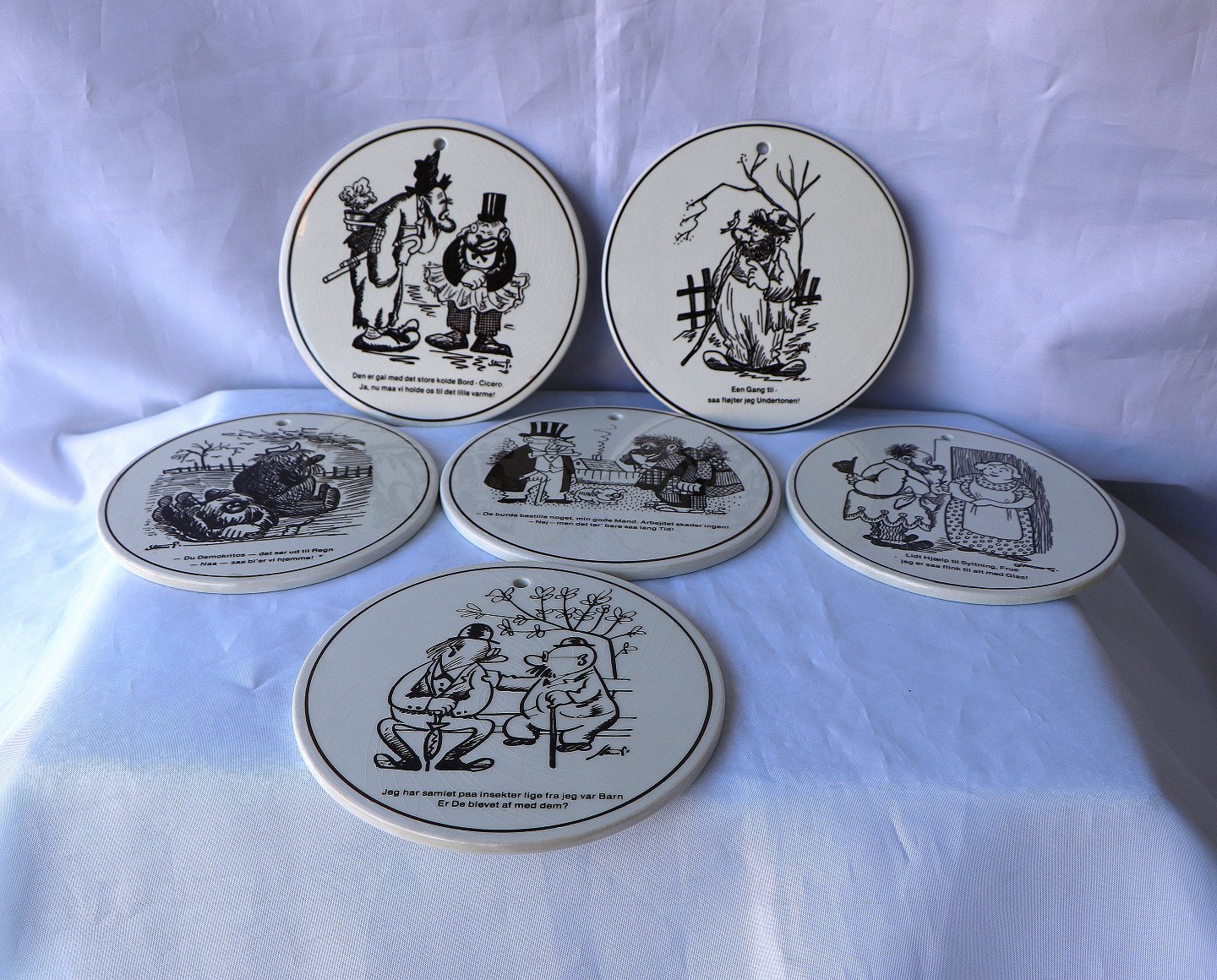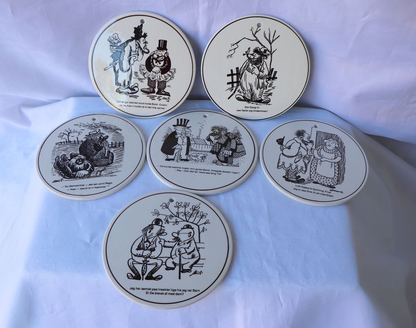 Robert Storm P. platter/smørrebrædder, fra Knabstrup. Platterne er med citater fra Storm P. Motivet er tegnet med sort streg