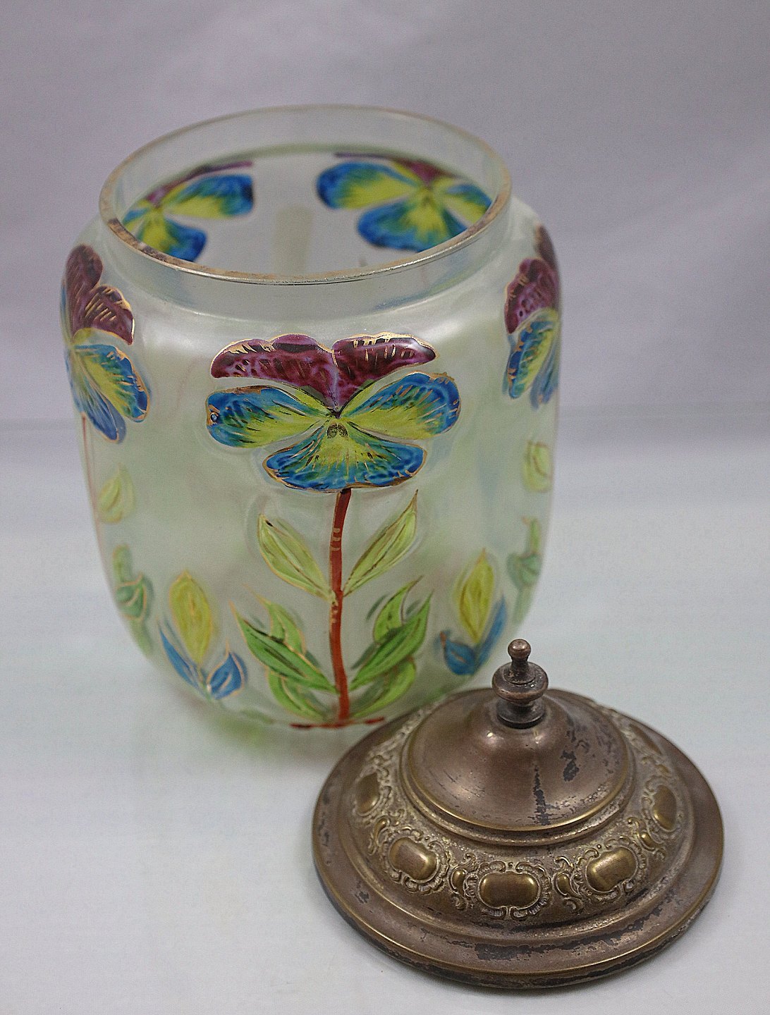 Kiksespand, med låg, i klart glas. Mønstret er præget i glasset og malet. Låget er af metal.