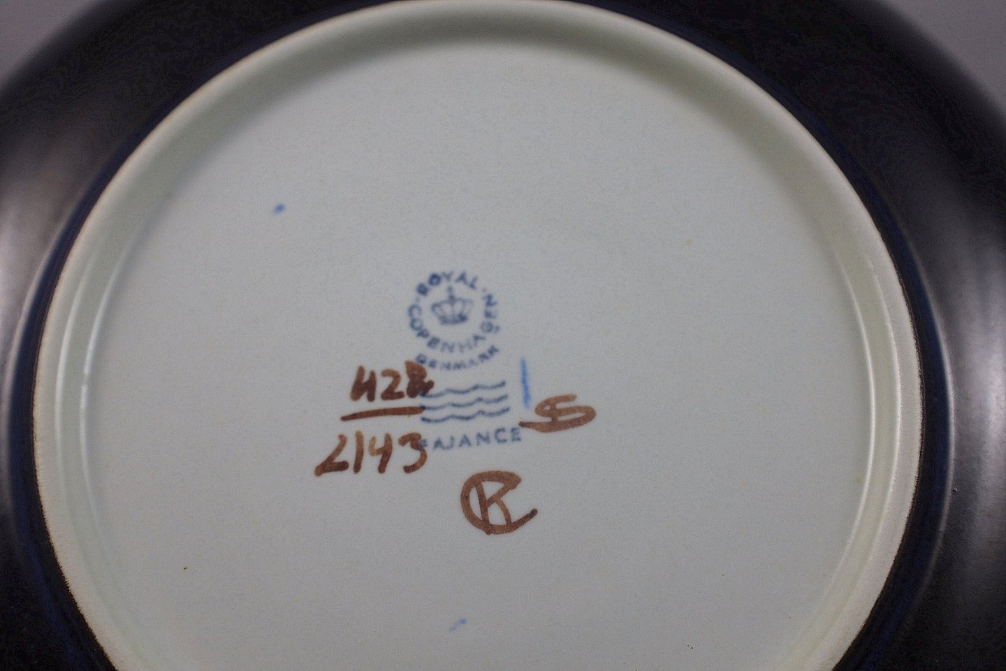 Royal Copenhagen. Fajance, Tenera skål nr. 428/2143, skålen er dekoreret med blålige og brunlige farver. Arkivfoto