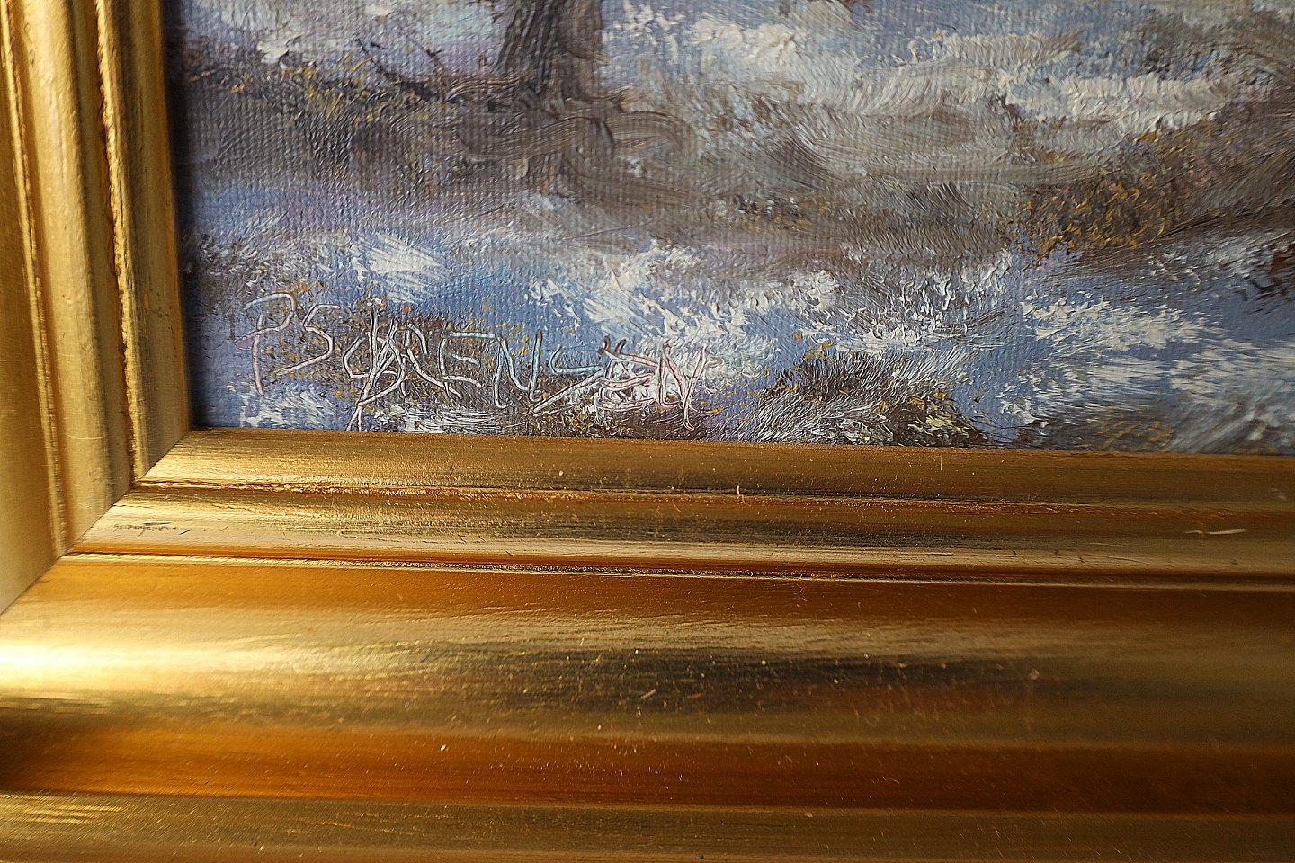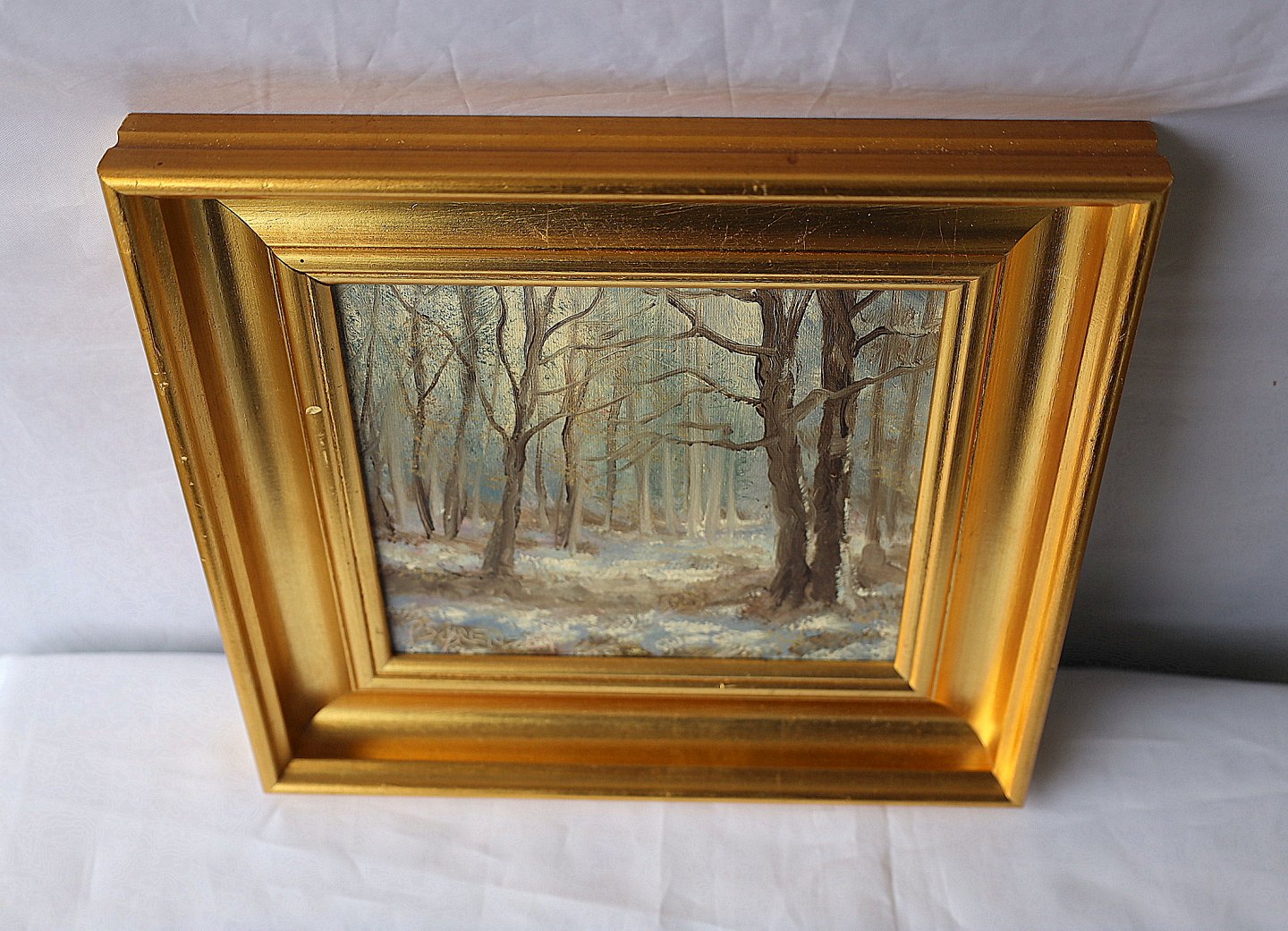 Lille maleri, af vinterskov, i stor guldramme. Enkelte brugsspor.