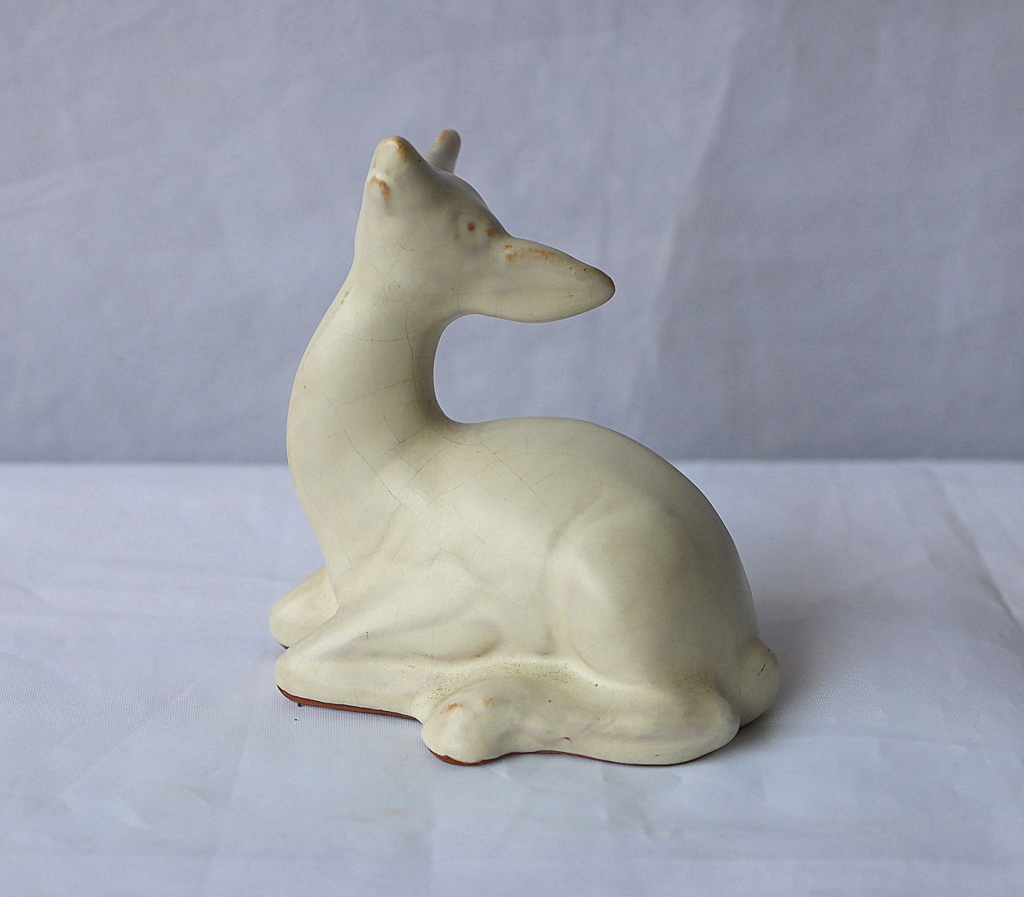 Liggende dådyr. Dådyret er lavet af keramik og glaseret cremefarvet