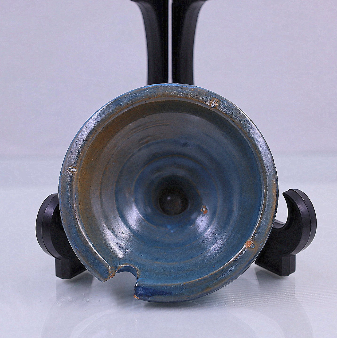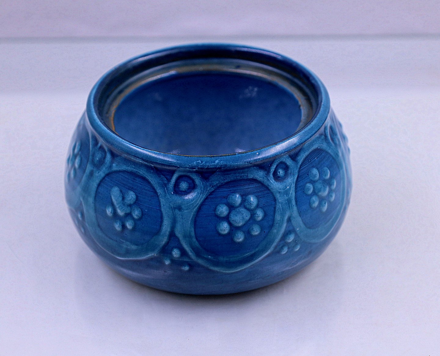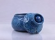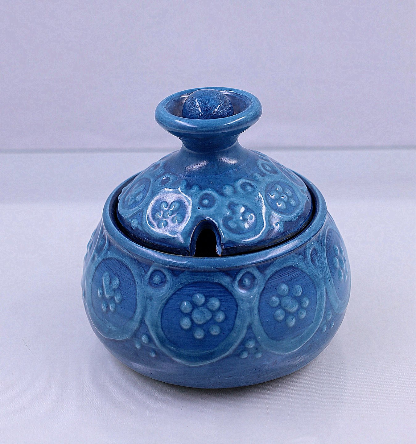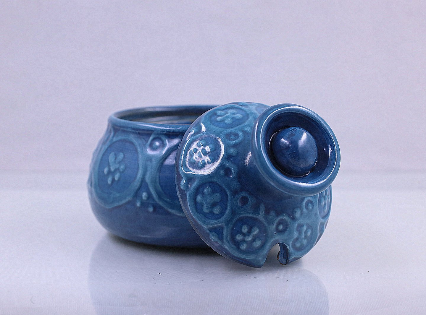 Blå, keramik - stor marmelade krukke med låg. Dekoreret med cirkler, med pletter der ligner blomster.