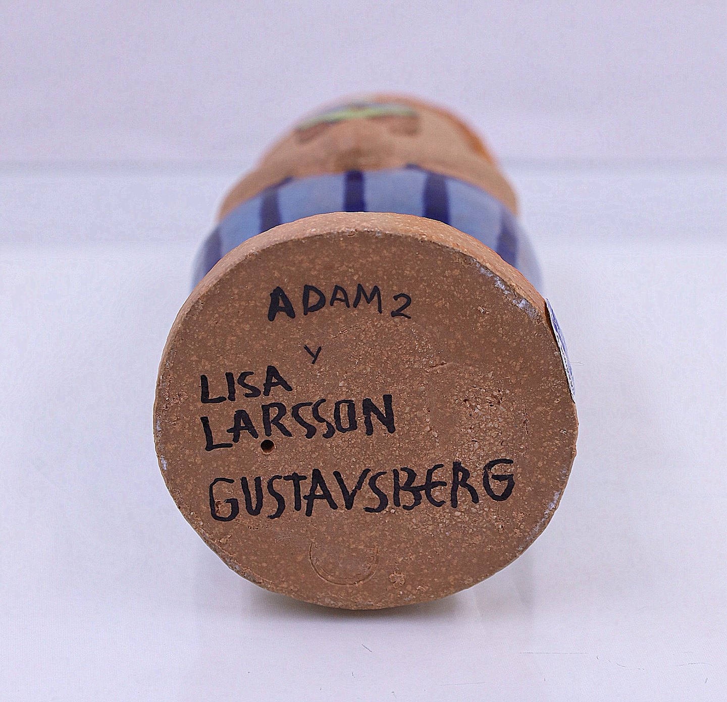 Lisa Larson for Gustavsberg. Adam 2, Adam 2 har stribet bukser på og en blomst i hænderne.