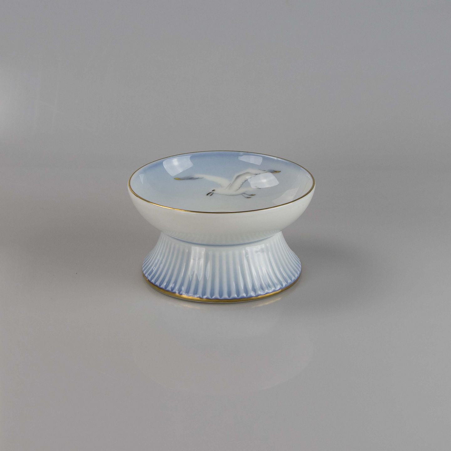 Lysestage fremstillet i porcelæn med skelform i gradueret blå nuancer med guldkant samt motiv af måge.