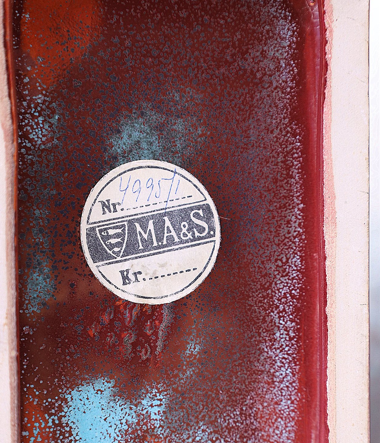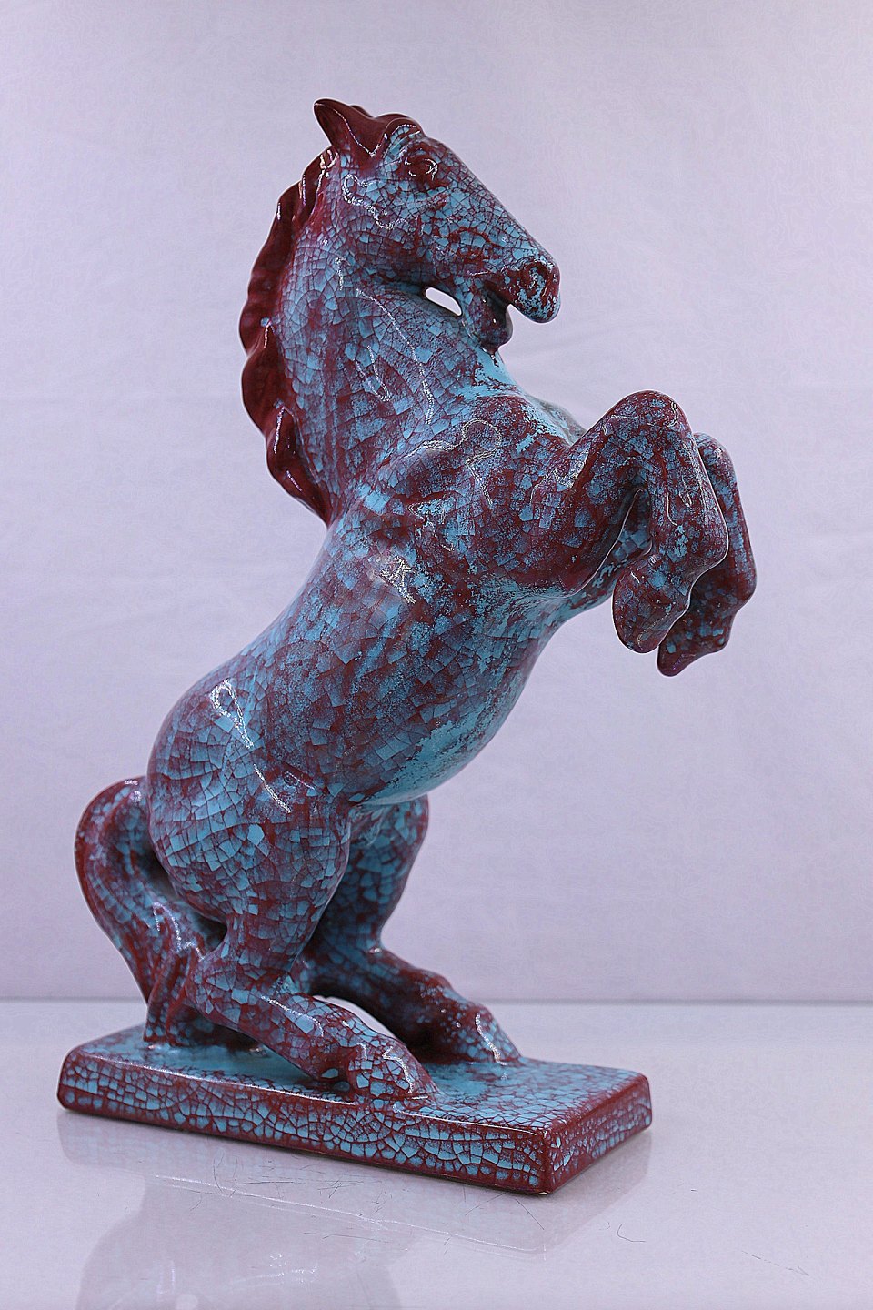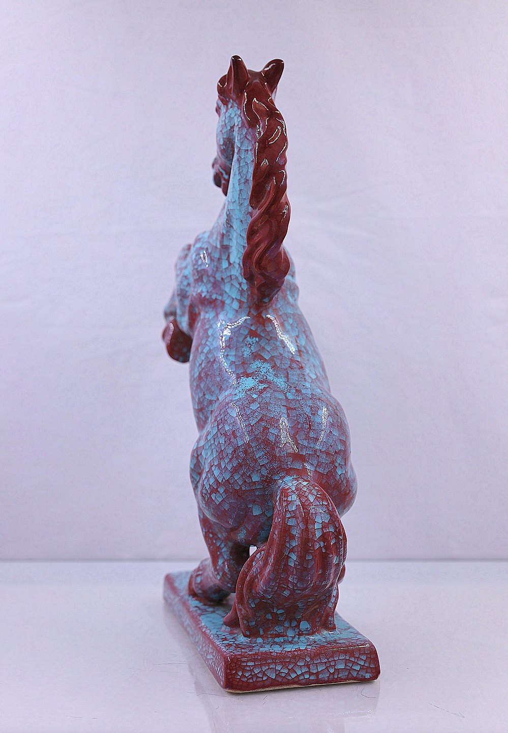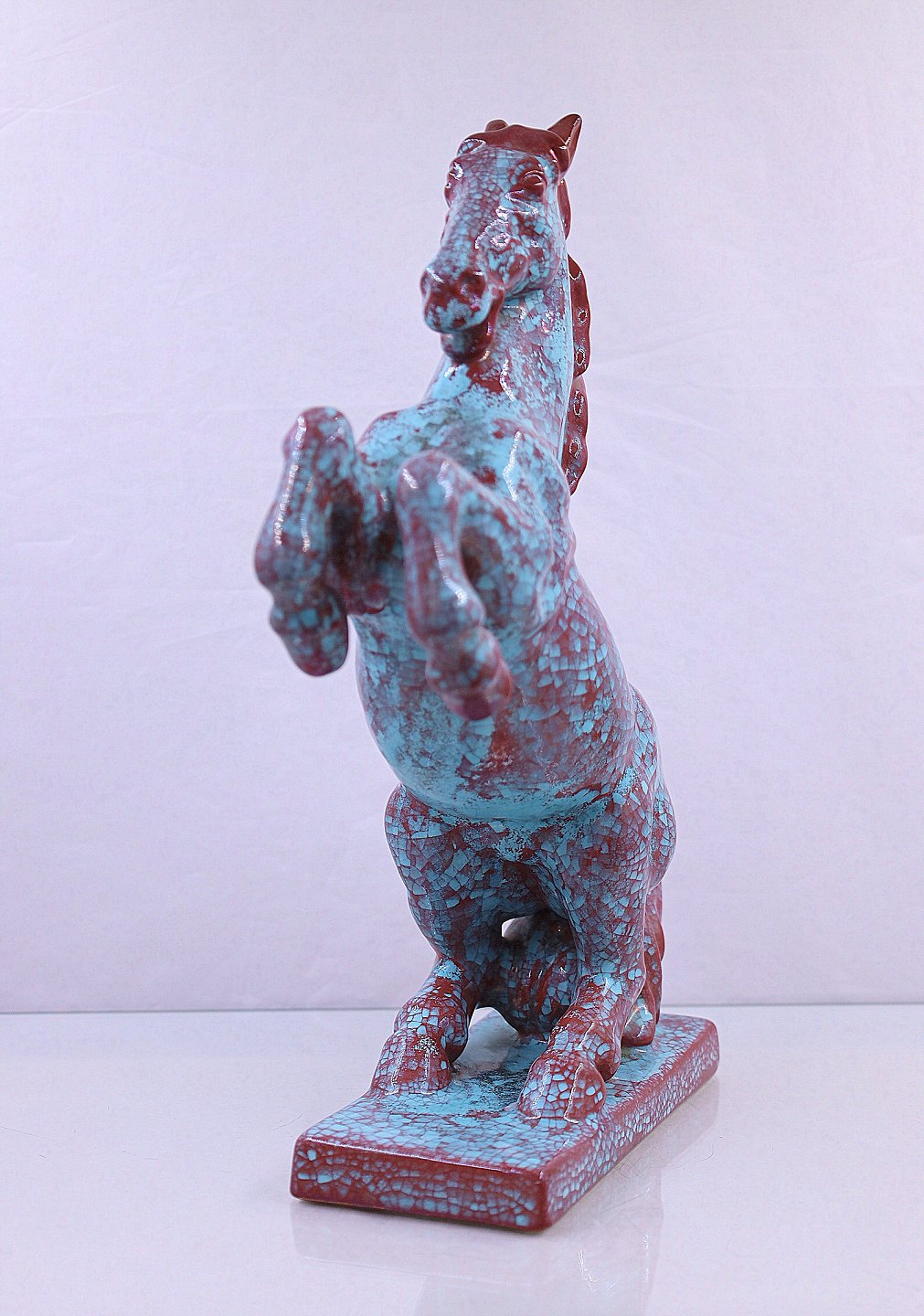 Michael Andersen, Bornholm. Lertøjs figur i form af stejlende hingst, nr. 4995/1. Hingsten er dekoreret med grøn og rød krakelè-/arabica-glasur.