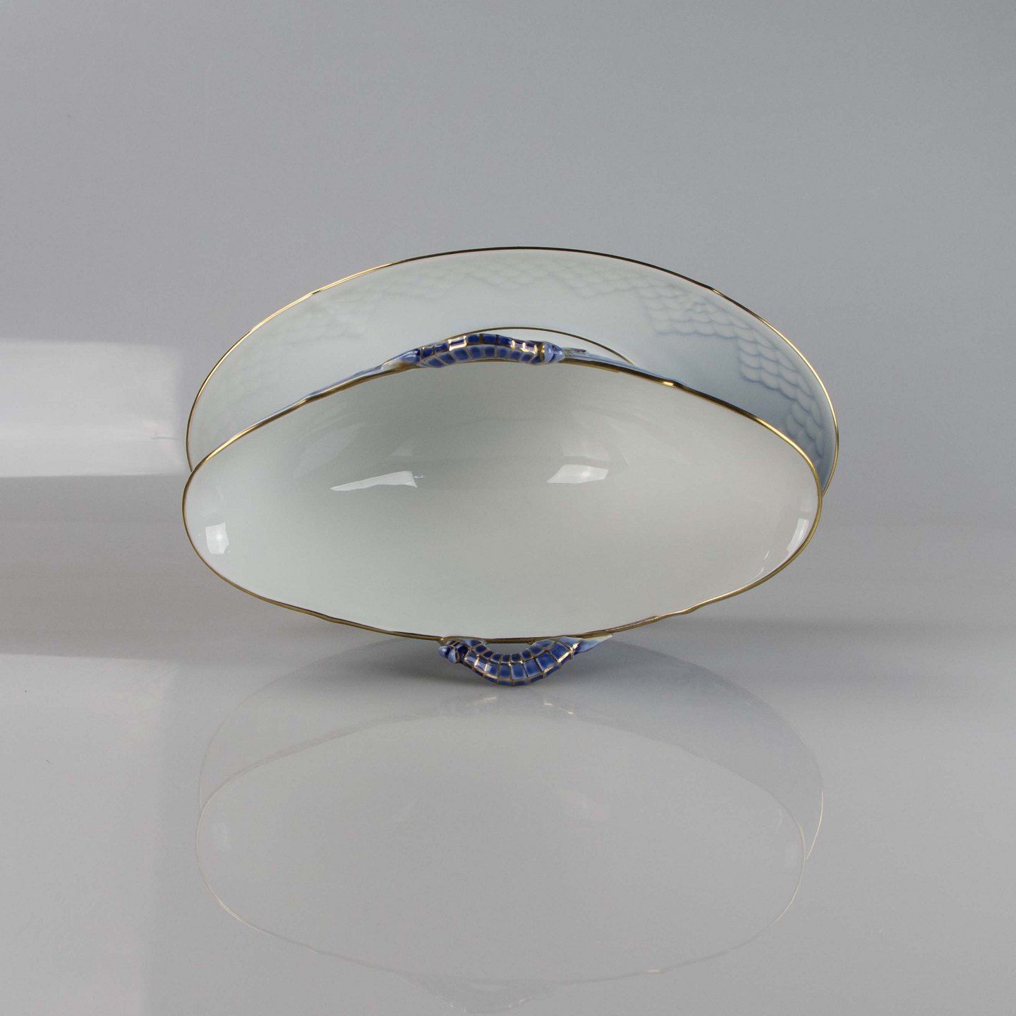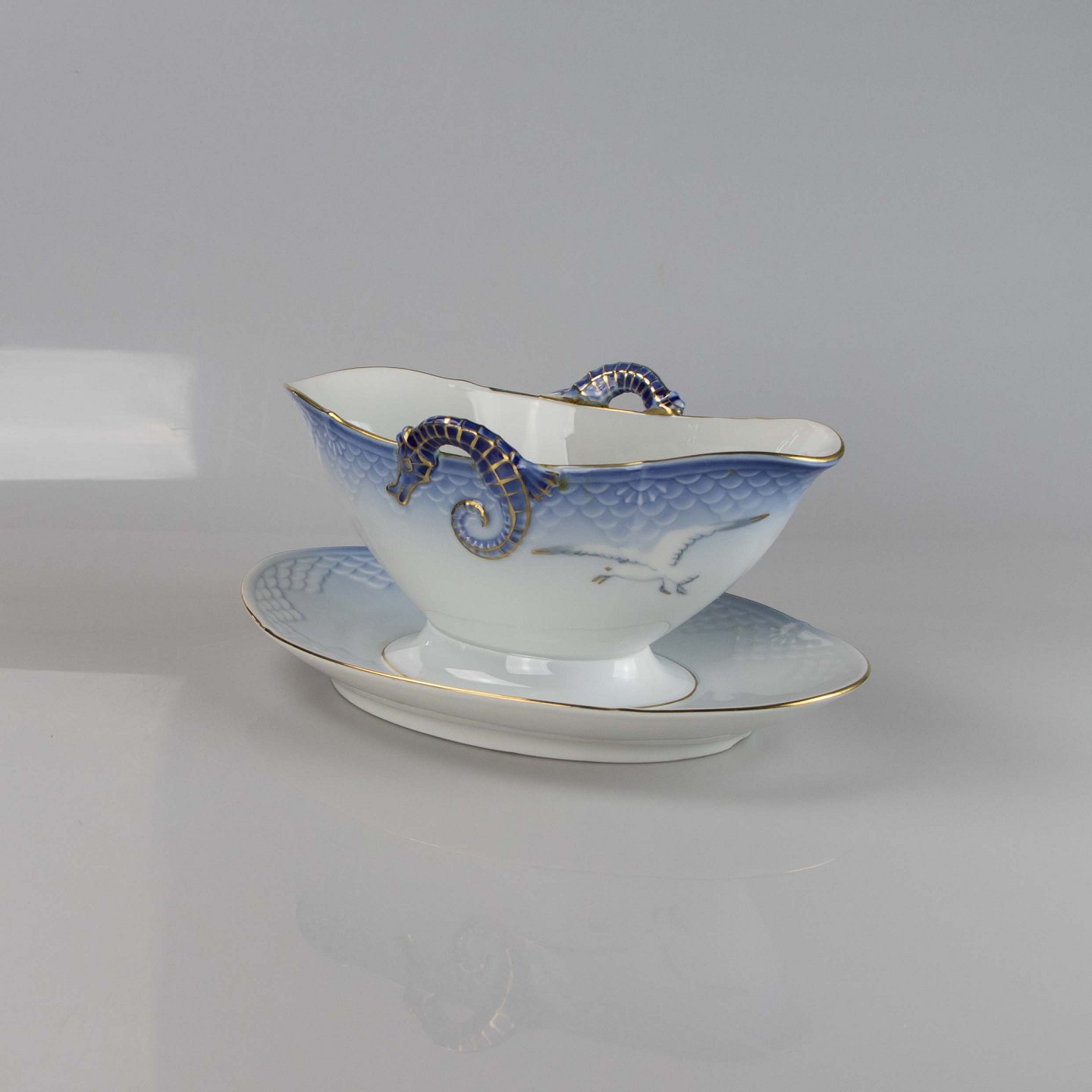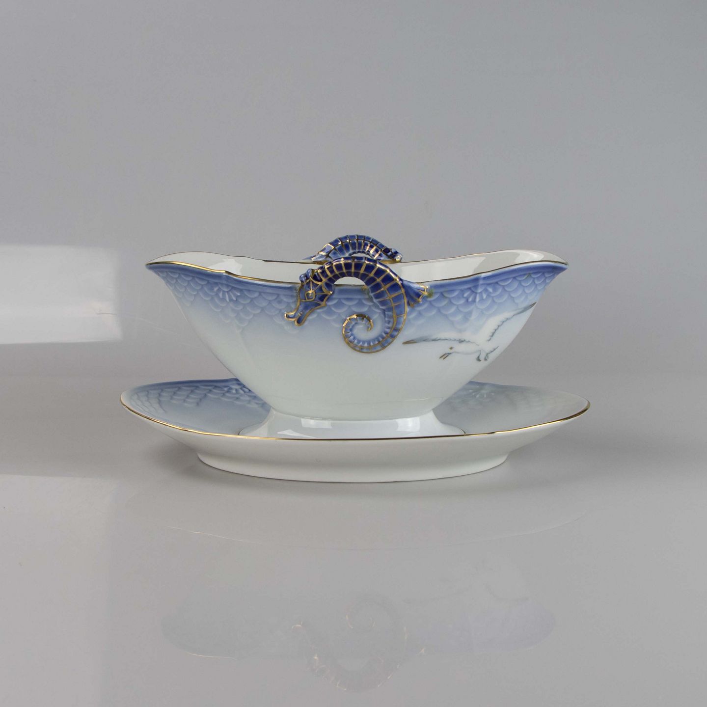 Sovseskål fremstillet i porcelæn med skelform i gradueret blå nuancer med guldkant samt motiv af måge.