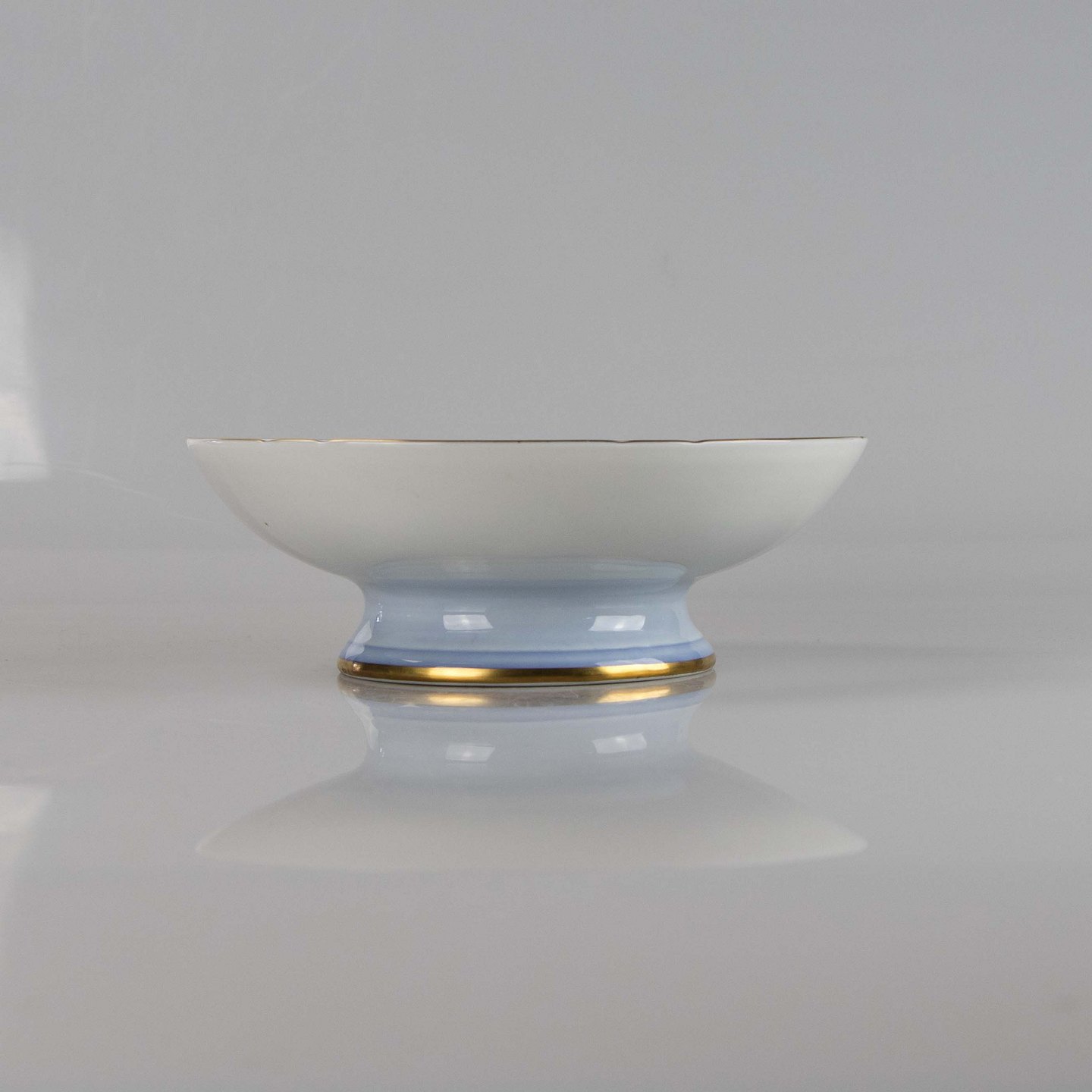 Kande fremstillet i porcelæn med skelform i gradueret blå nuancer med guldkant samt motiv af måge.