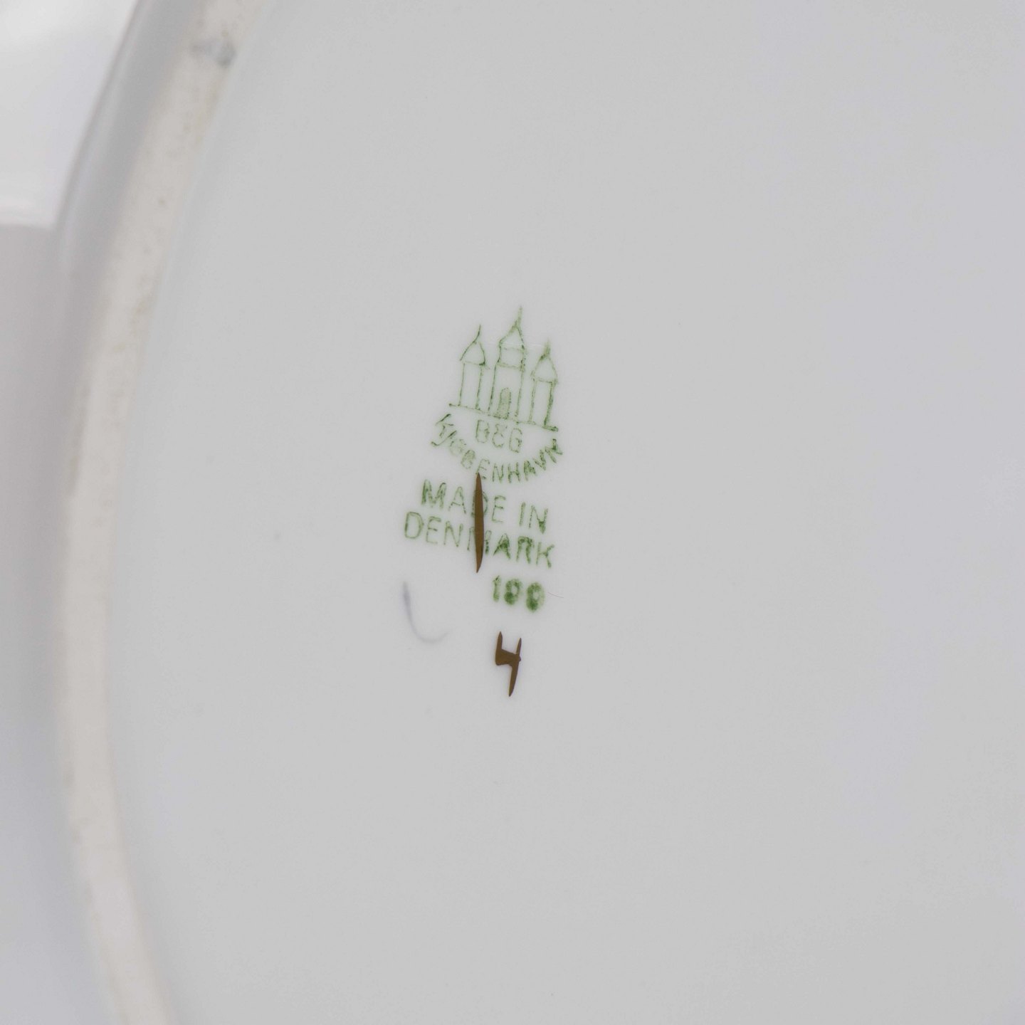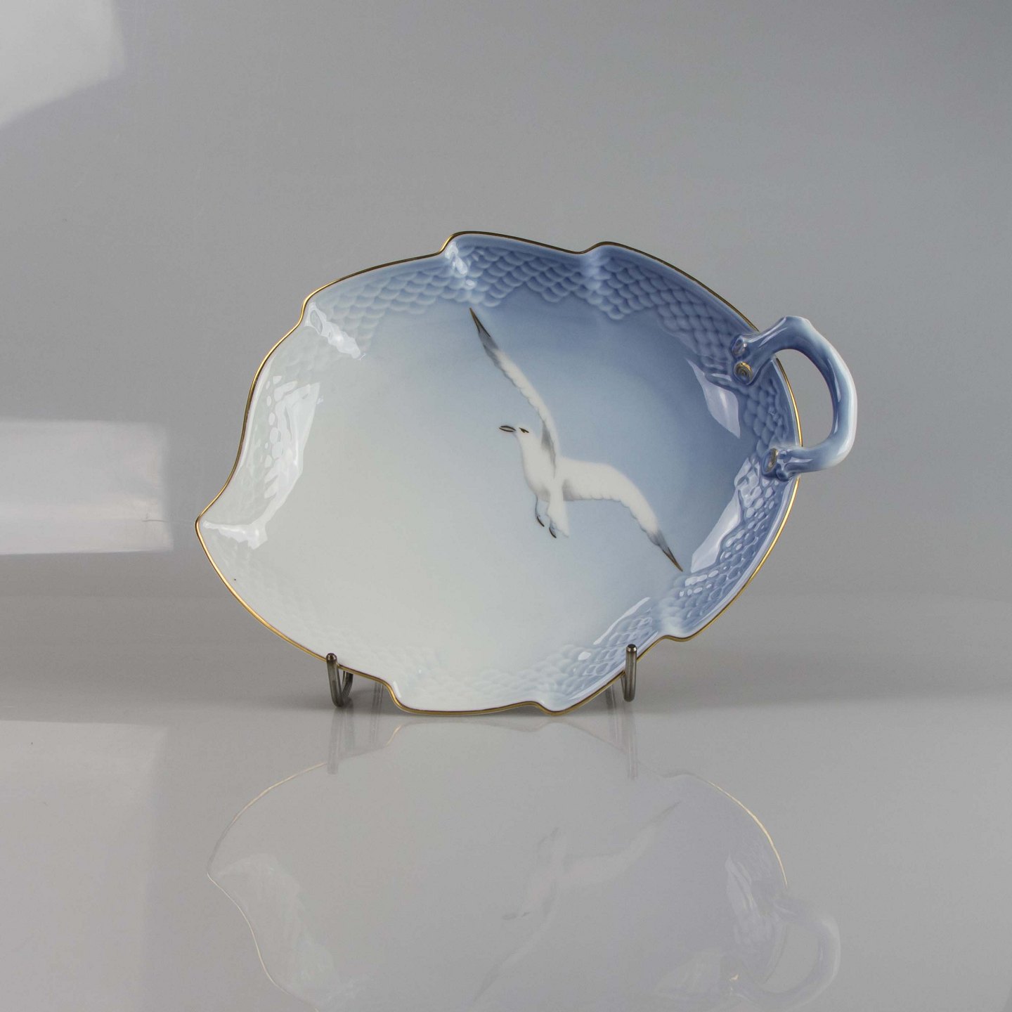 Kagefad fremstillet i porcelæn med skelform i gradueret blå nuancer med guldkant samt motiv af måge.