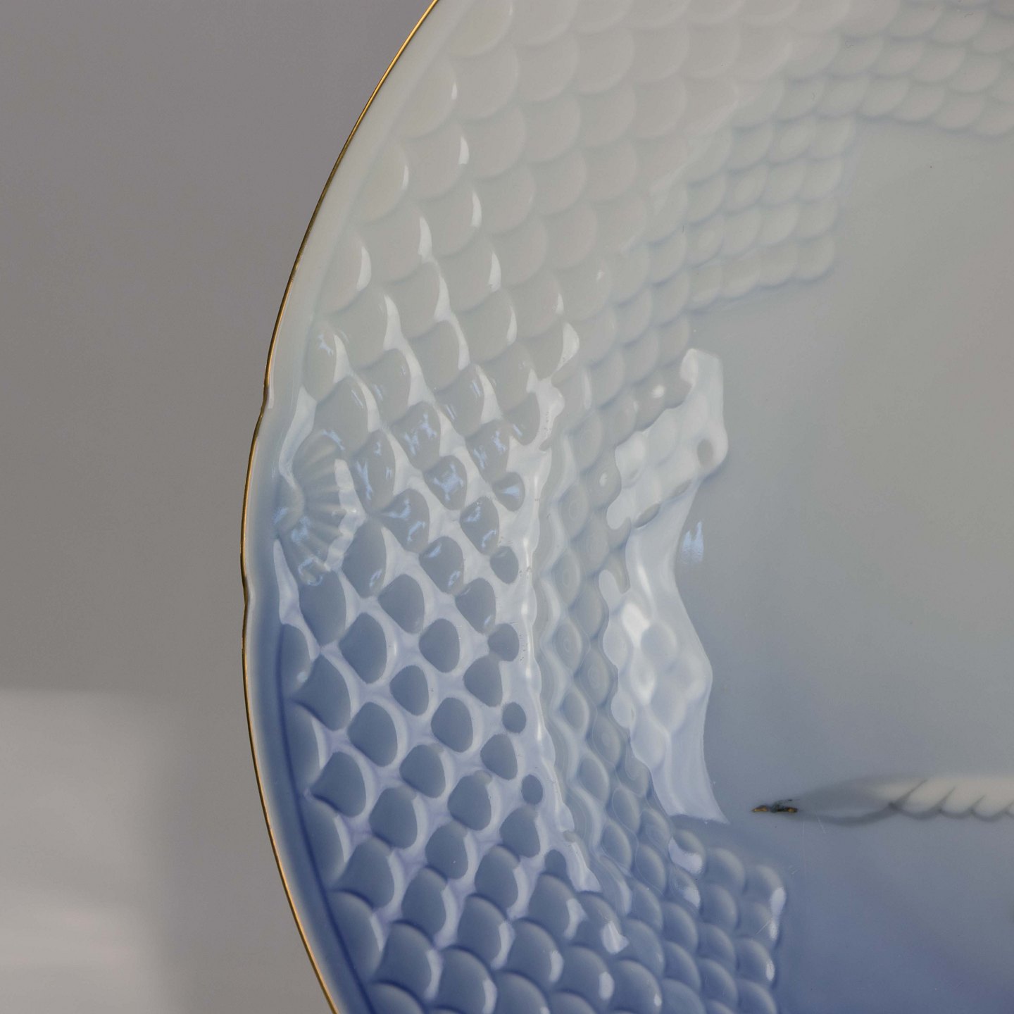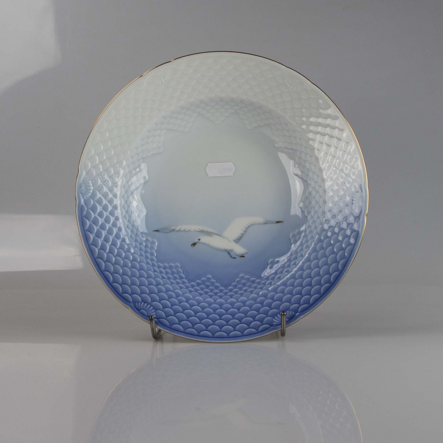 Tallerken fremstillet i porcelæn med skelform i gradueret blå nuancer med guldkant samt motiv af måge.