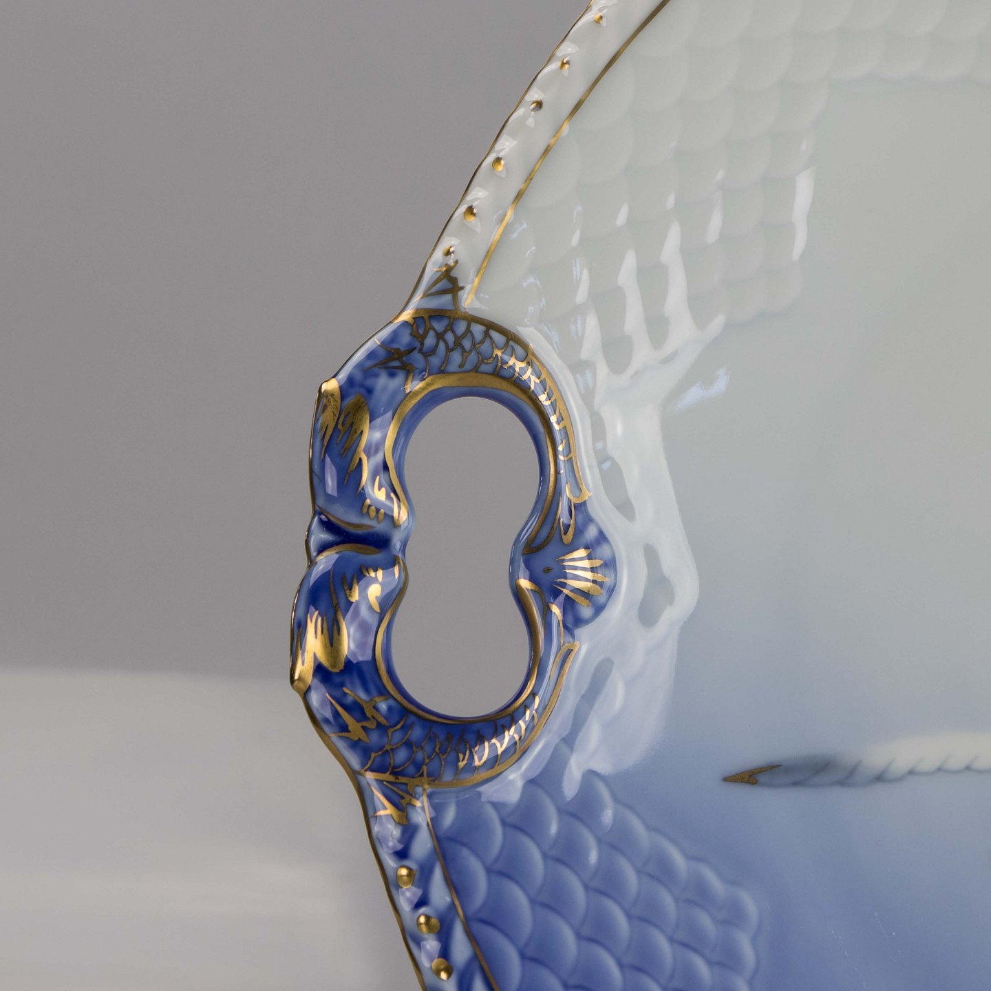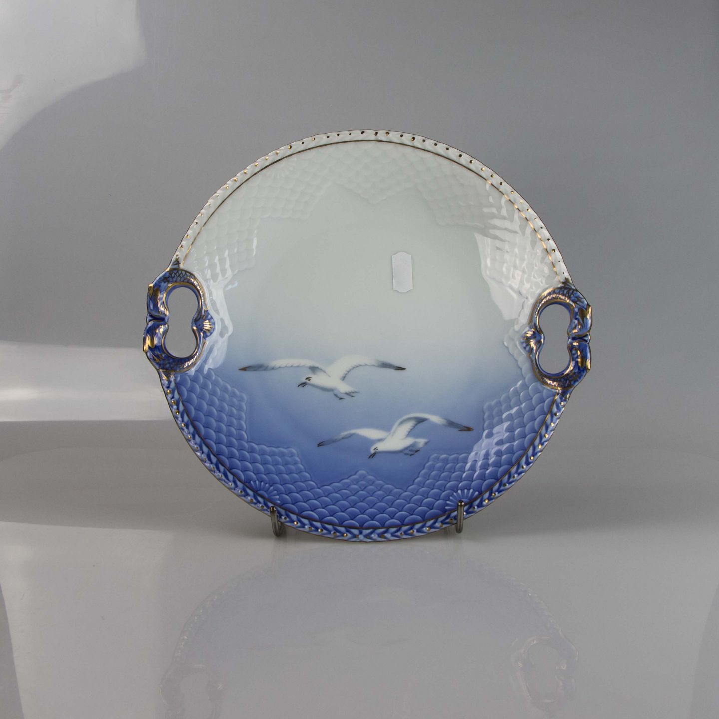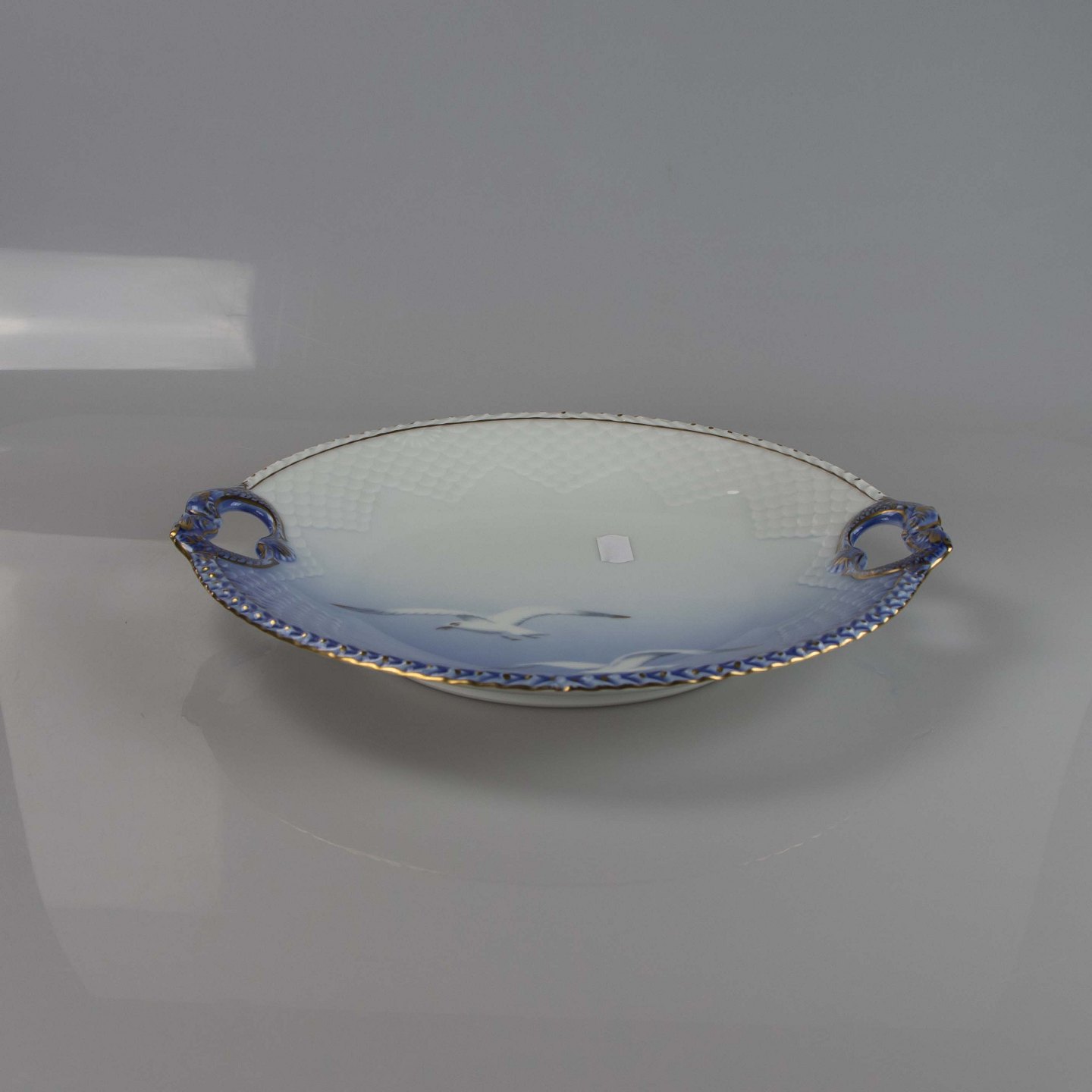 Fad fremstillet i porcelæn med skelform i gradueret blå nuancer med guldkant samt motiv af måge.
