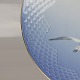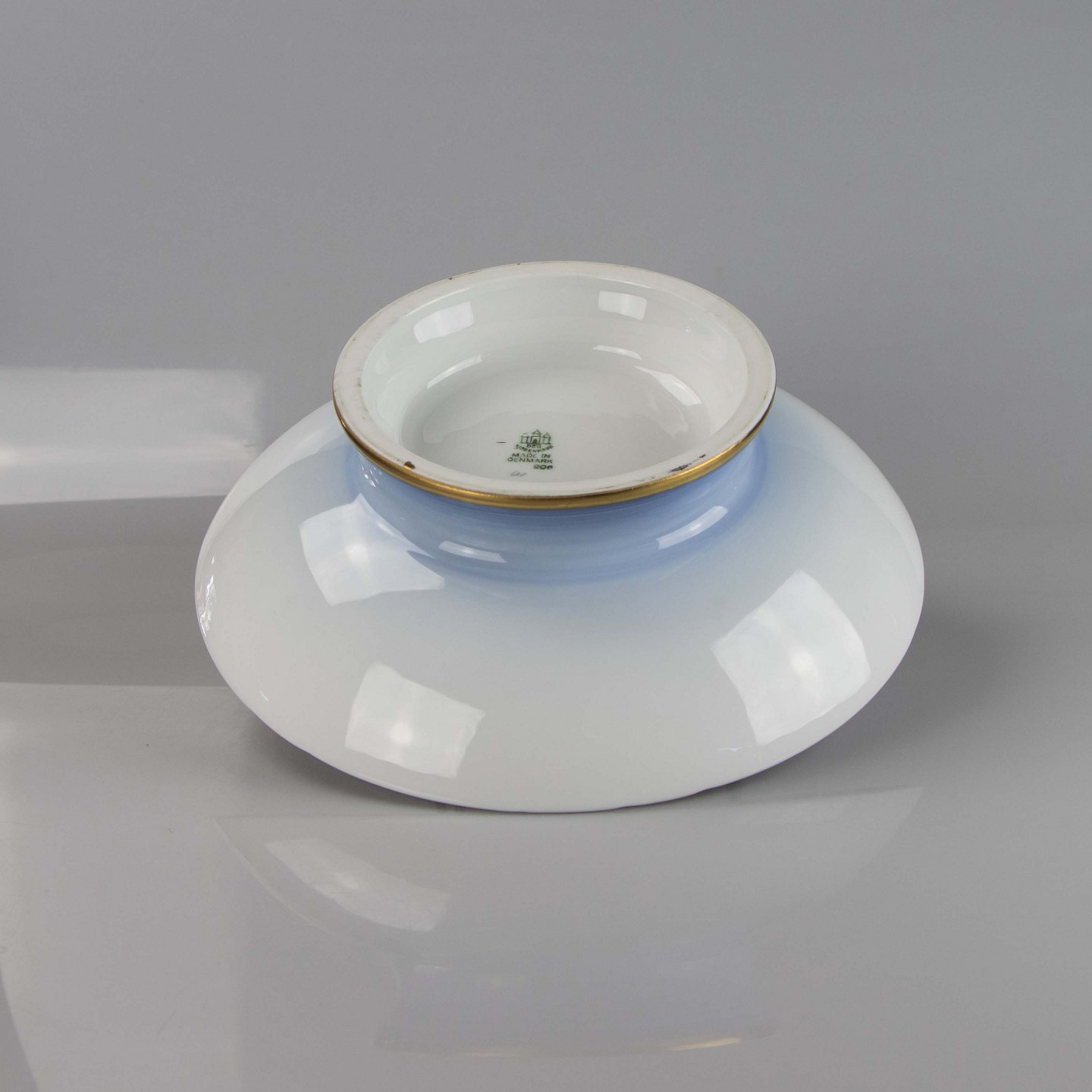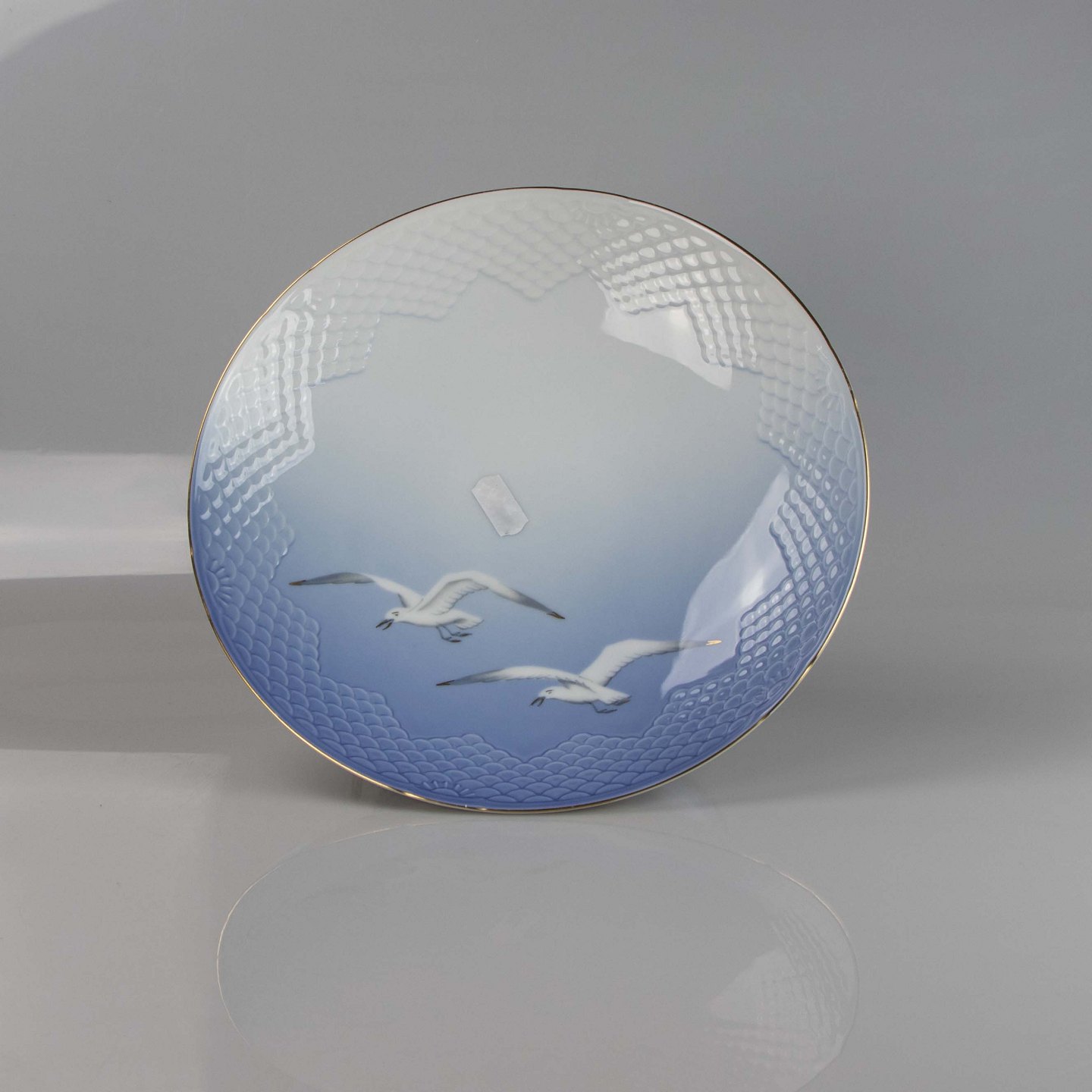 Fad fremstillet i porcelæn med skelform i gradueret blå nuancer med guldkant samt motiv af måge.