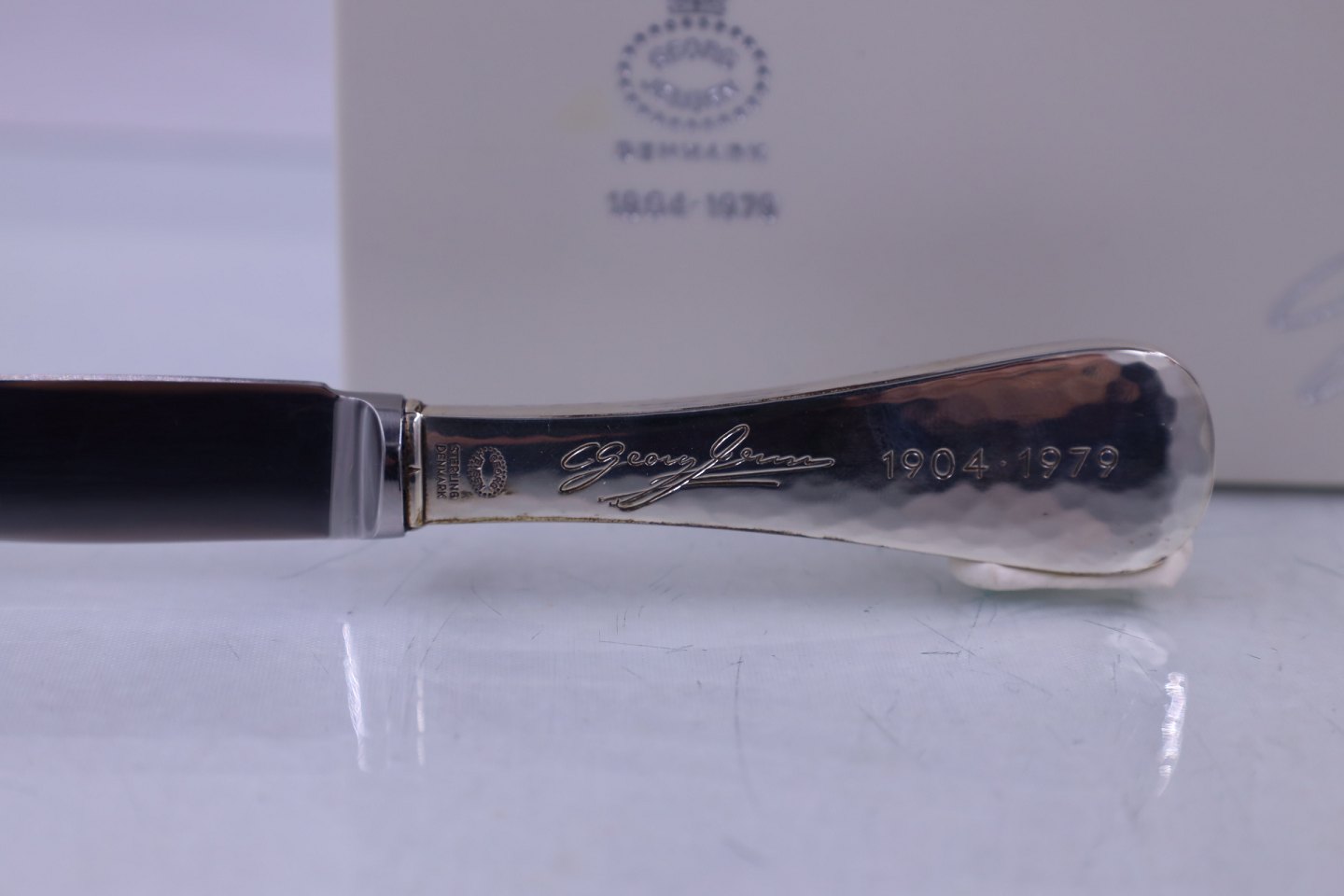 Georg Jensen, Jubilæumsske 1904-1979. Skeen er af sterling sølv. Skeen har en carneolsten som indfatning og er let hammerslået. Skeen kommer i original æske