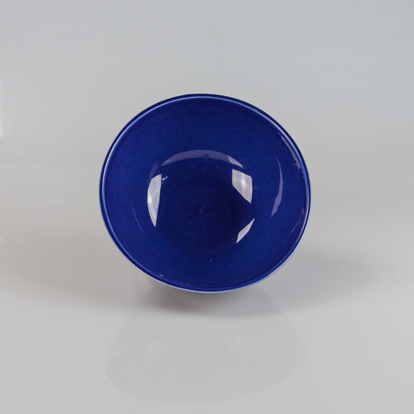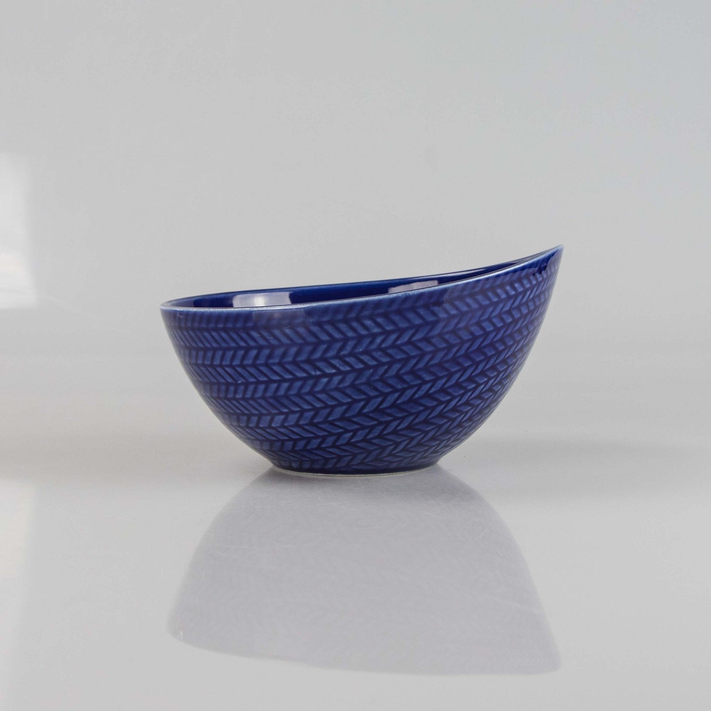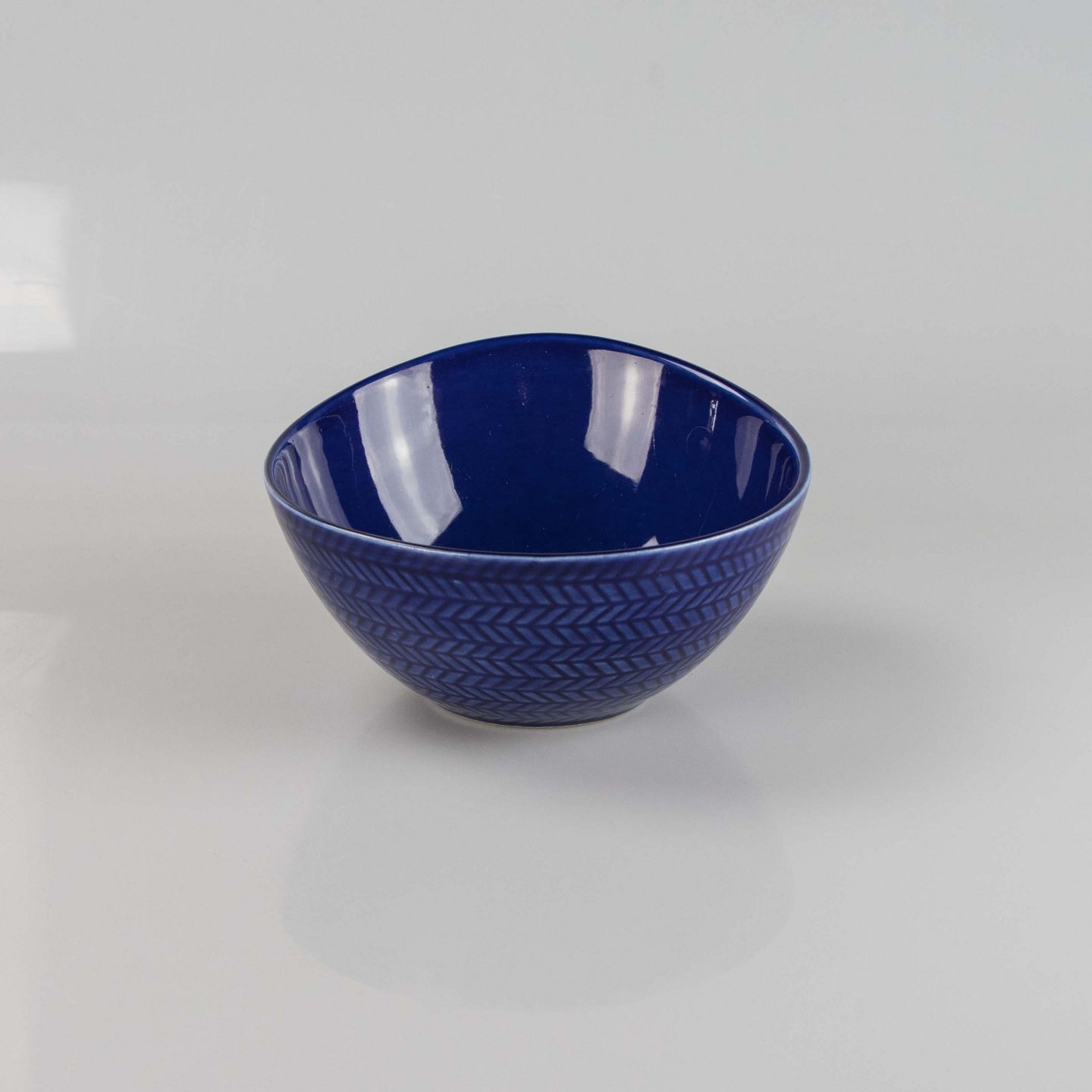 Skål fremstillet i blå fajance med indstøbt sildebensmønster.
