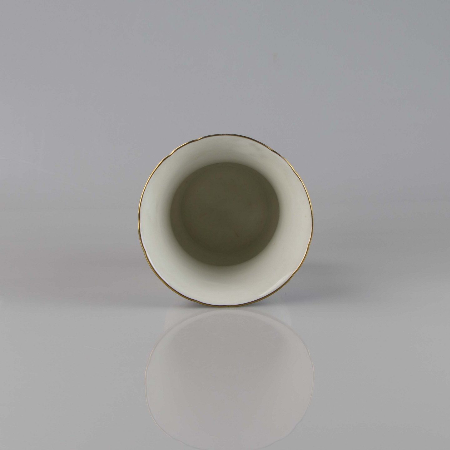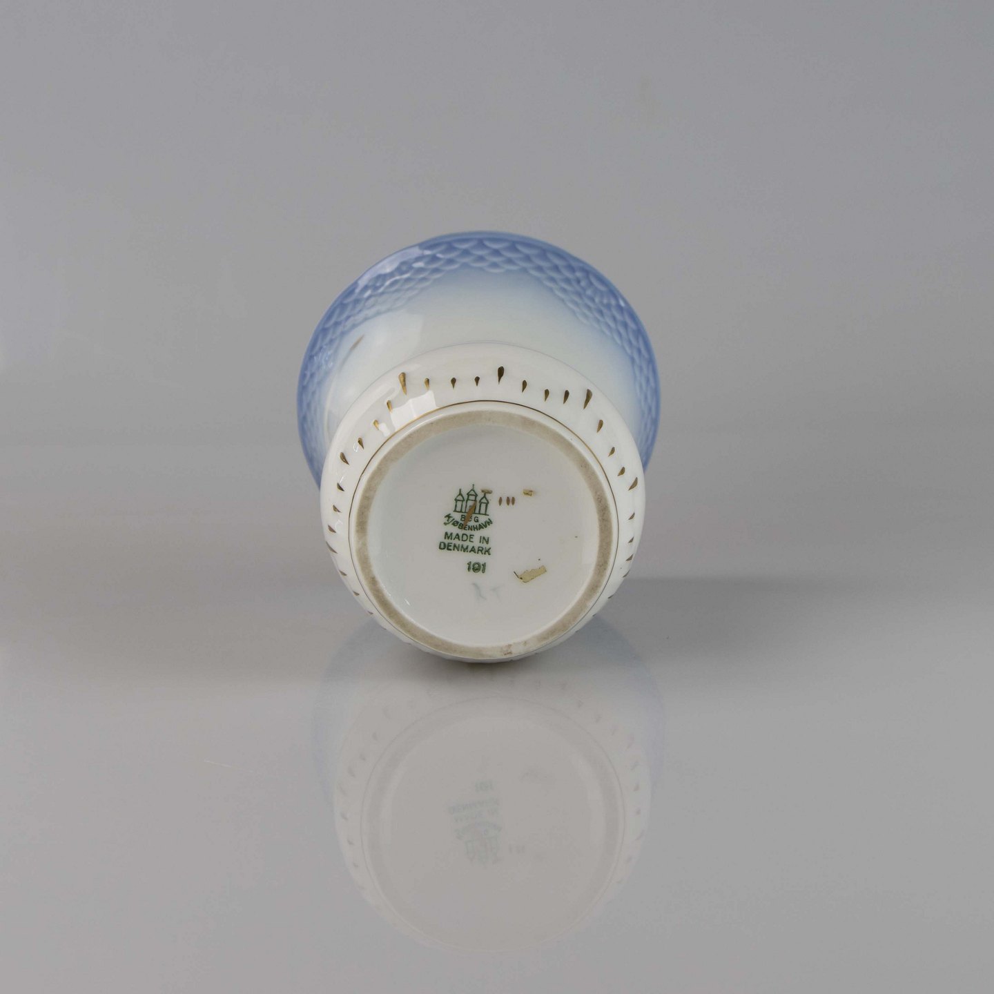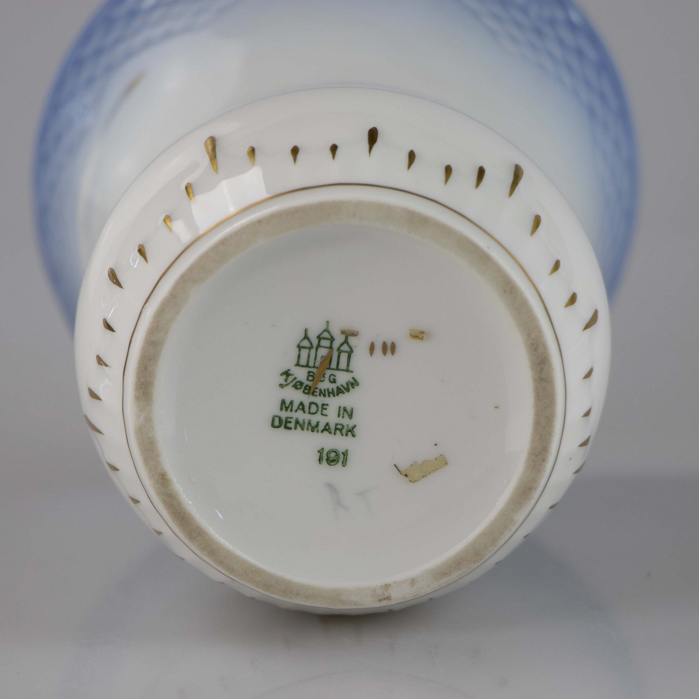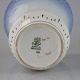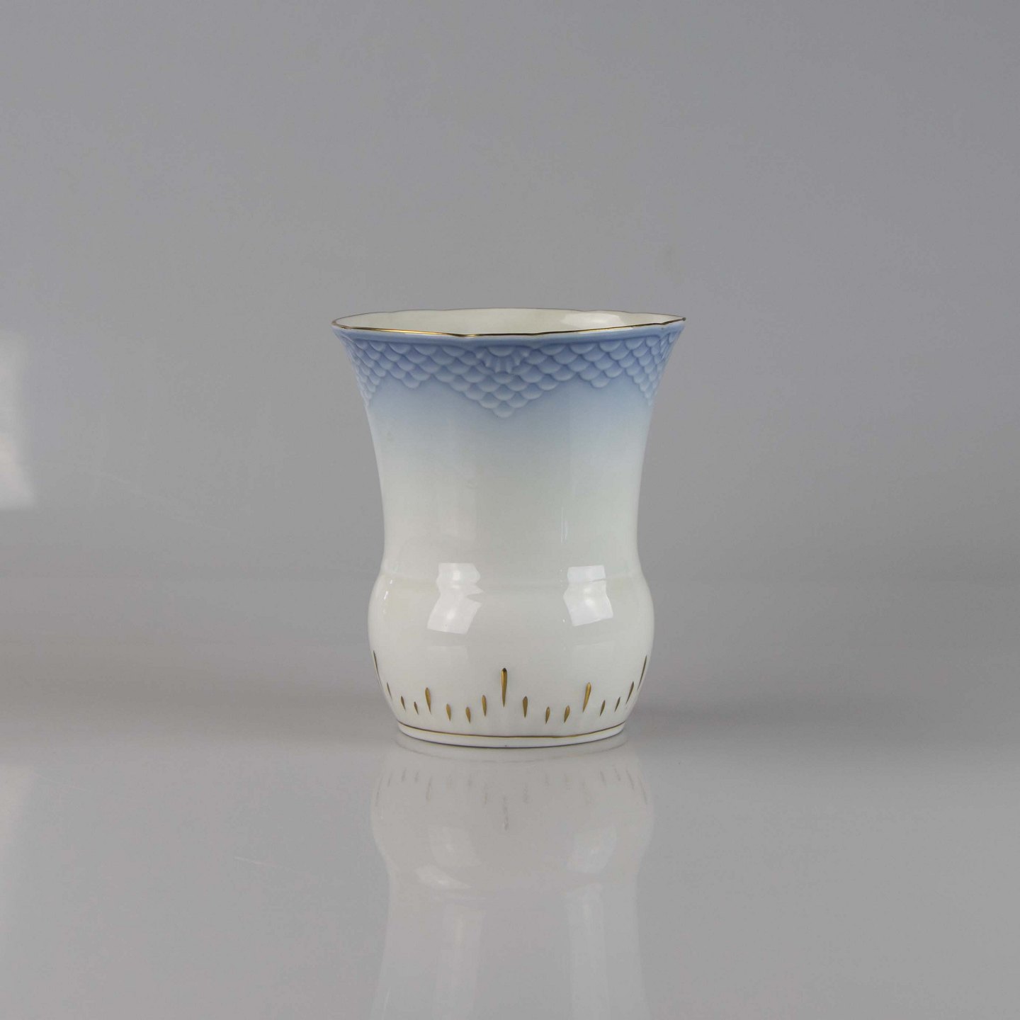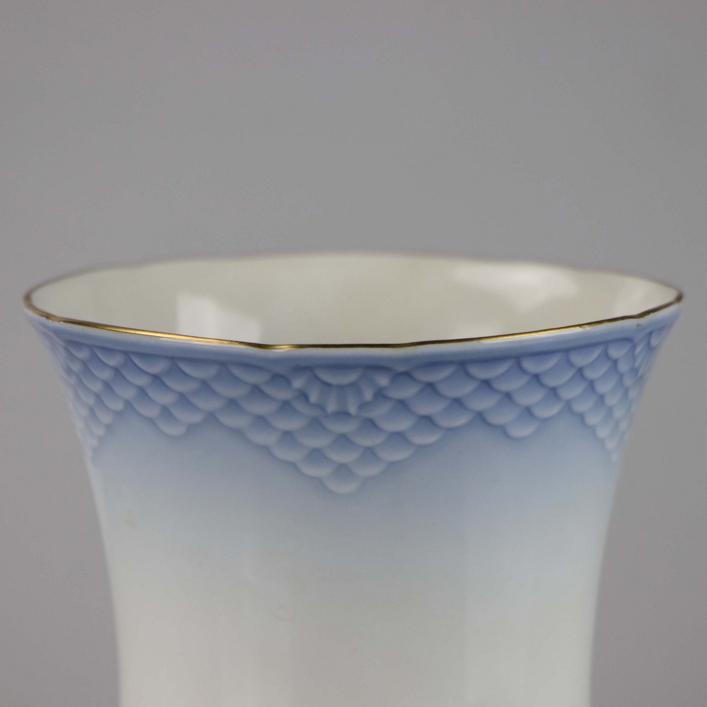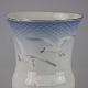Vase fremstillet i porcelæn med skelform i gradueret blå nuancer med guldkant samt motiv af måge.