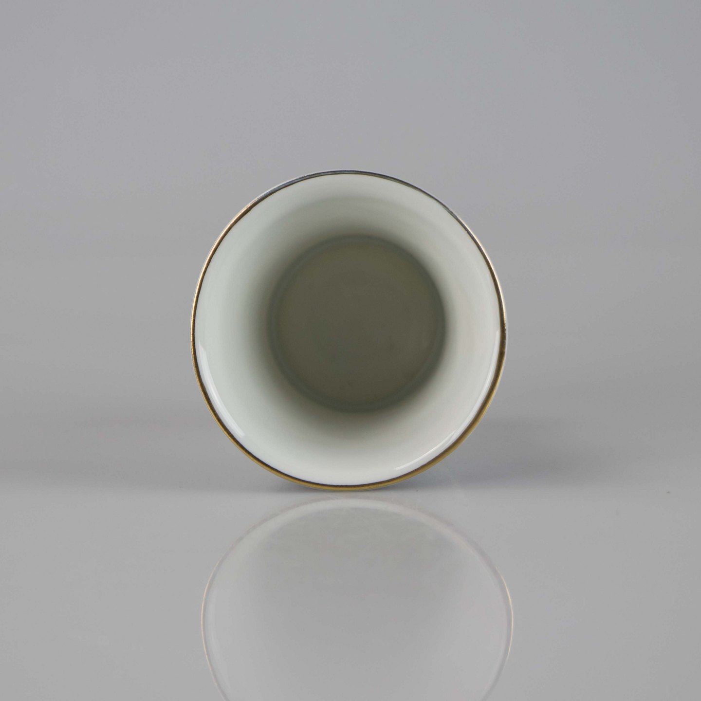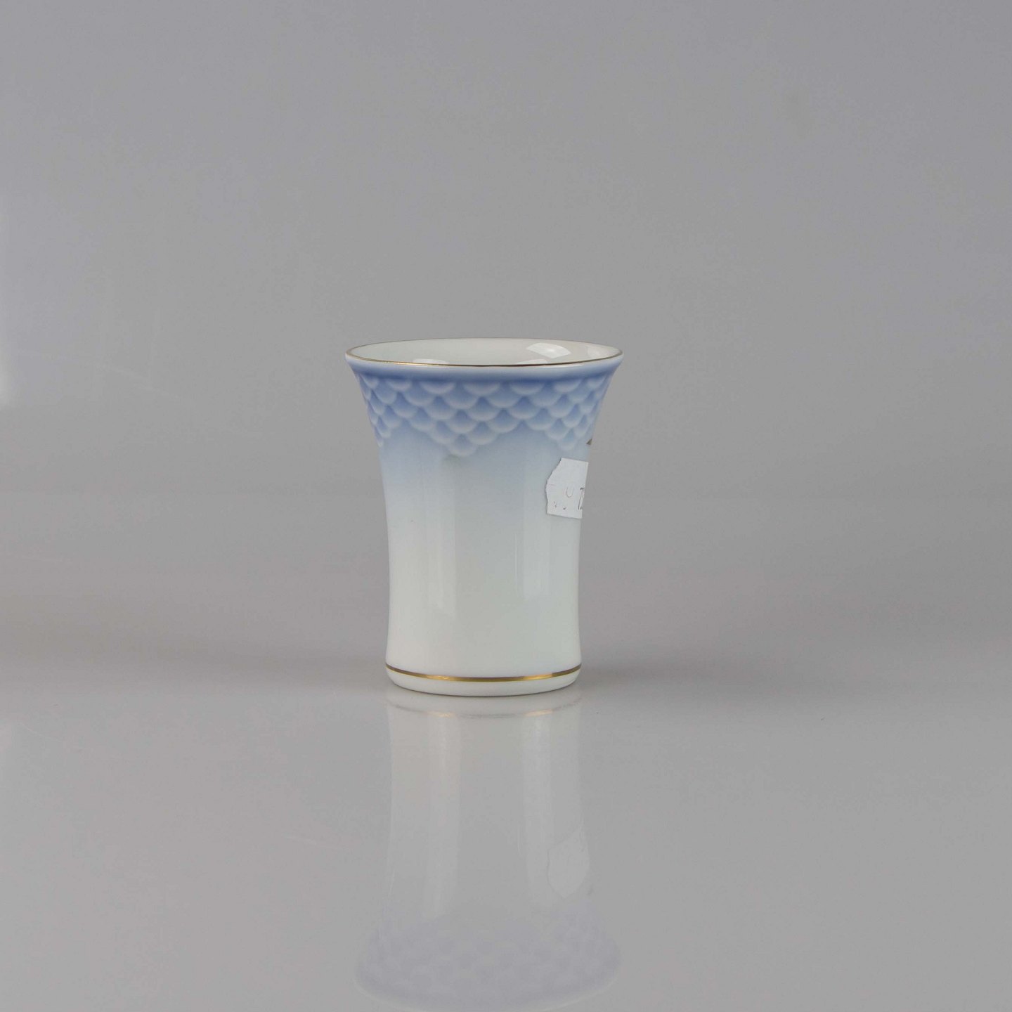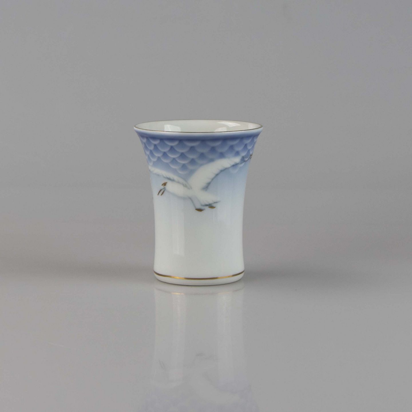 Vase fremstillet i porcelæn med skelform i gradueret blå nuancer med guldkant samt motiv af måge.