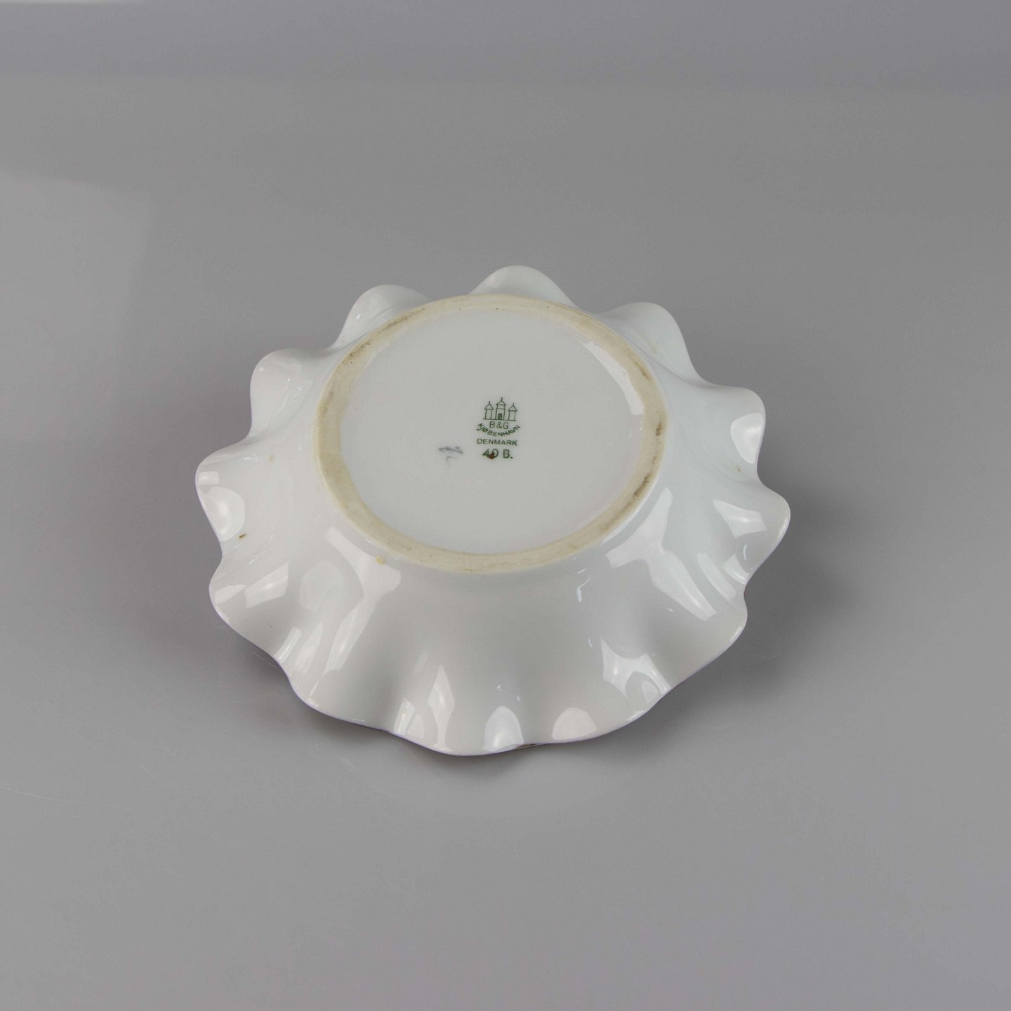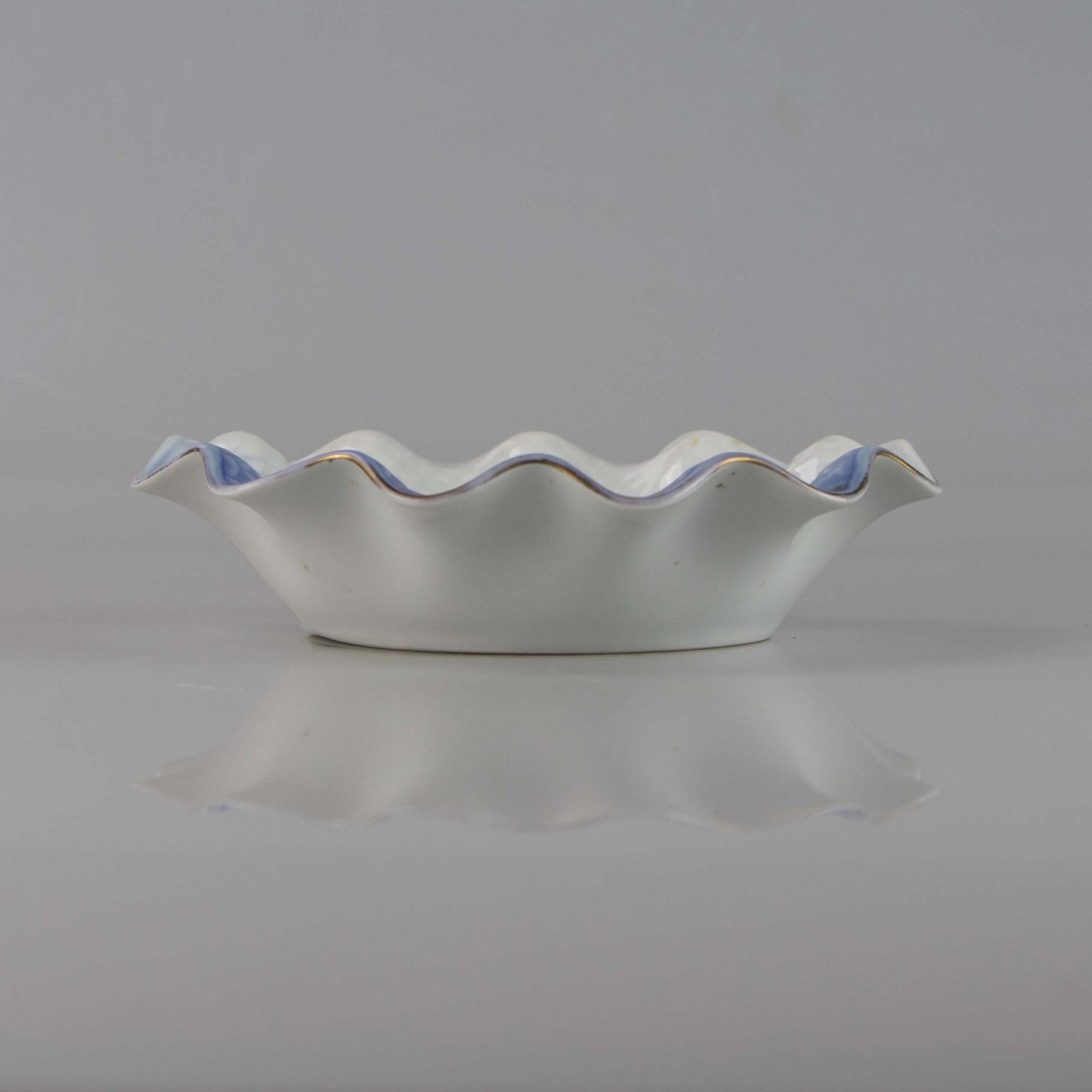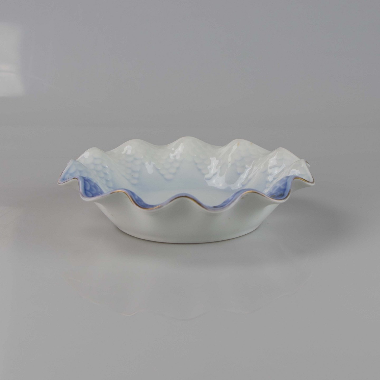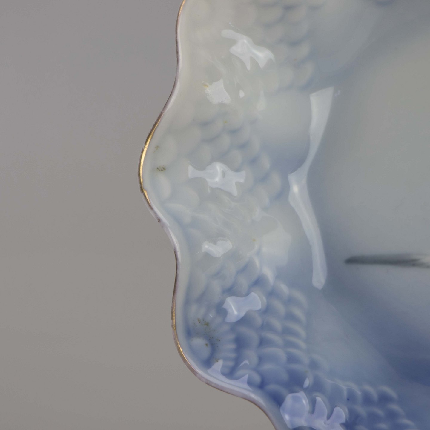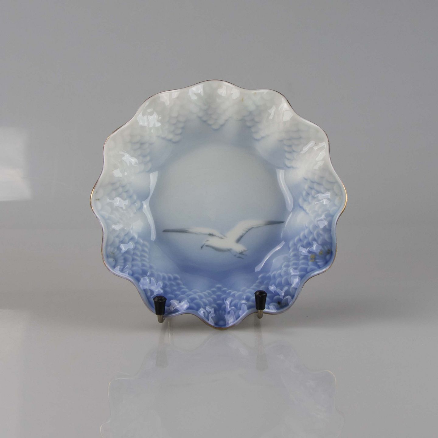 Asiet fremstillet i porcelæn med skelform i gradueret blå nuancer med guldkant samt motiv af måge.