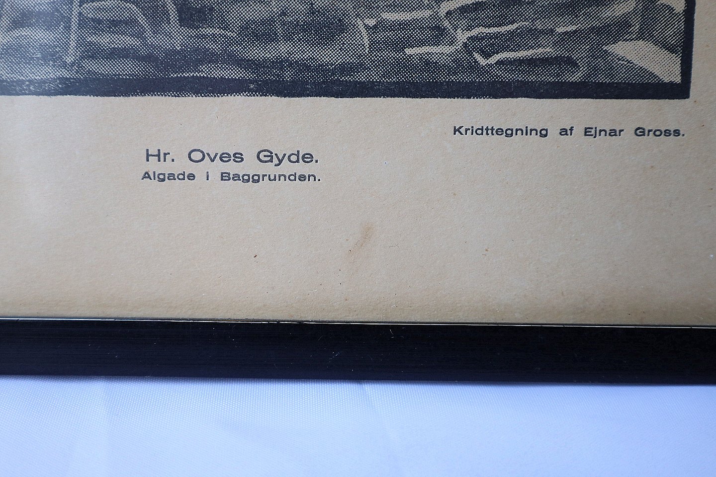 Illustrator Einar Gross (1895-1962). Parti af Hr. Oves Gyde, Aalborg, Gyde blev nedlagt 1950, Algade ses i baggrunden. Billedet er et tryk af kridttegning