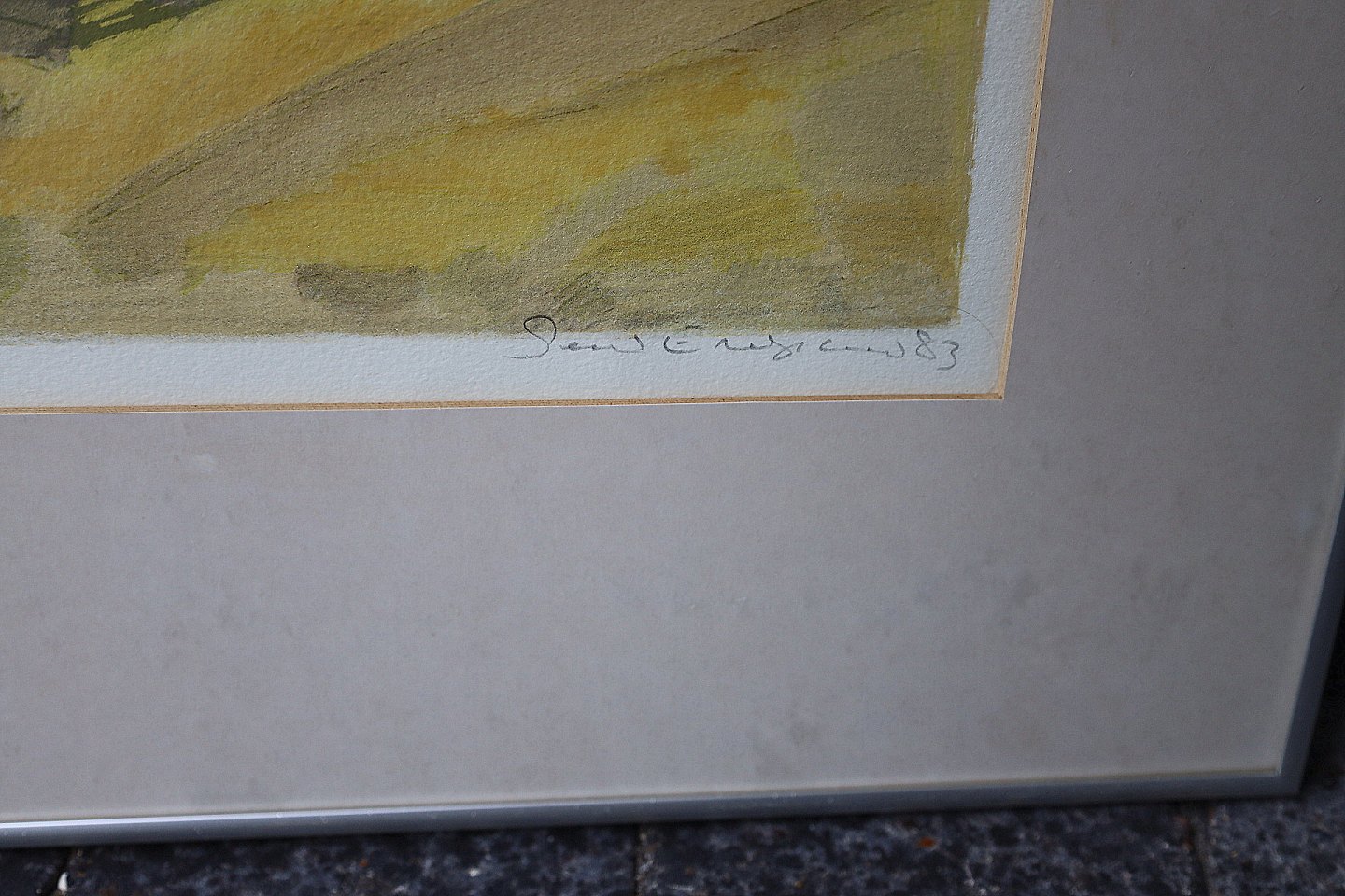 Svend Engelund, litografi nr. VII/XXX. Åbent landskab i lyse gule farver og grå/blå himmel.
